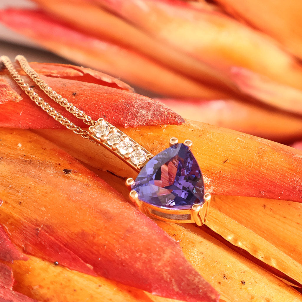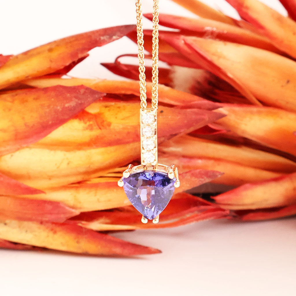 Mesmerising Trilliant Cut Tanzanite And Diamond Bale Rose Gold Pendant