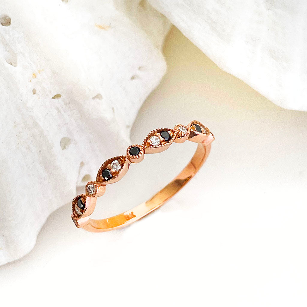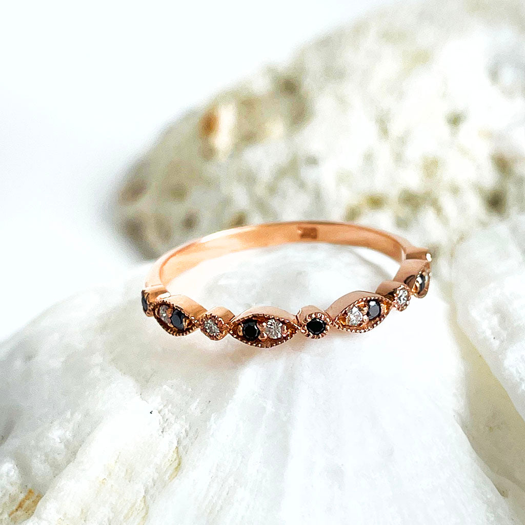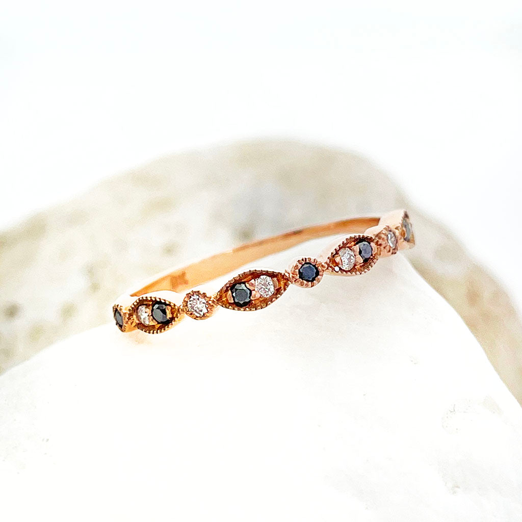 Milgrain Marquise and Dot Black and White Diamond Rose Gold band