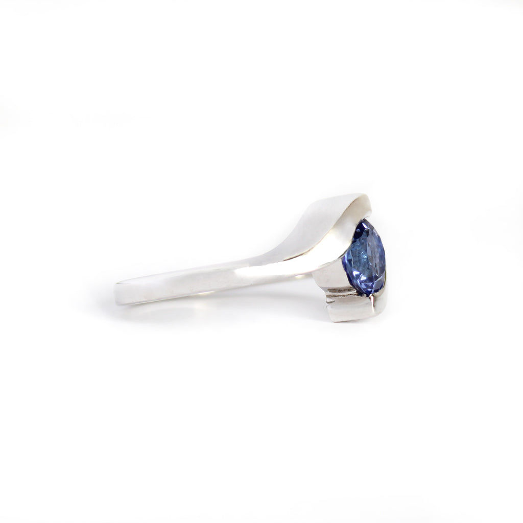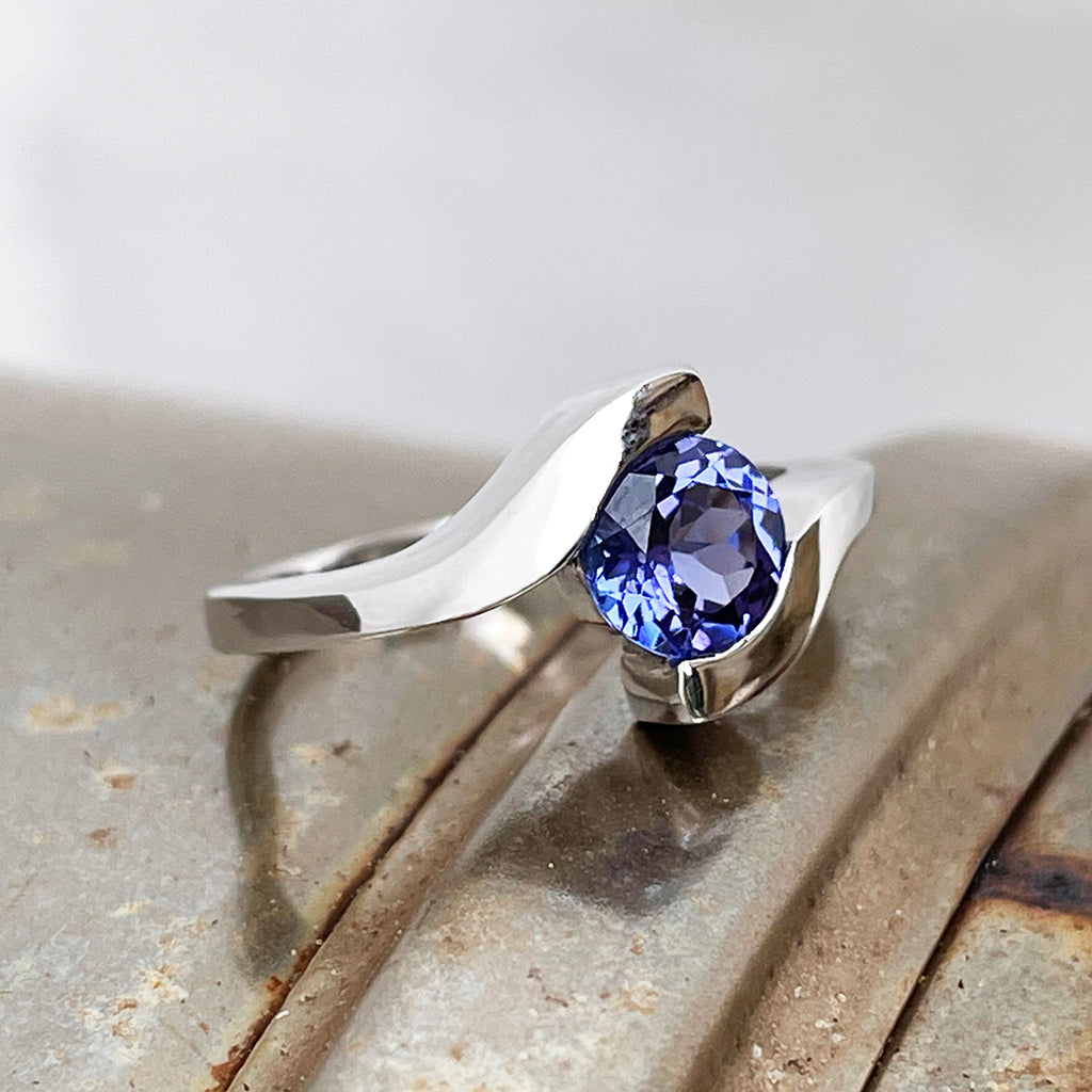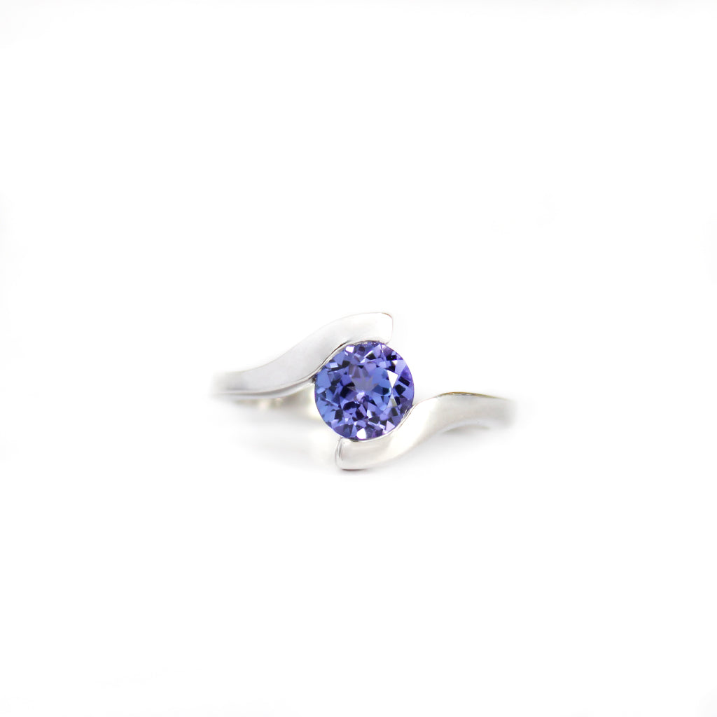 White gold embraces a round cut tanzanite like liquid lava in this molten hot ring design. The fervent blue-violet of tanzanite creates a passionate interplay of hues with the warmth of the white gold. This is a ring for a fiery soul who loves deeply and forever.