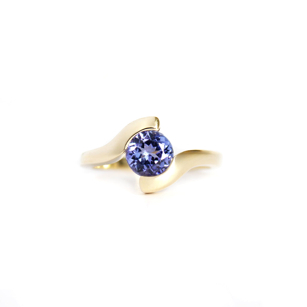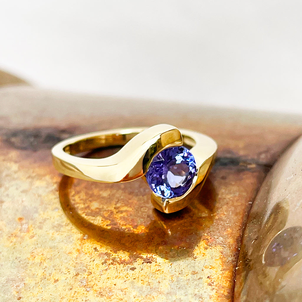 Yellow gold embraces a round cut tanzanite like liquid lava in this molten hot ring design. The fervent violet-blue of tanzanite creates a passionate interplay of hues with the warmth of the yellow gold. This is a ring for a fiery soul who loves deeply and forever.