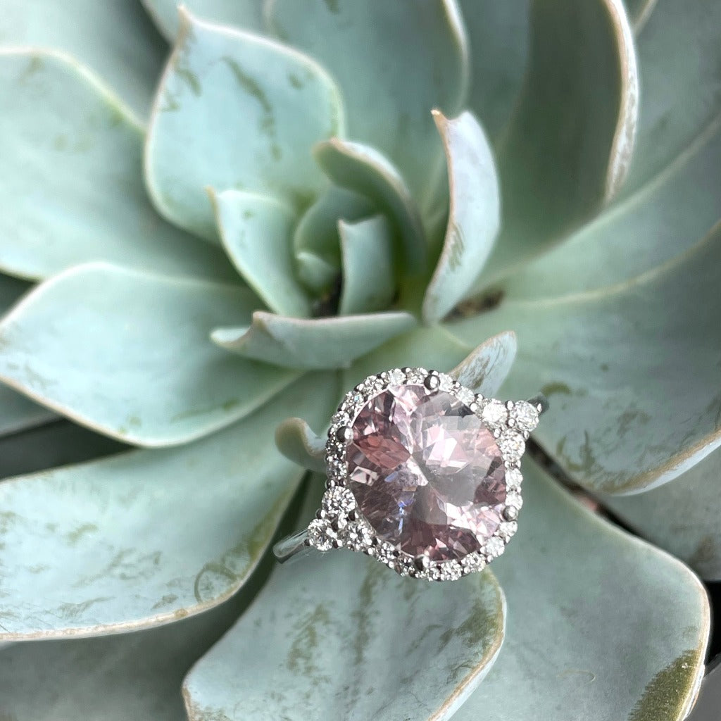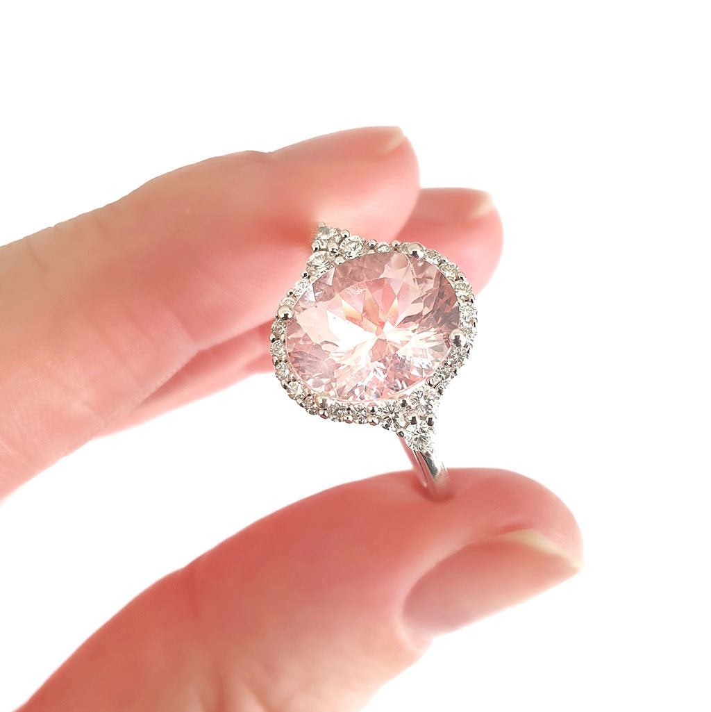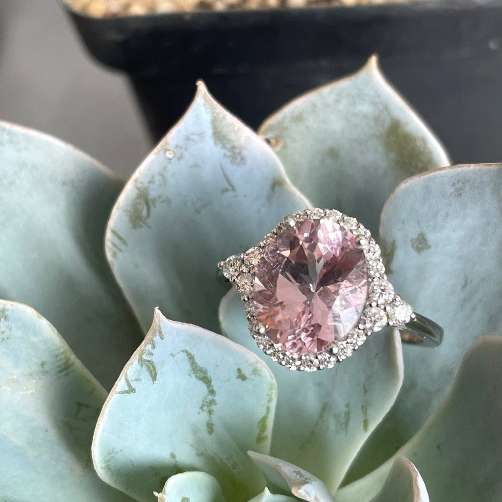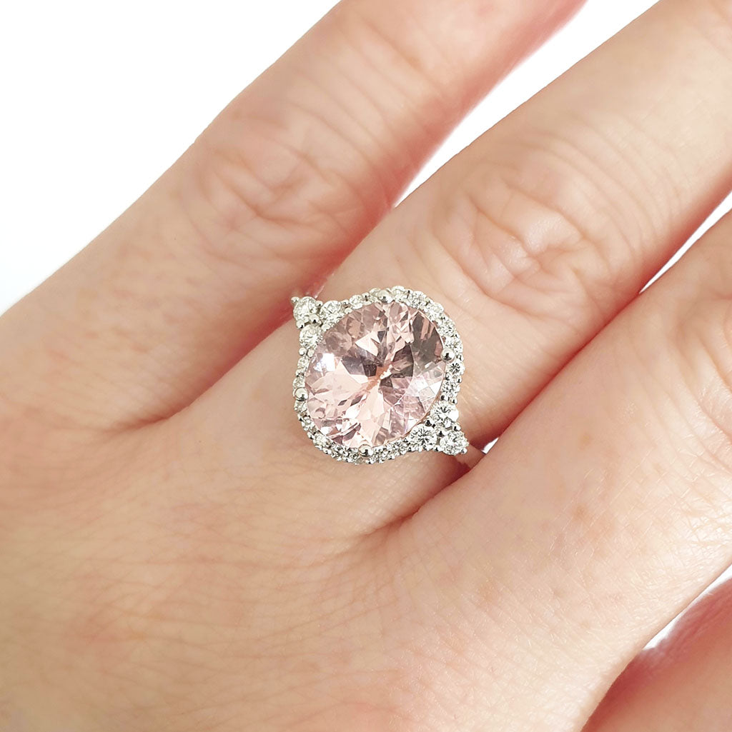 Diamond Halo Morganite Dress Ring With Trilogy Diamond Shoulder Highlight