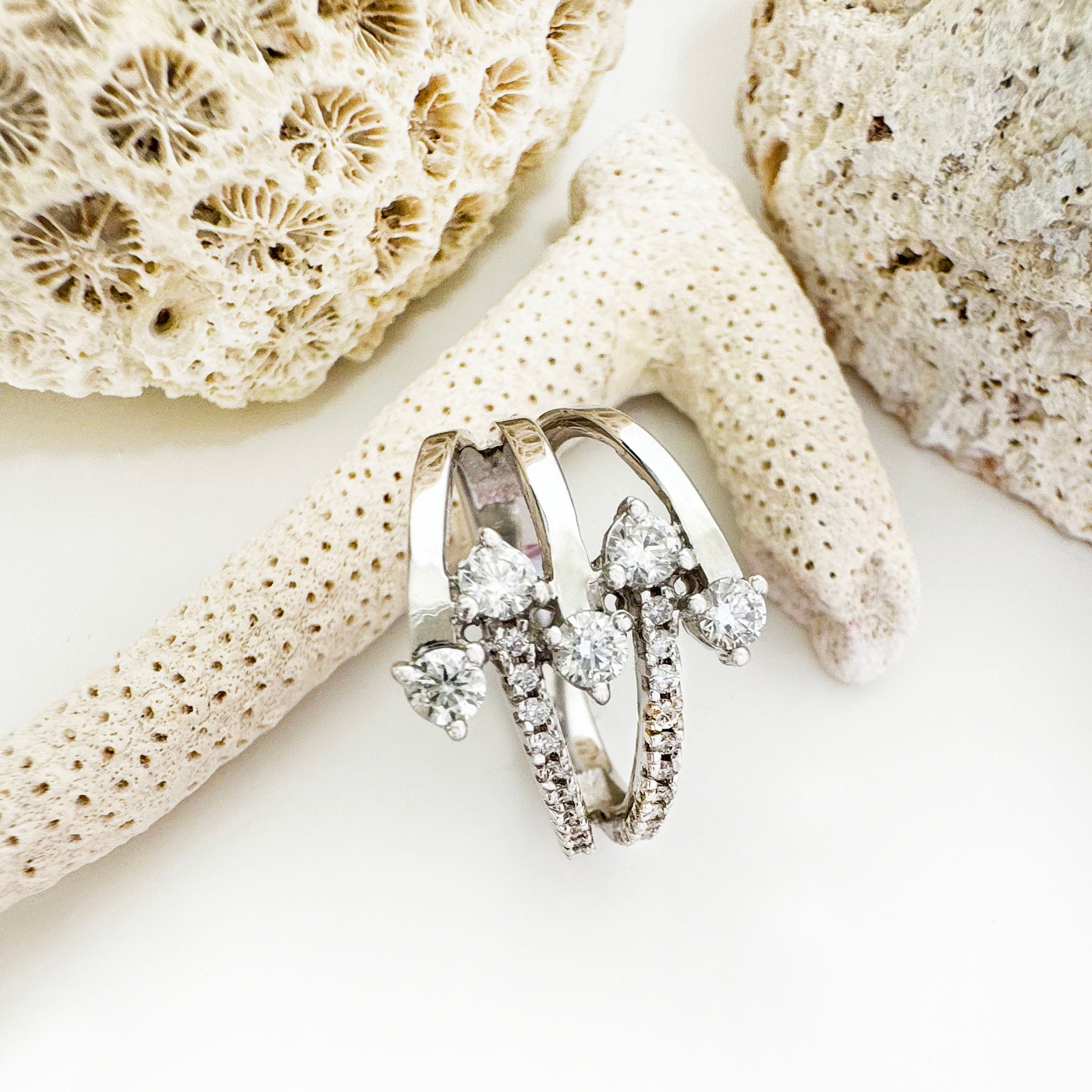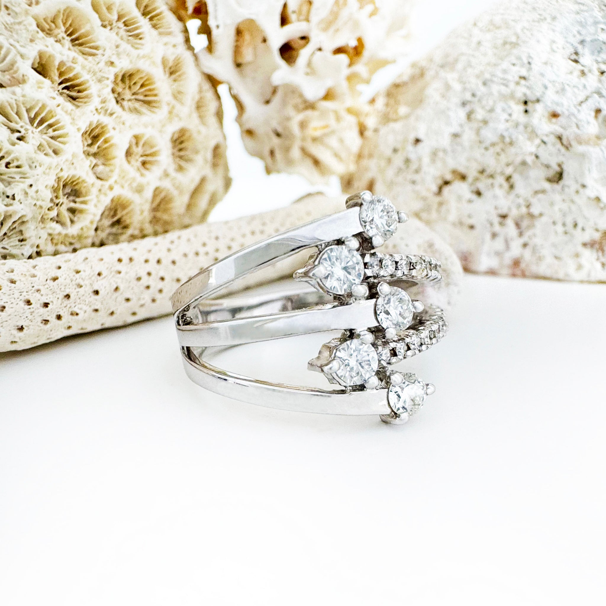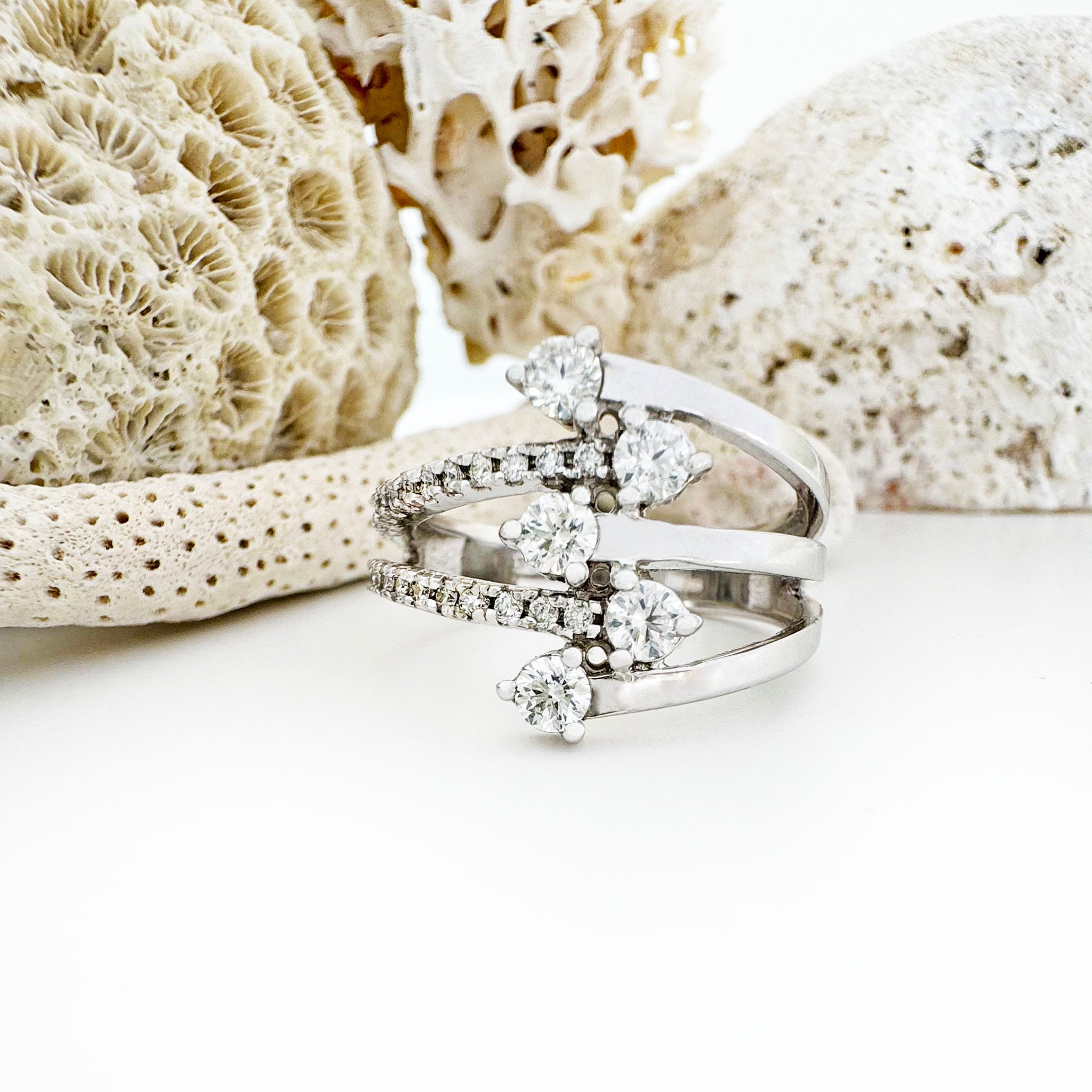 Provoke a style revolution with this mesmerising multi-band white gold and diamond ring, a true statement of sophistication and elegance. Five sleek white gold bands converge, each adorned with a brilliant round diamond at the crest. While two bands shimmer with pavé diamonds, the remaining three gleam in lustrous, polished white gold.