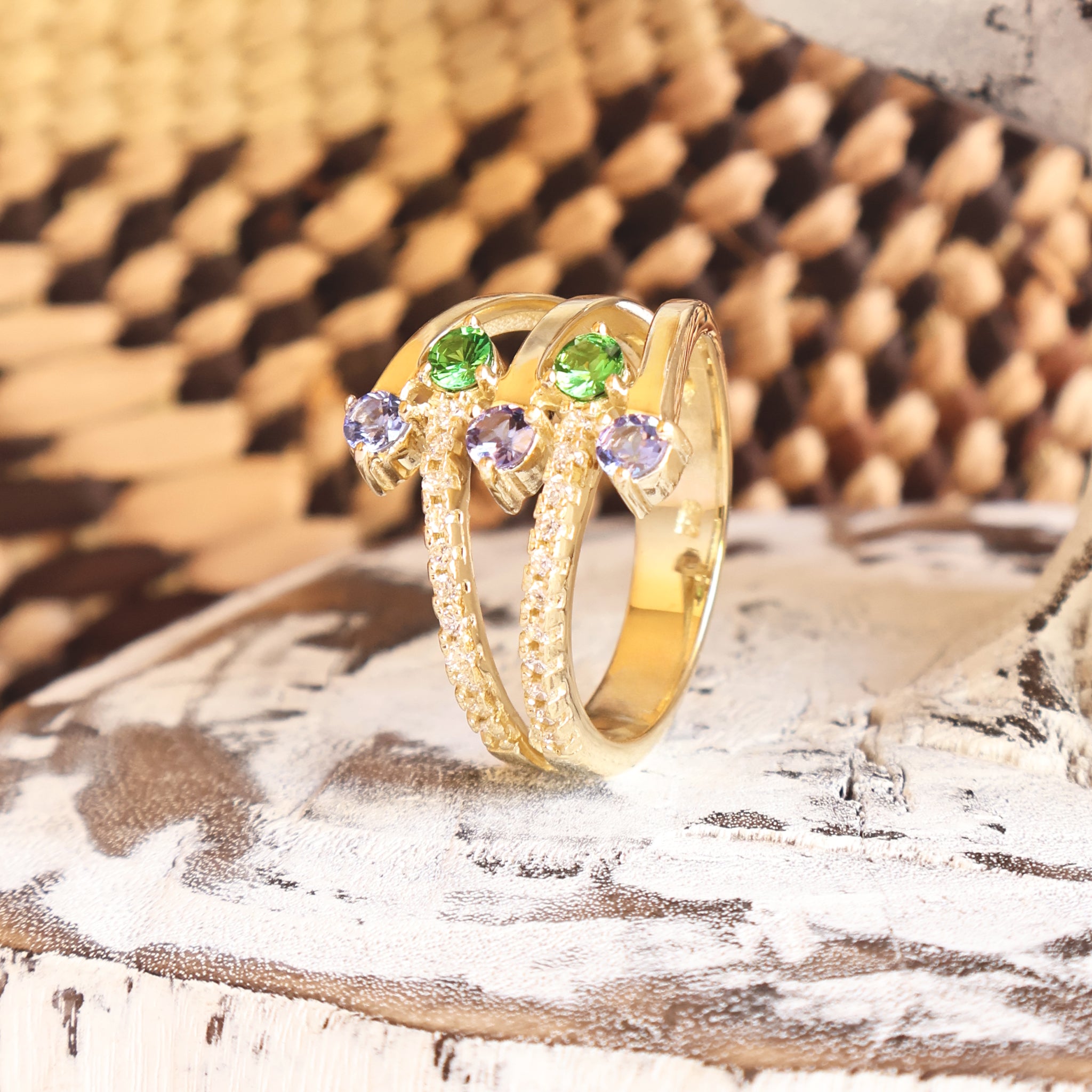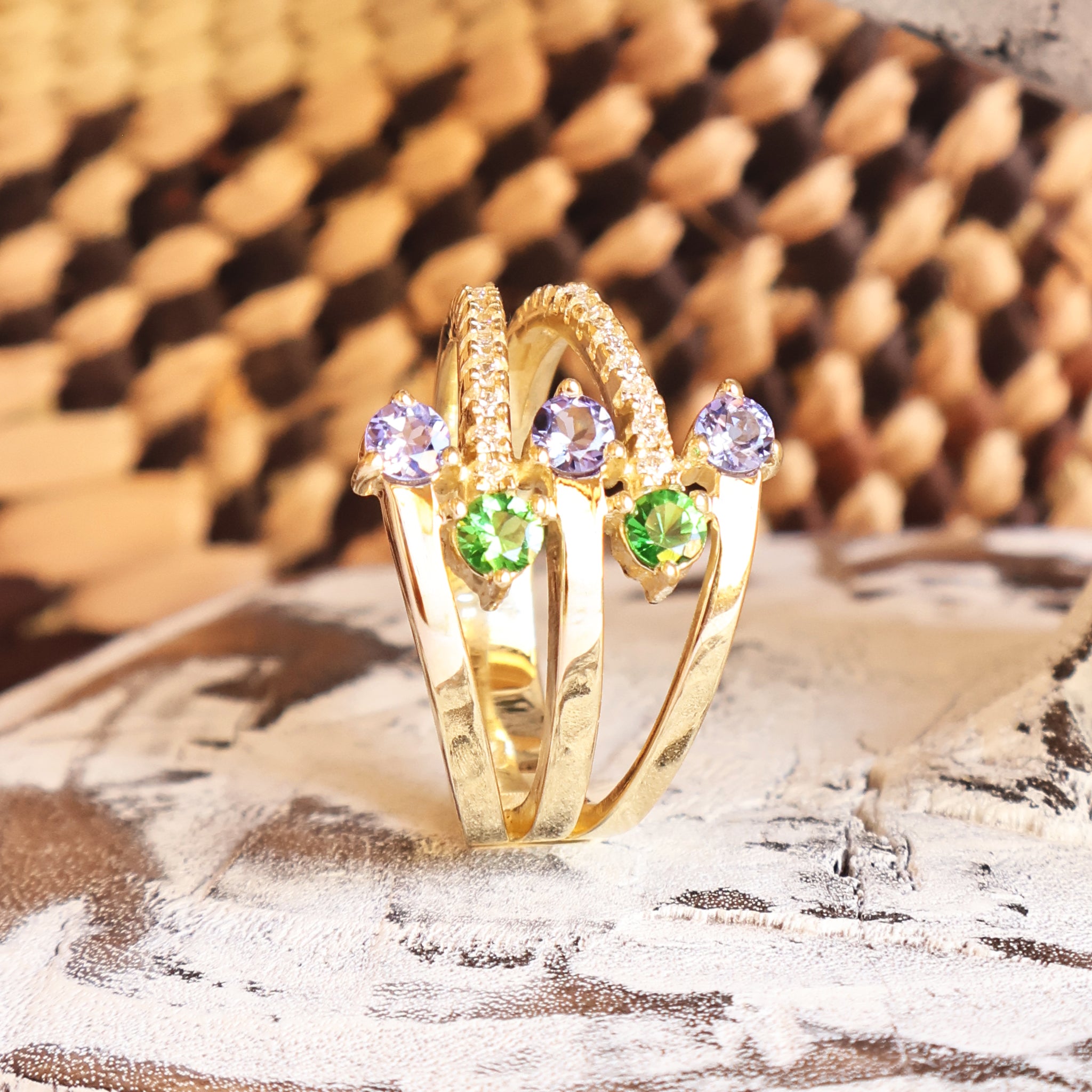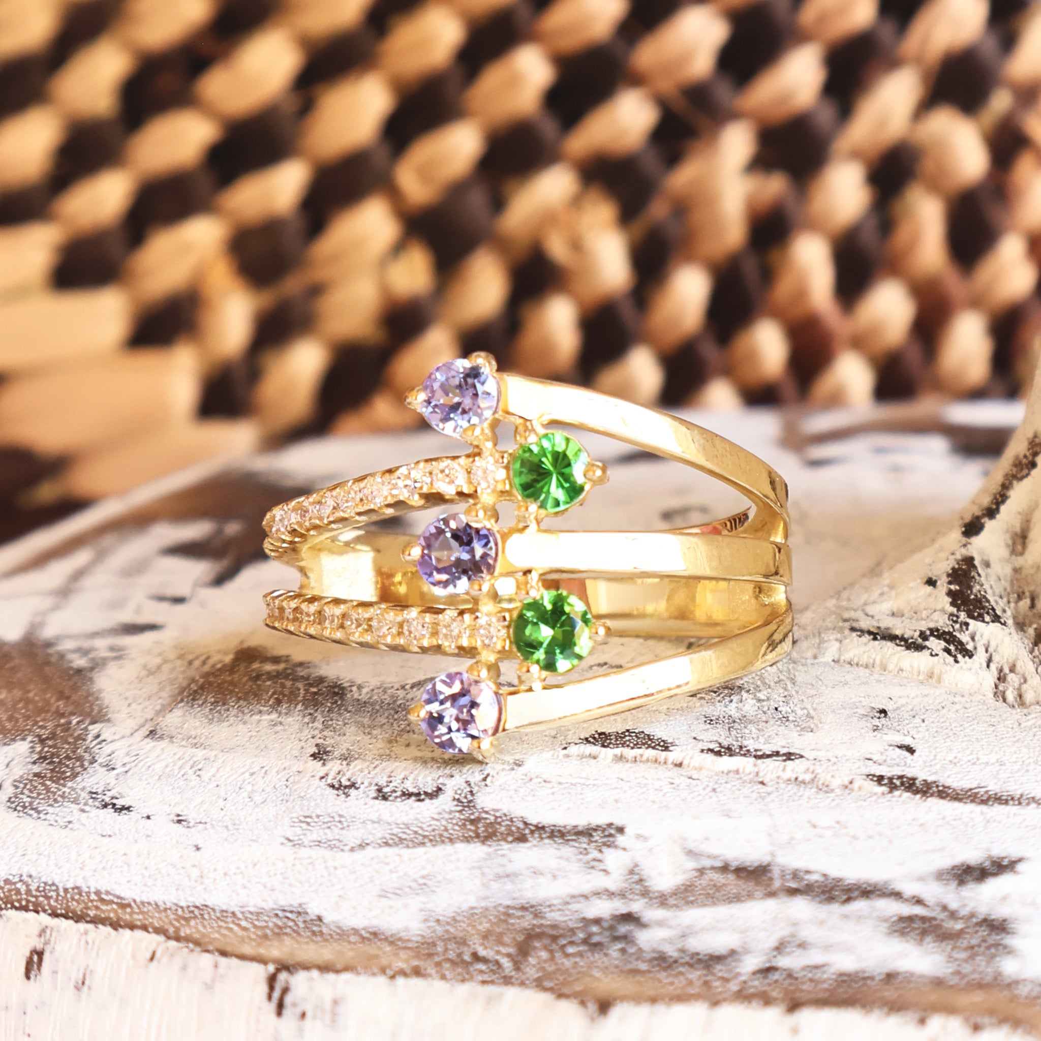 Multiband Tanzanite and Tsavorite Yellow Gold Ring