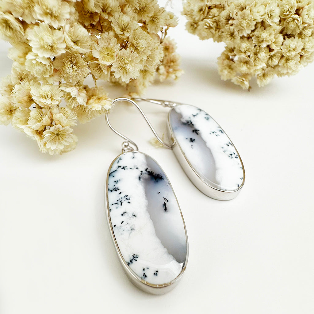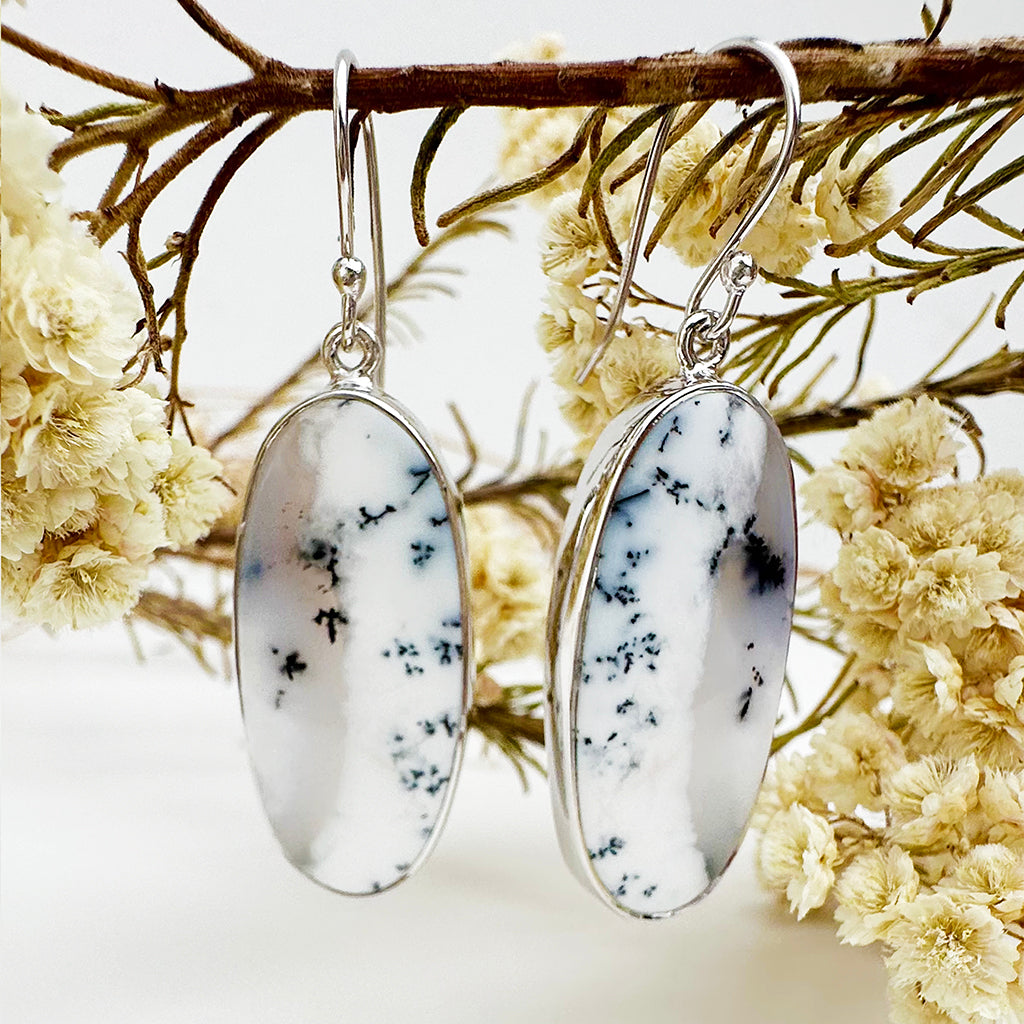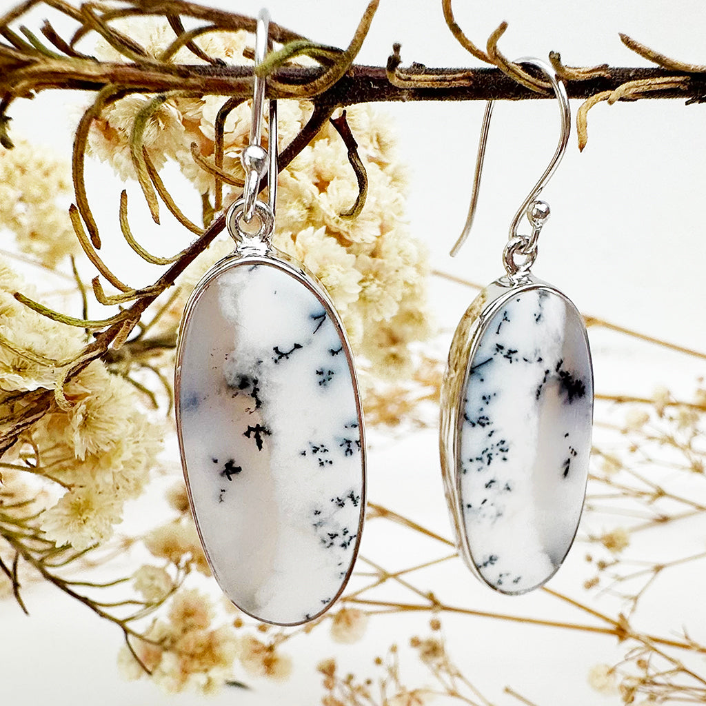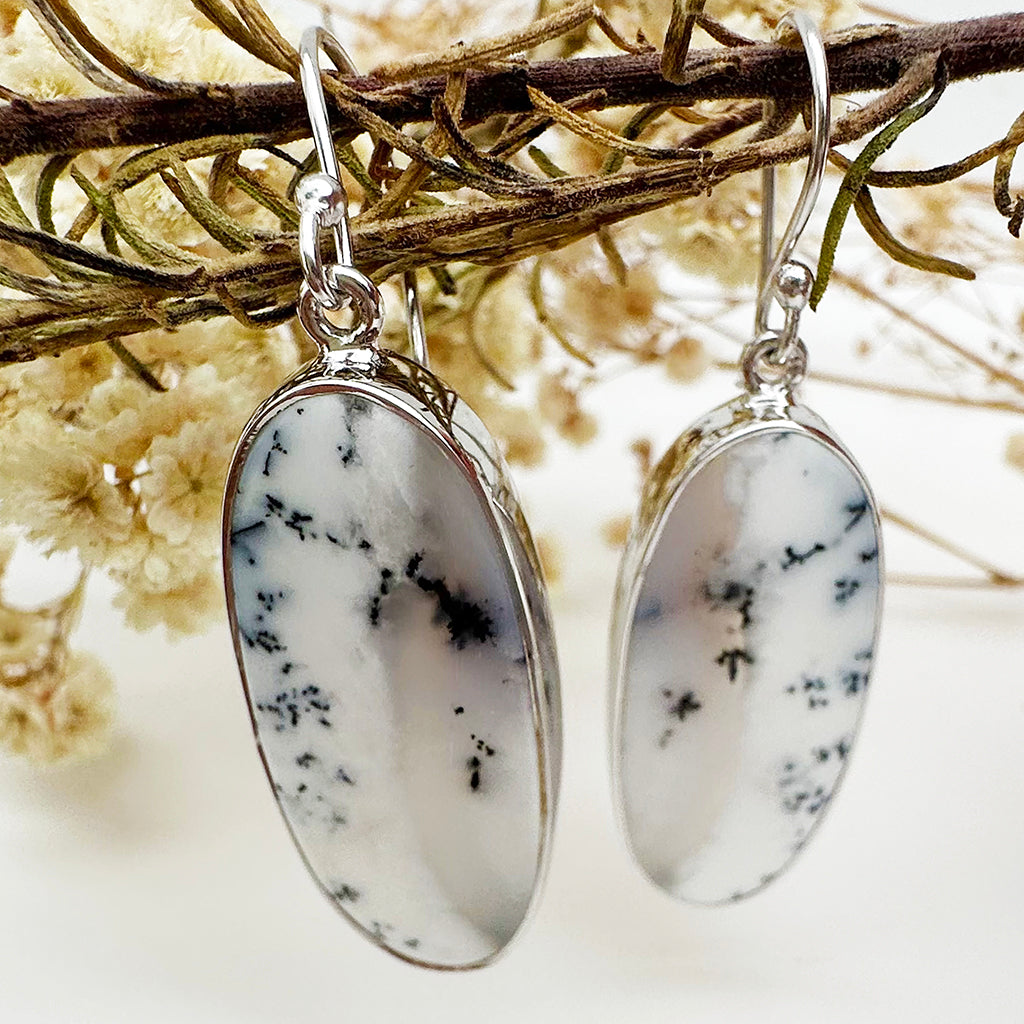Natural Freeform Elongated Oval Dendritic Agate Silver Drop Earrings - 33mm x 14mm