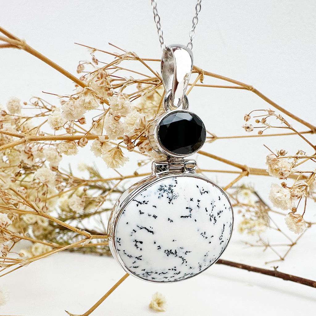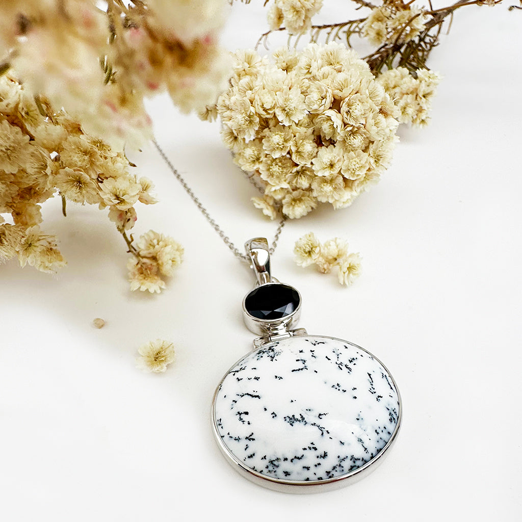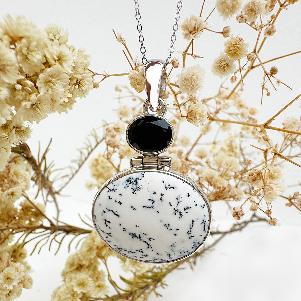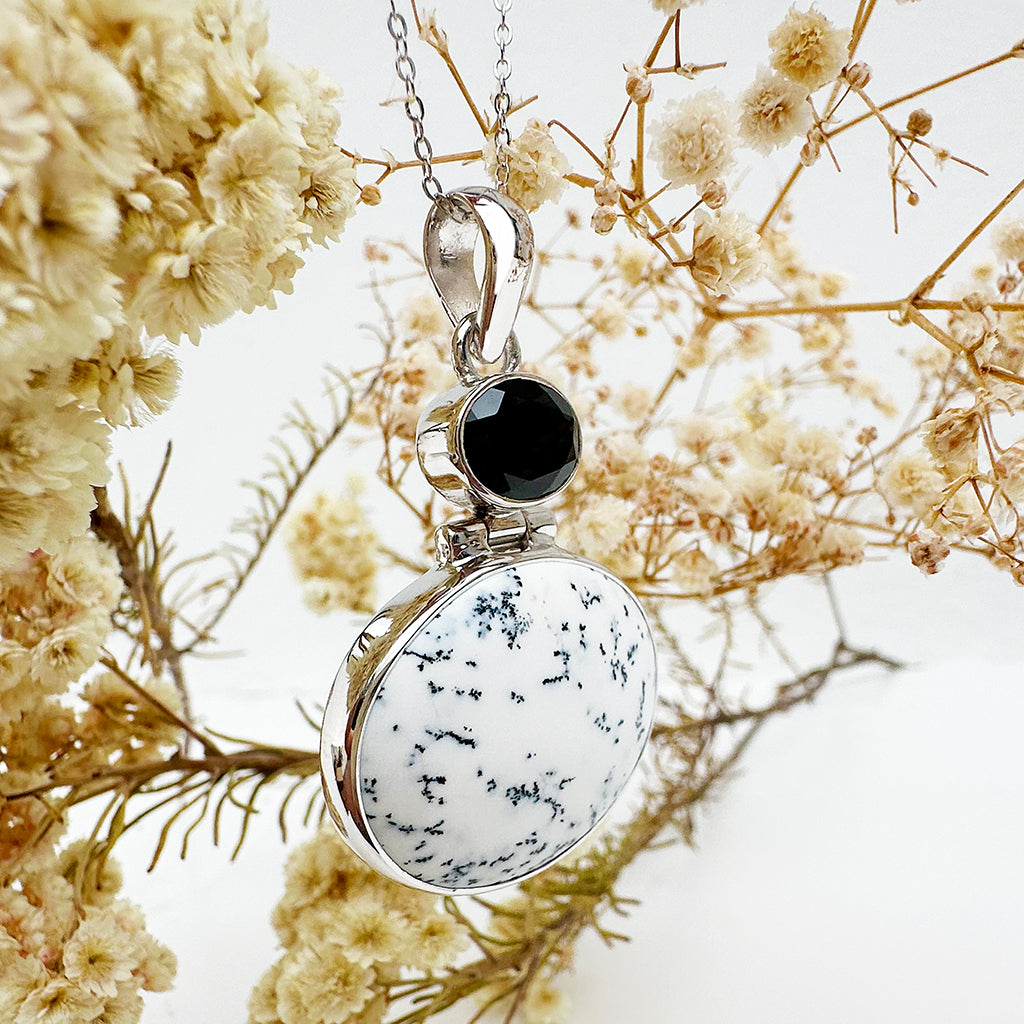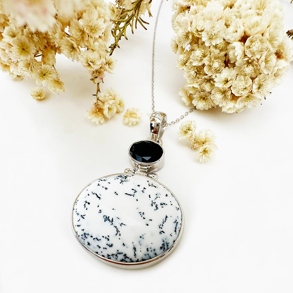 Natural Freeform Oval Dendritic Agate and Black Tourmaline Silver Pendant - 47mm x 30mm