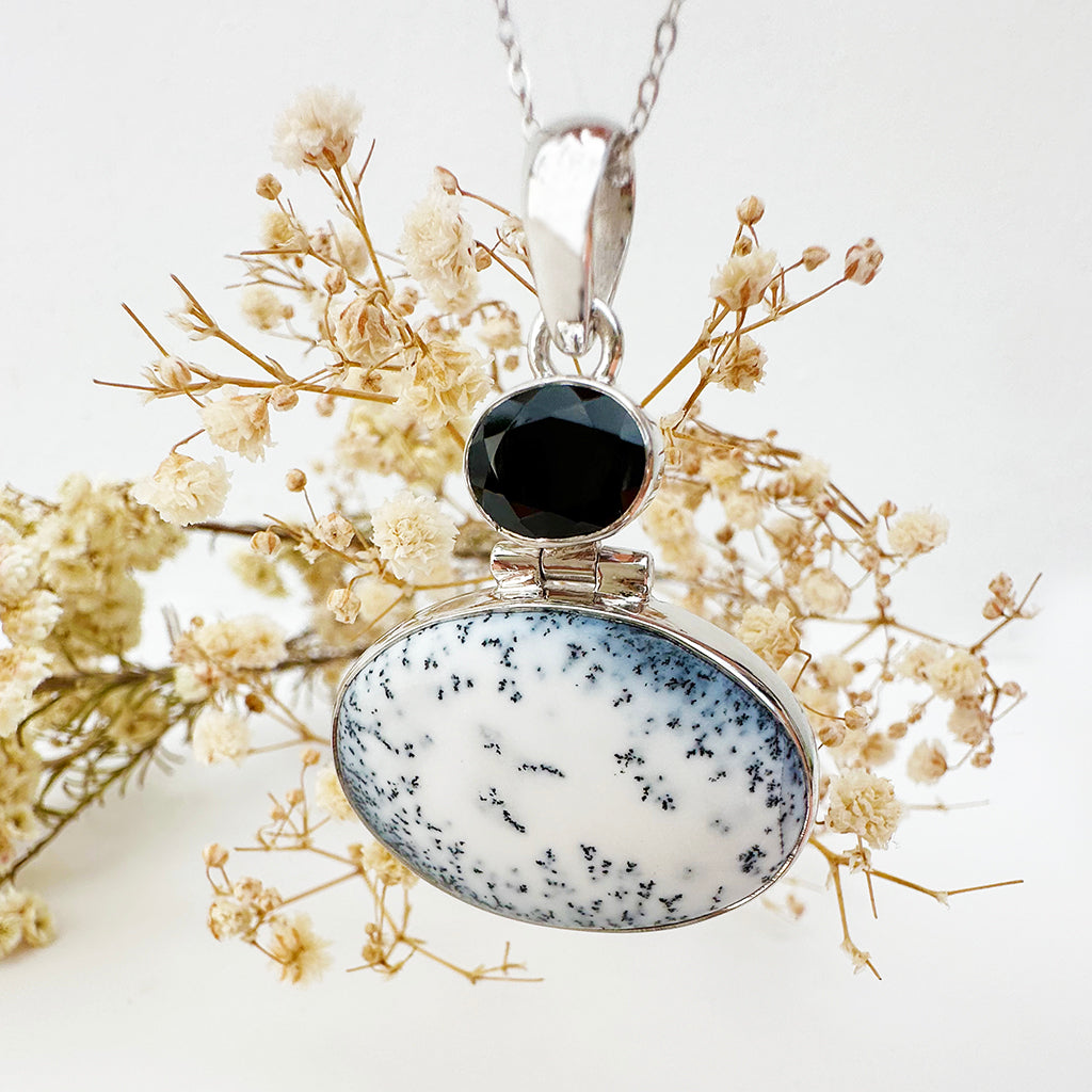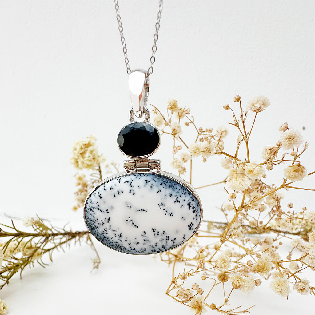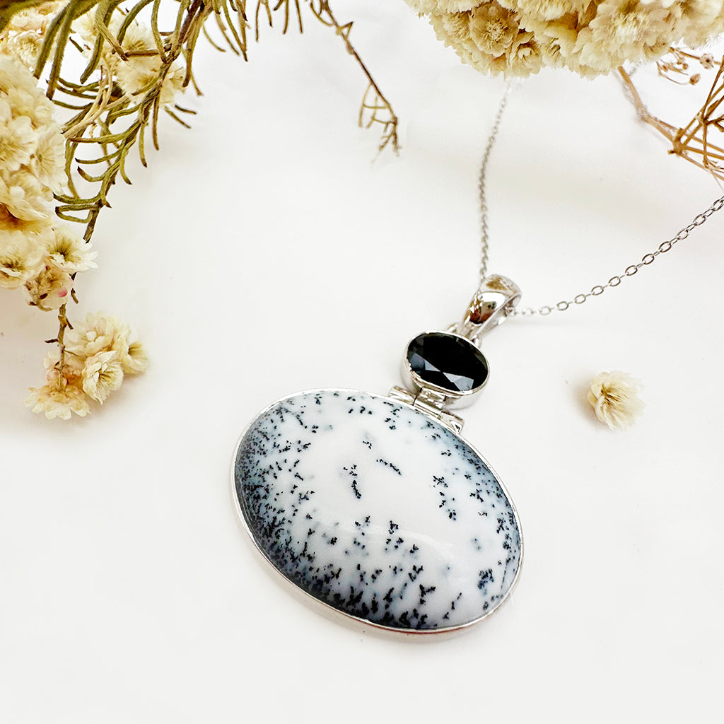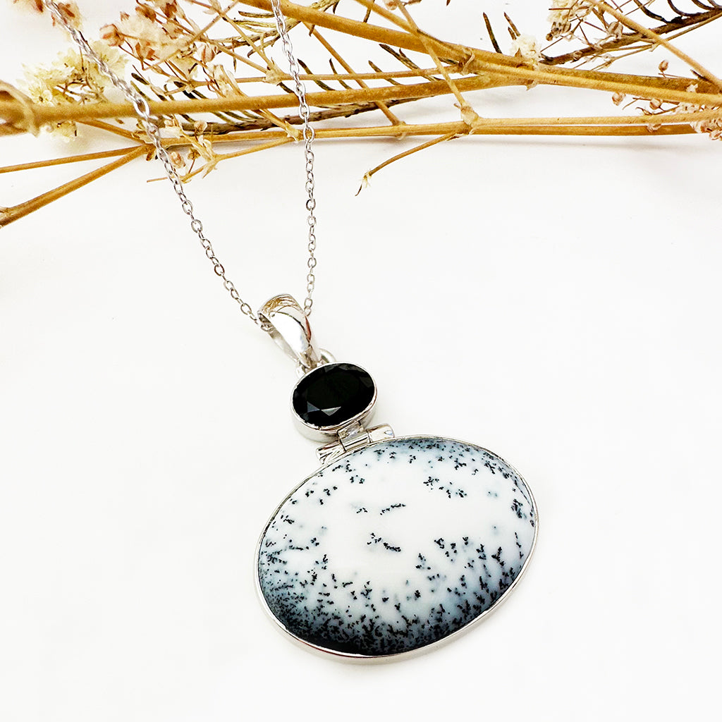 Natural Freeform Oval Dendritic Agate and Black Tourmaline Silver Pendant - 47mm x 35mm