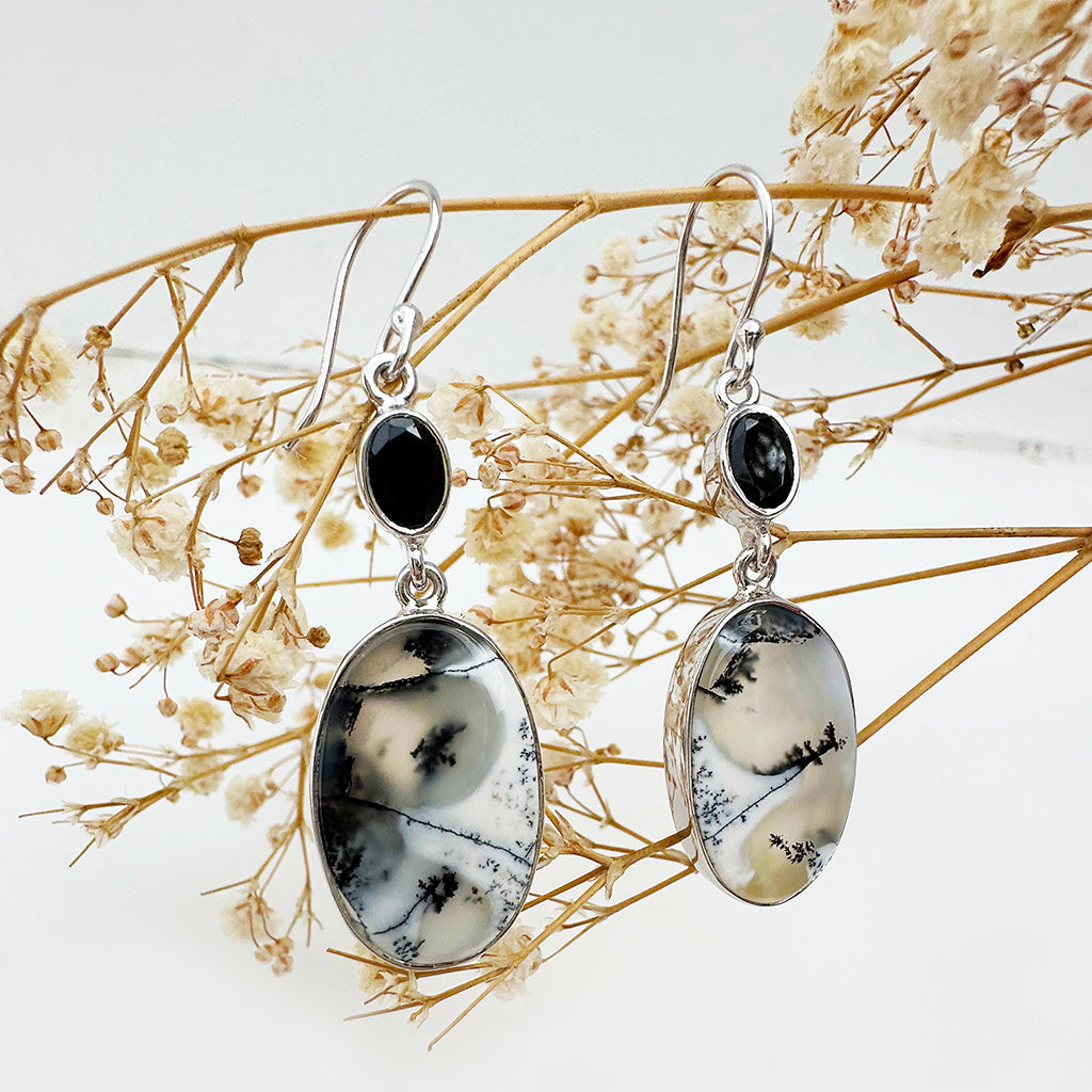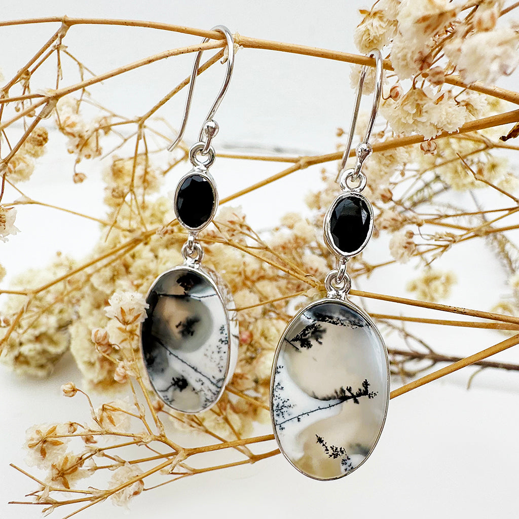 Natural Freeform Oval Dendritic Agate and Oval Black Tourmaline Silver Drop Earrings - 50mm x 15mm
