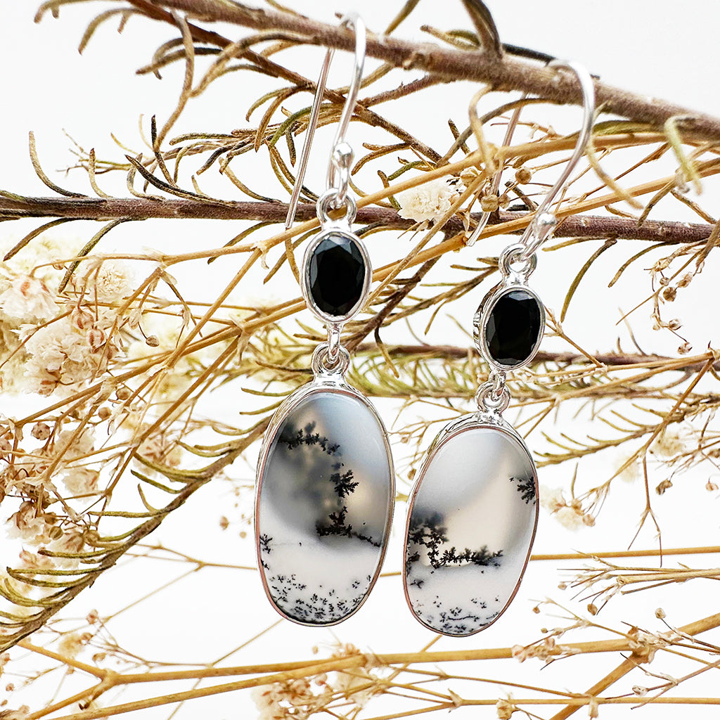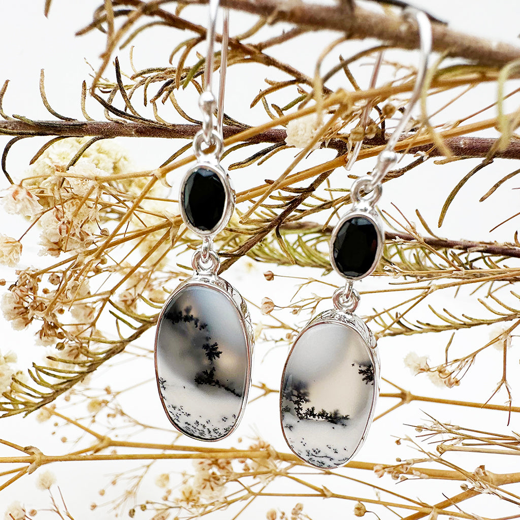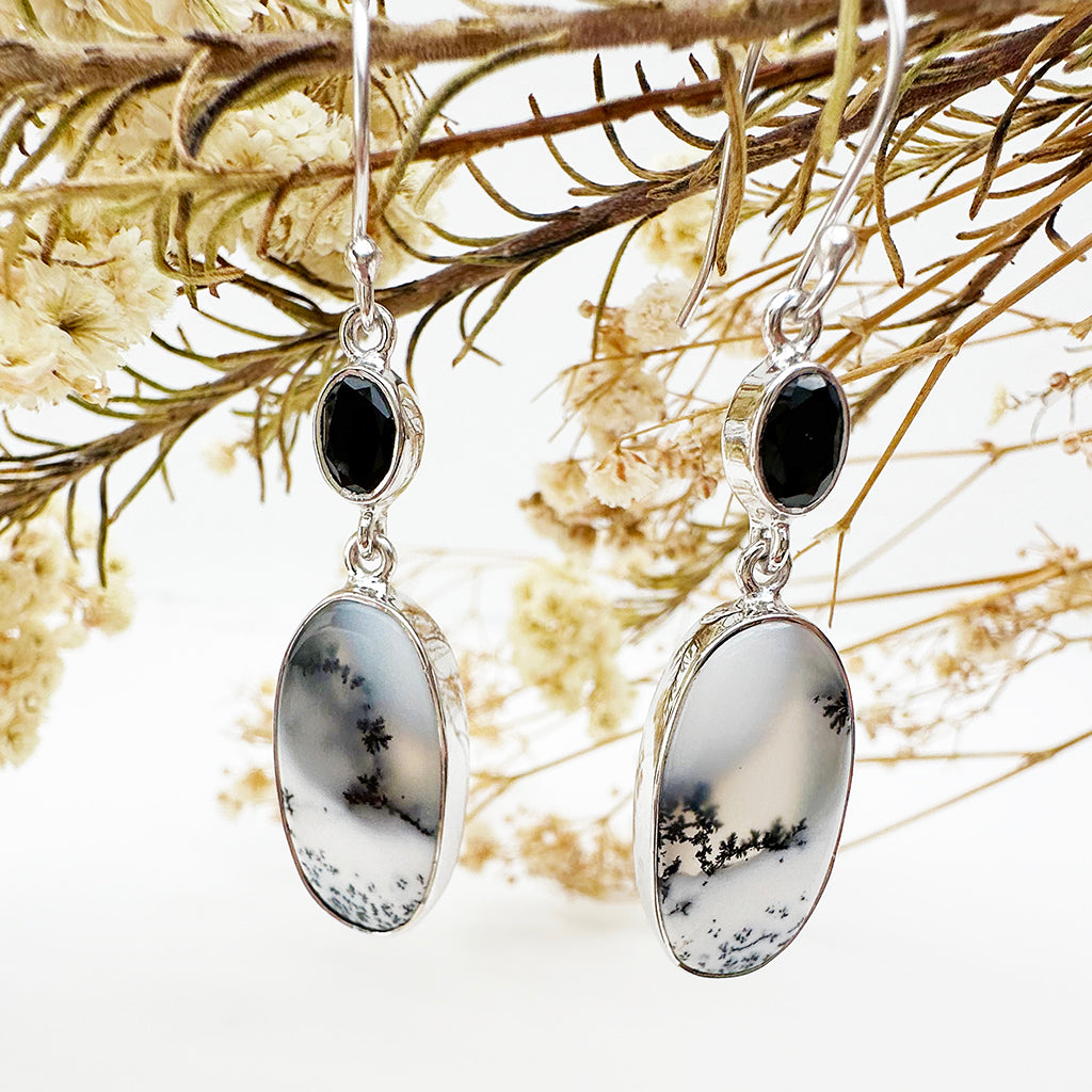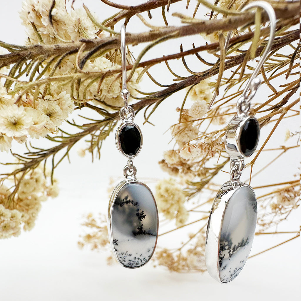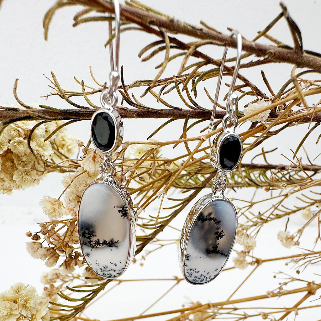 Natural Freeform Oval Dendritic Agate and Oval Black Tourmaline Silver Drop Earrings - 55mm x 13mm