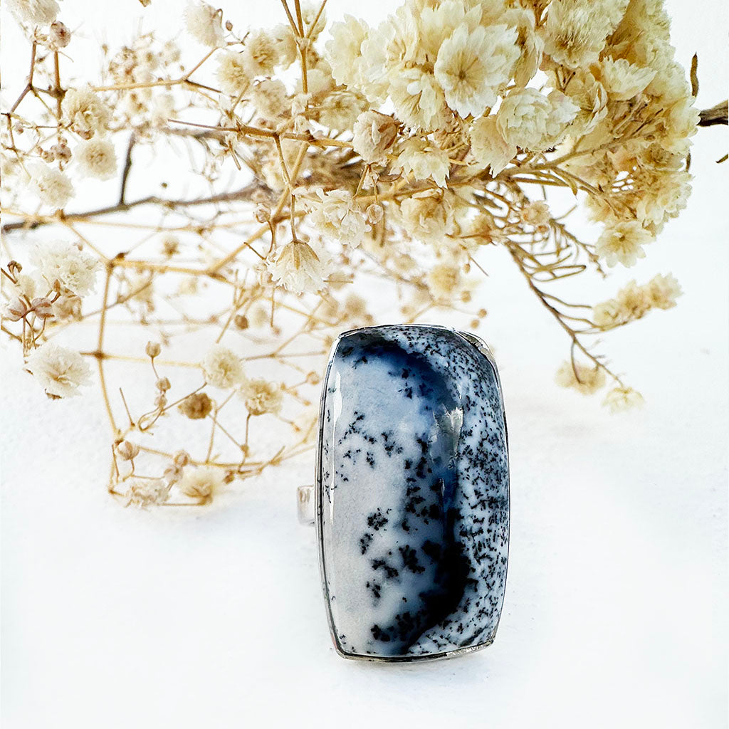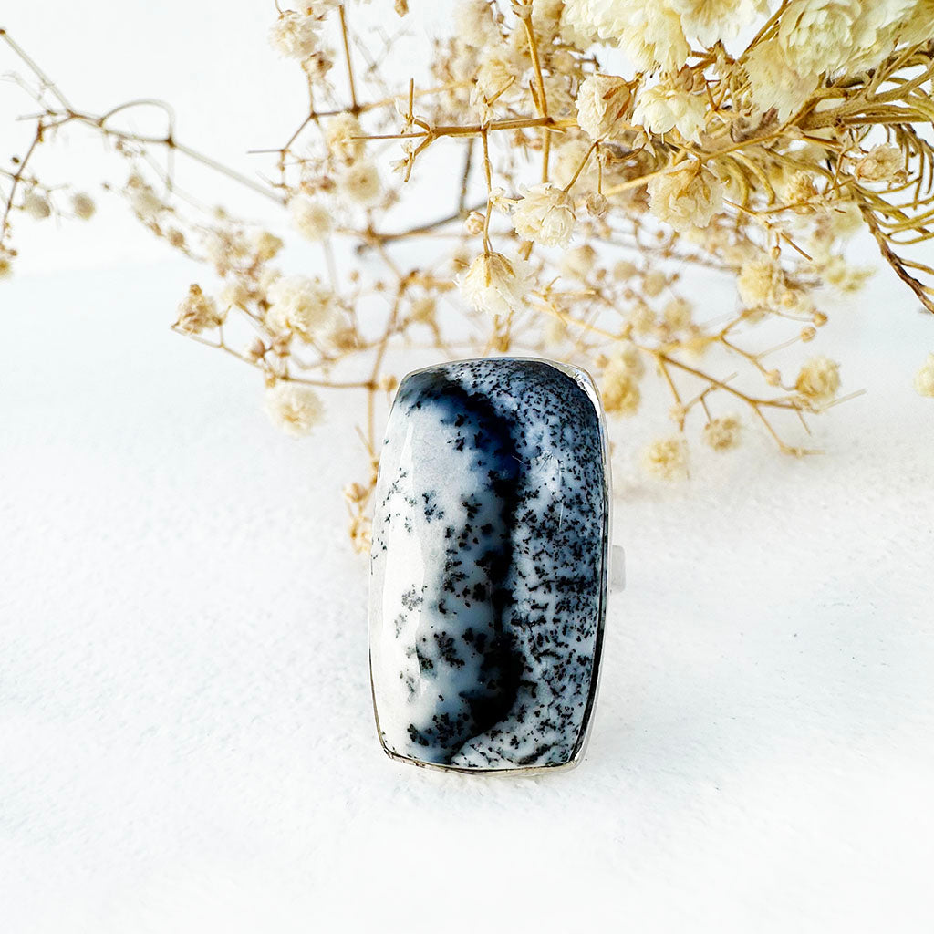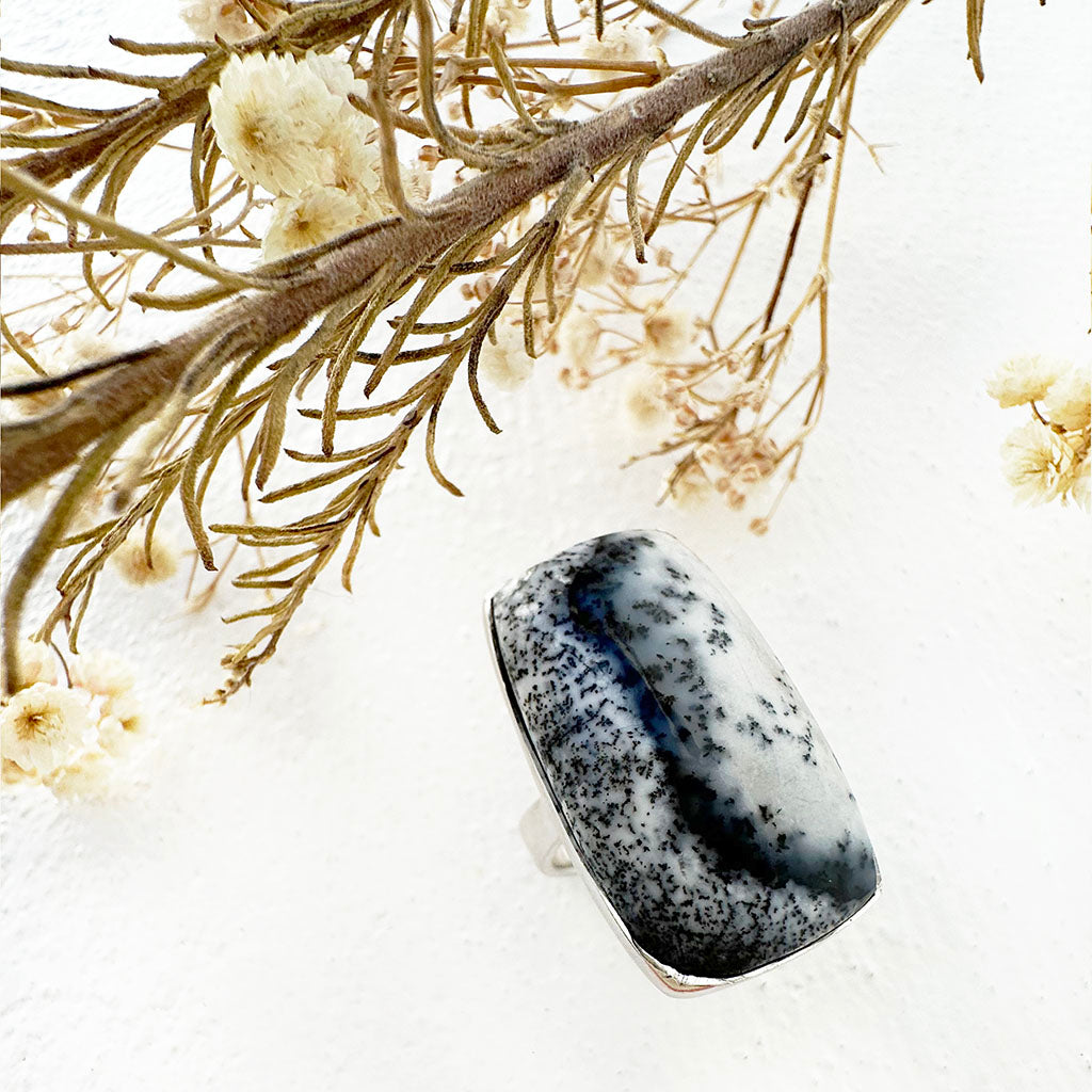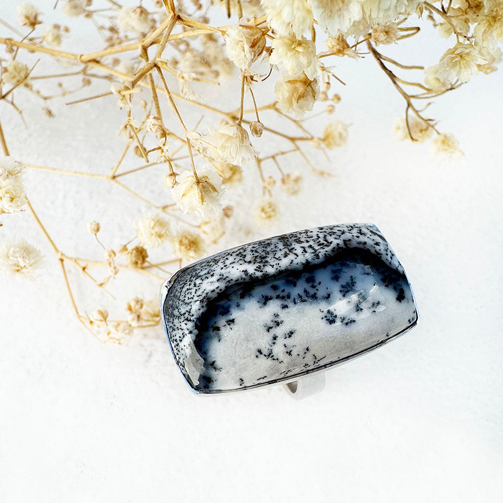 Natural Freeform Rectangular Cut Dendritic Agate Silver Ring - 30mm x 18mm