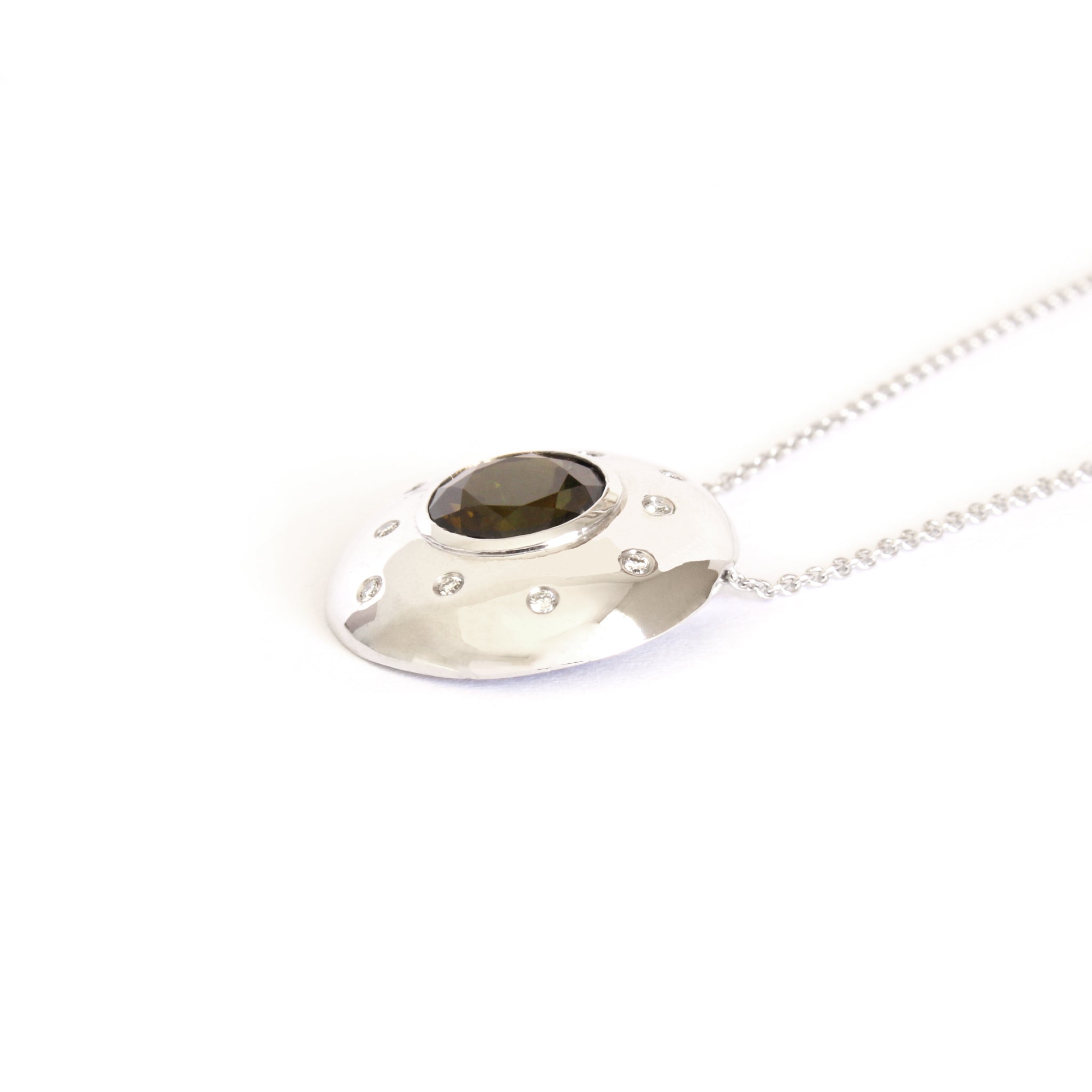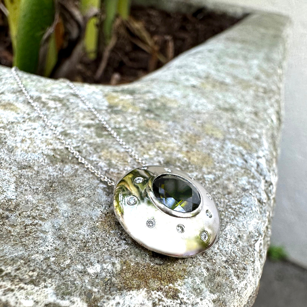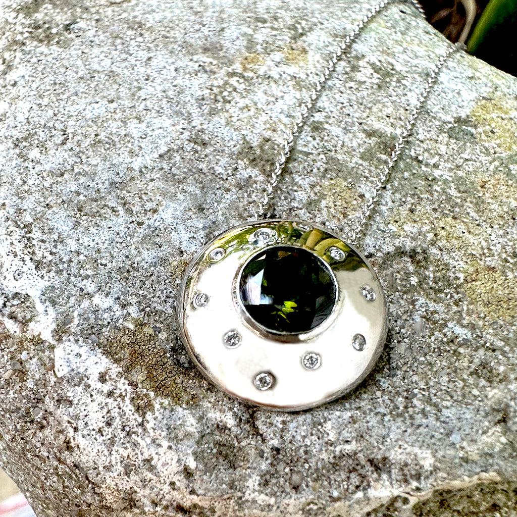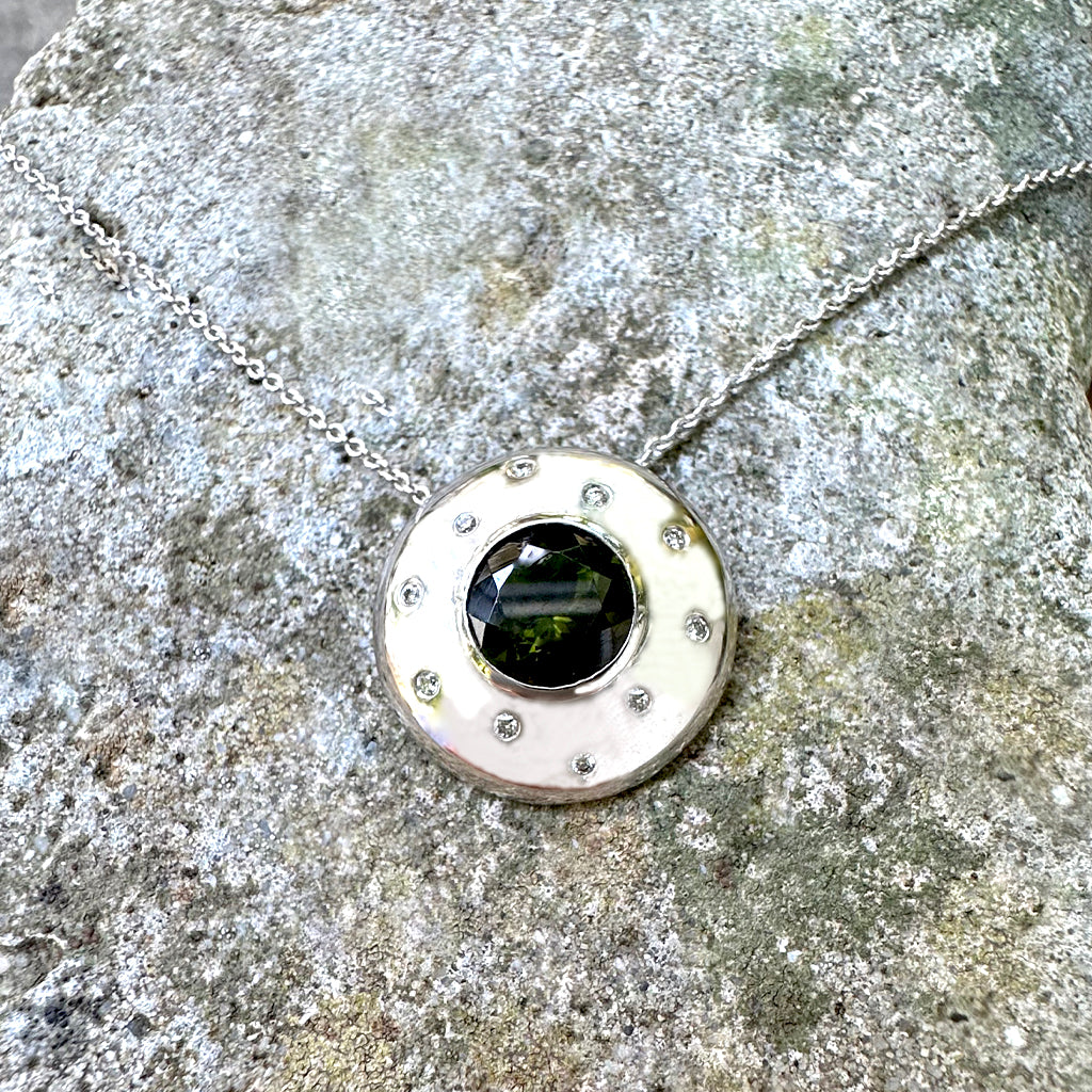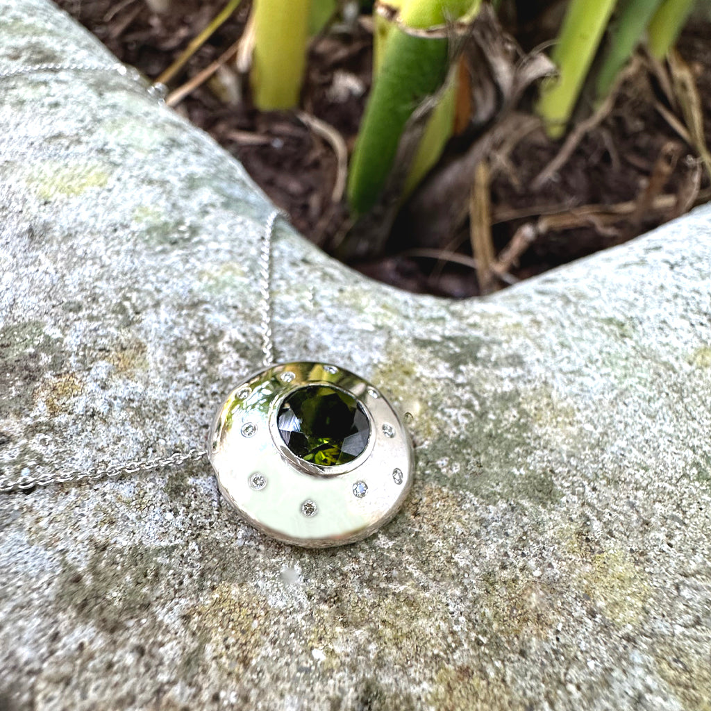 Nature Inspired Green Tourmaline and Diamond Speckled Shield White Gold Pendant