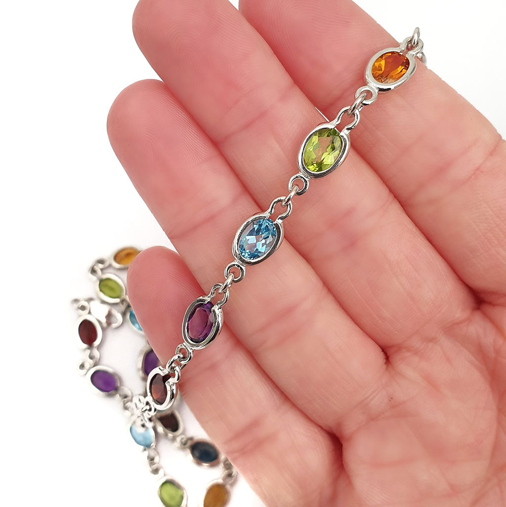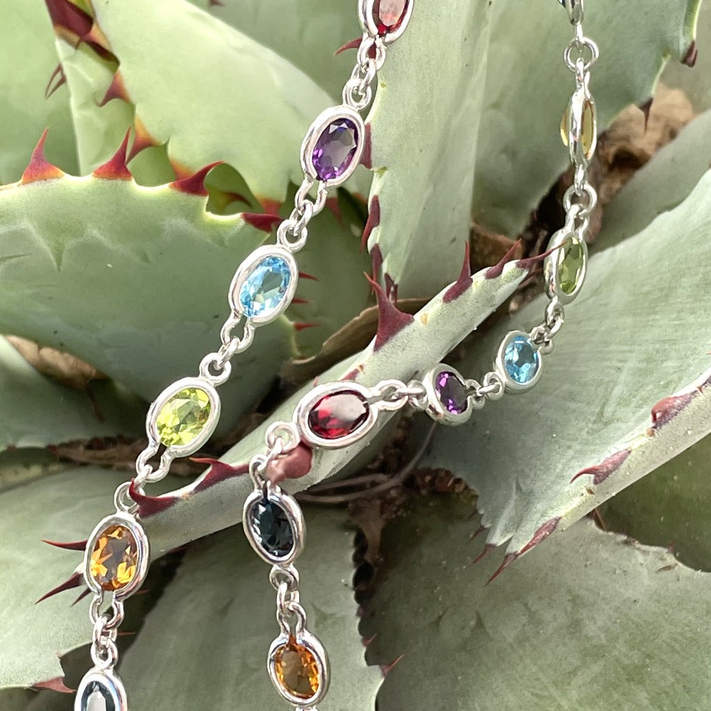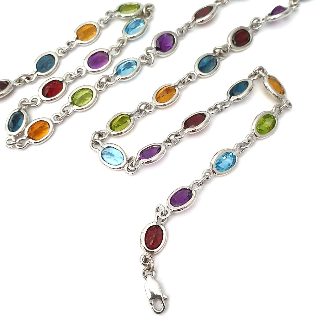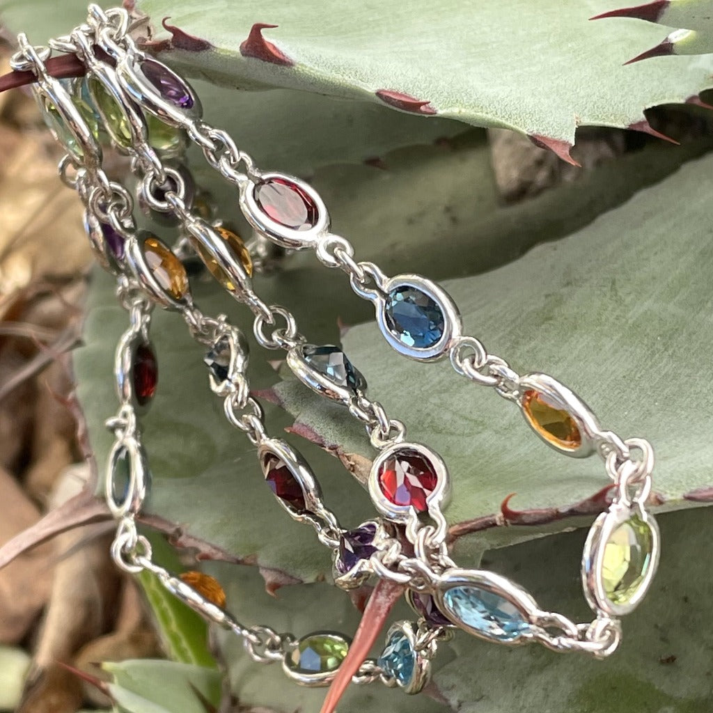 A scintillating rainbow drapes around the neck in a riot of candy coloured gemstones. 31 exquisite faceted oval gemstones in a multitude of hues are linked together in a white gold bezel setting: peridot for harmony, garnet for friendship, blue topaz for passion, London blue topaz for healing, citrine for happiness, and amethyst for wisdom.