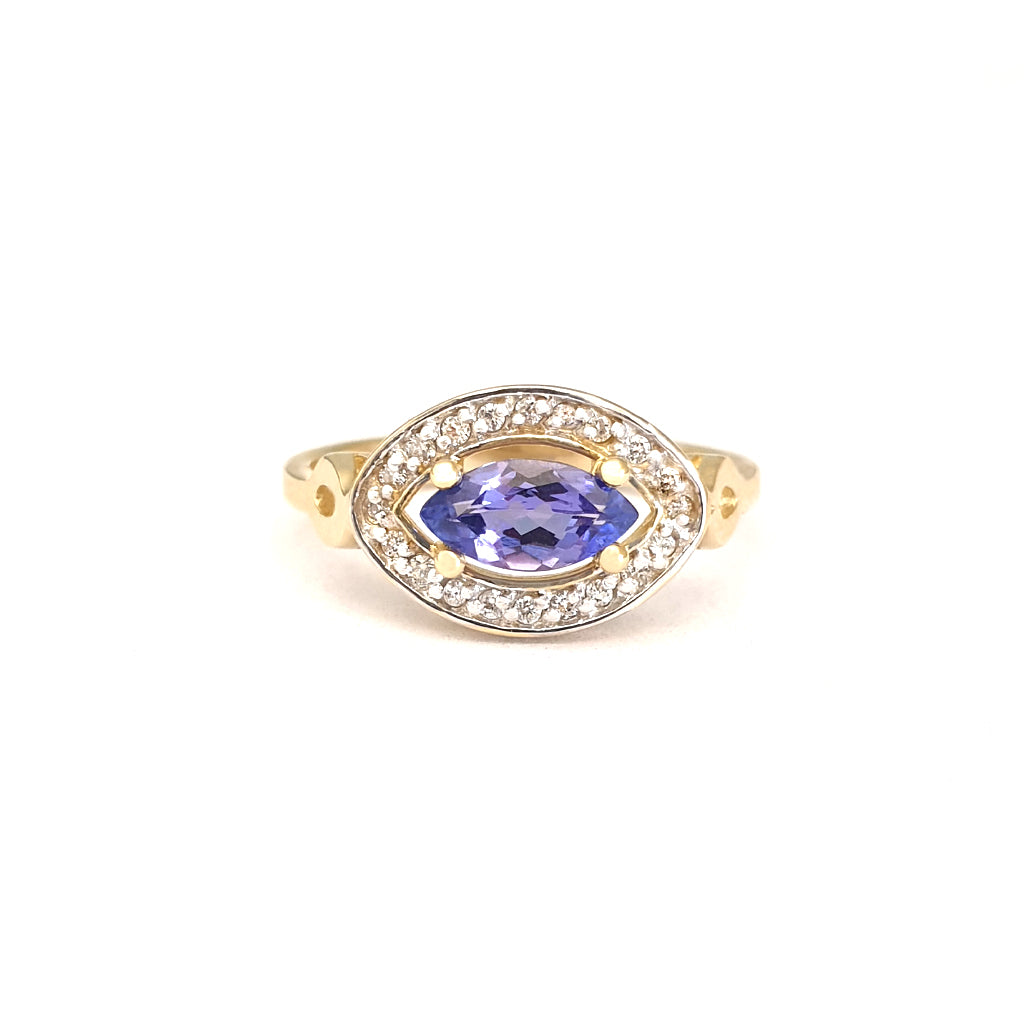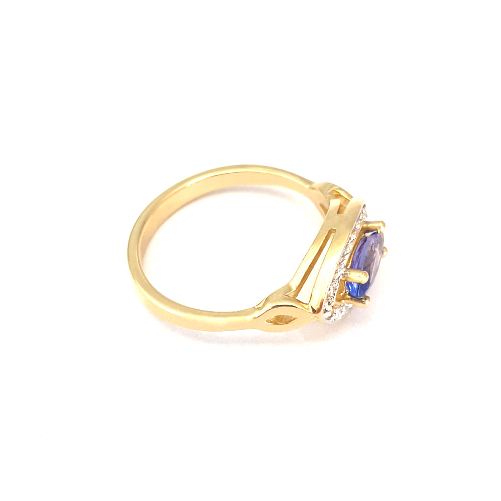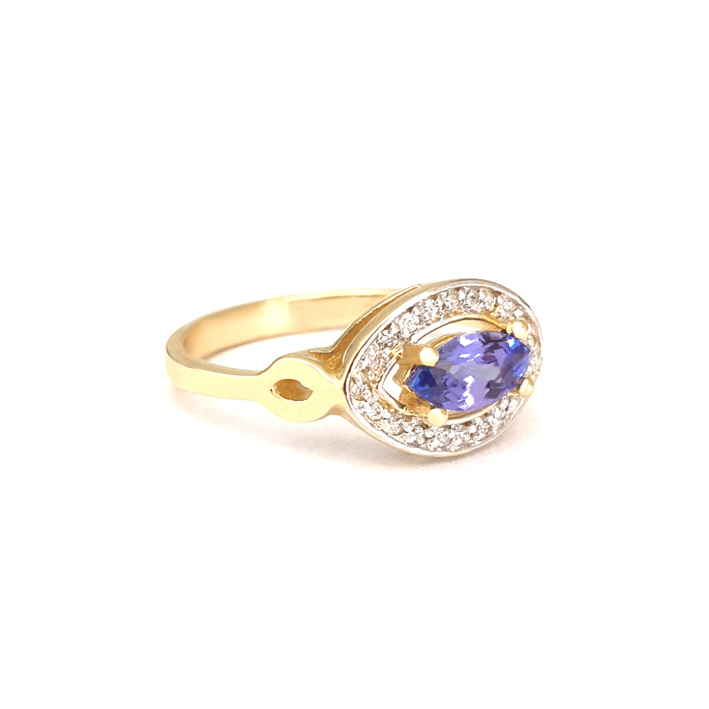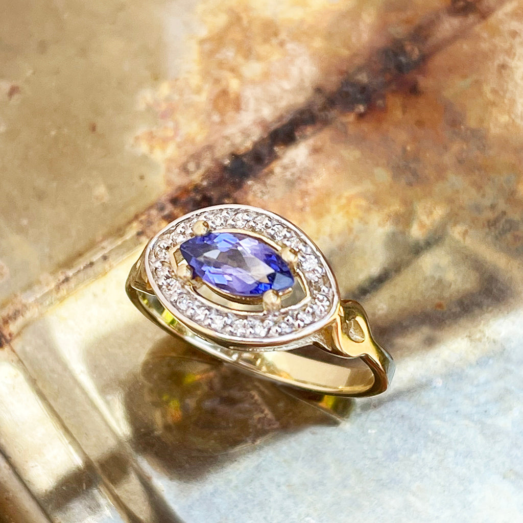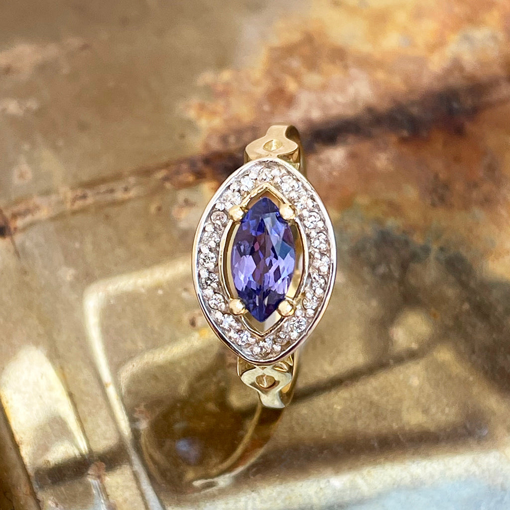 Opulent Marquise Tanzanite and Diamond Halo Yellow Gold Ring