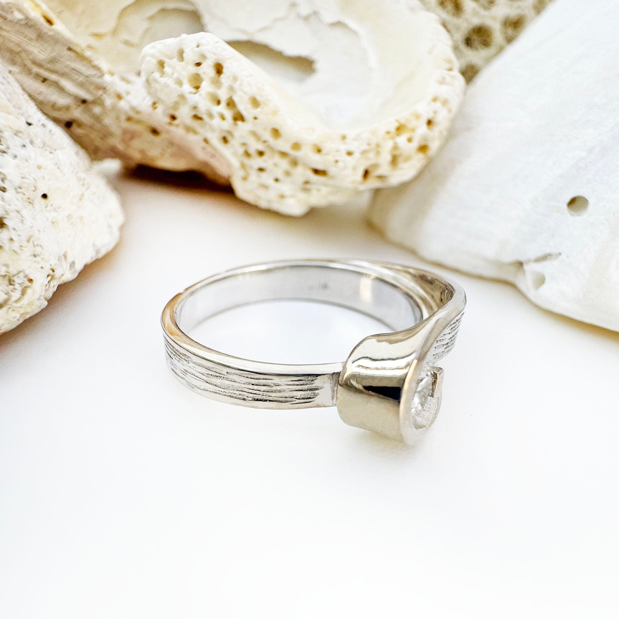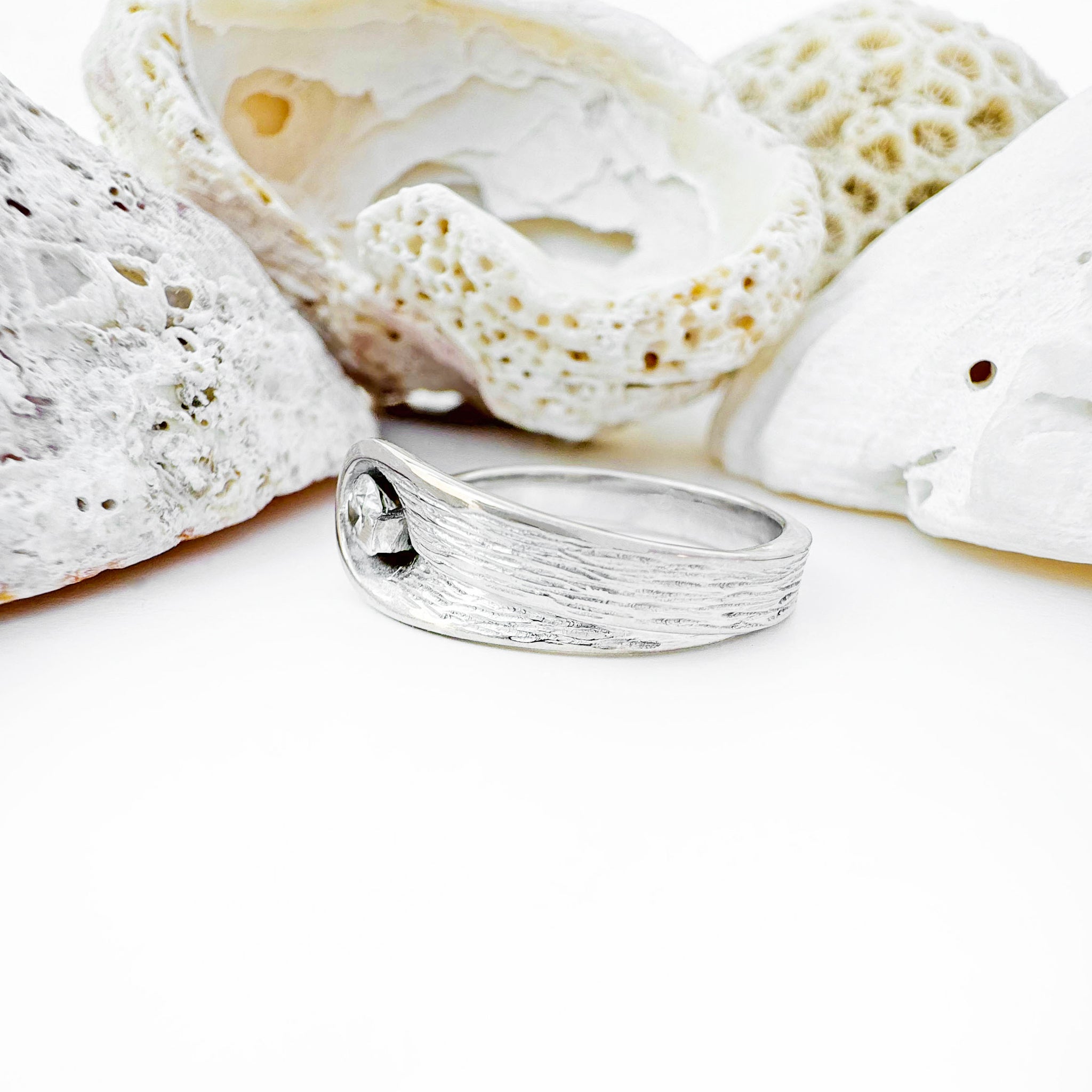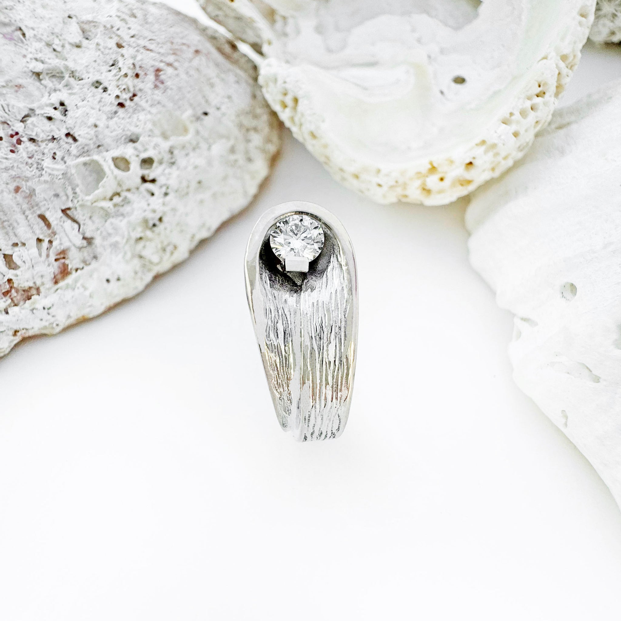 Nine-carat white gold wraps and folds organically to envelop a sparkling white diamond in this distinctive ring. The design takes inspiration from the arum lily and abstracts it, creating a piece that has an artistic aesthetic and graceful flow. The surface of the ring is textured to add to the sense of energy in motion. This texturing contrasts exquisitely with the polished gold flanks for the ring.