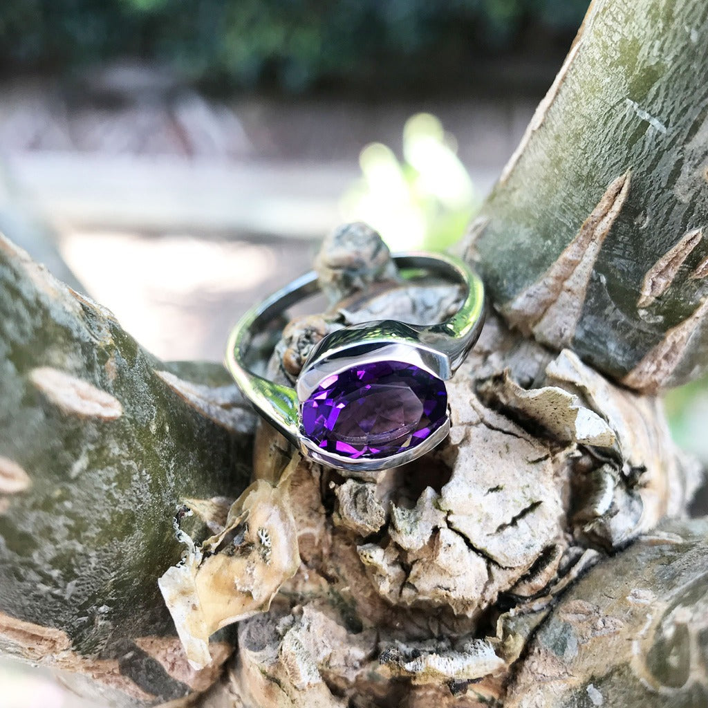 Horizontally Set Oval Cut Amethyst and White Gold Ring