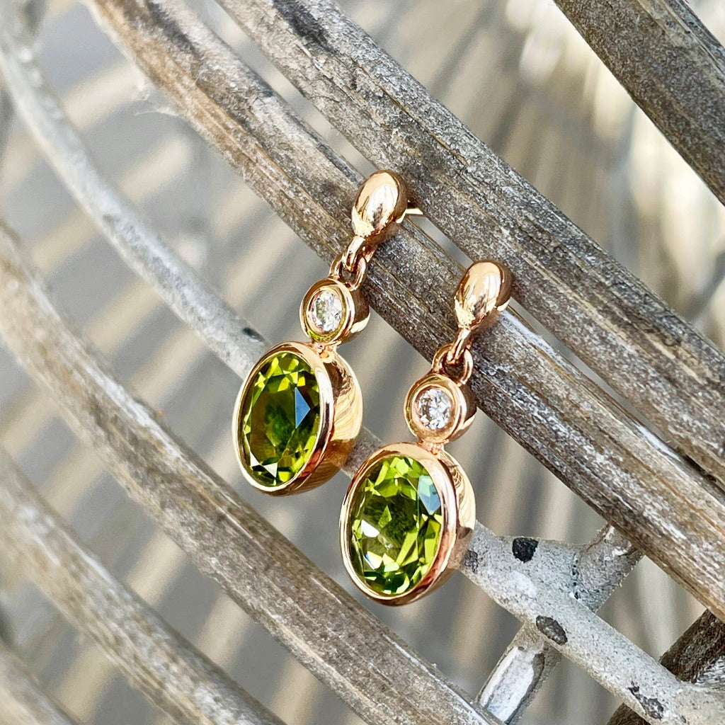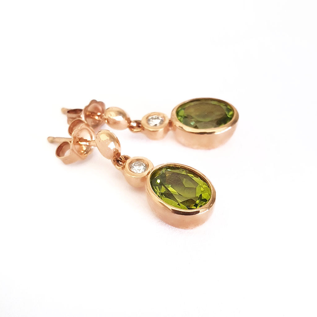 Rose Gold Oval Bezel Set Peridot and Diamond Drop Earrings