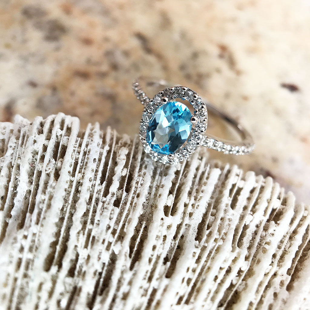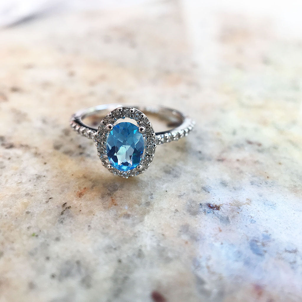Pedestal Set Blue Topaz and Diamond Halo Ring