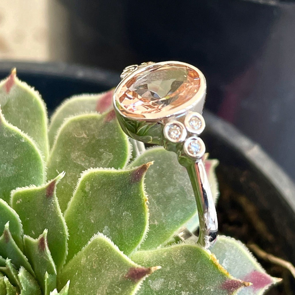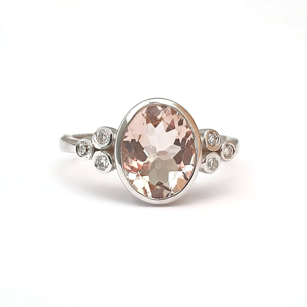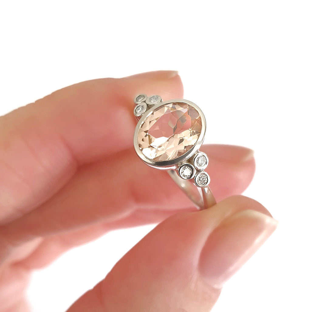 Oval Bezel Set Morganite Ring with Double Diamond Shoulder Trilogy Accents