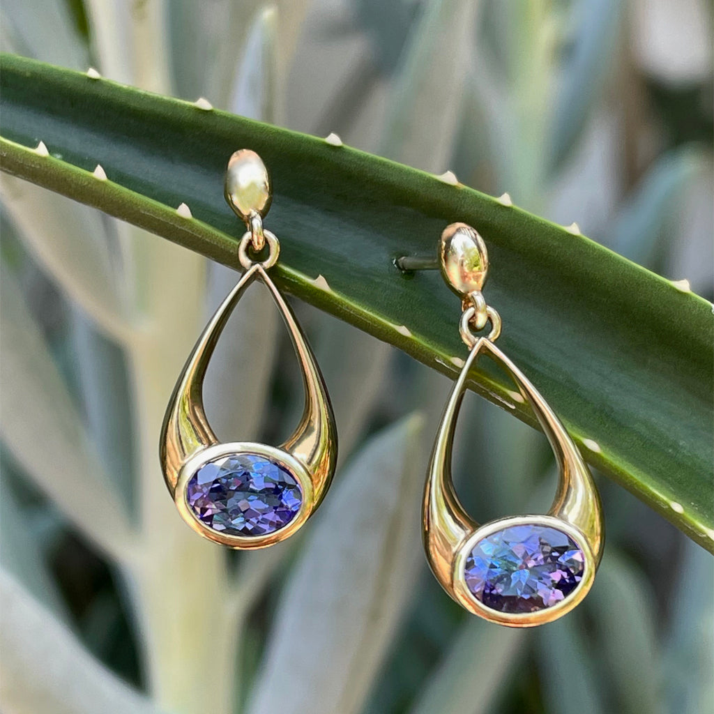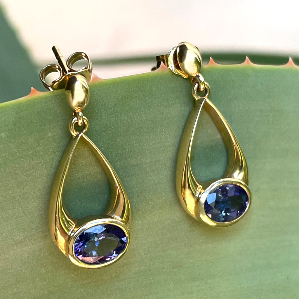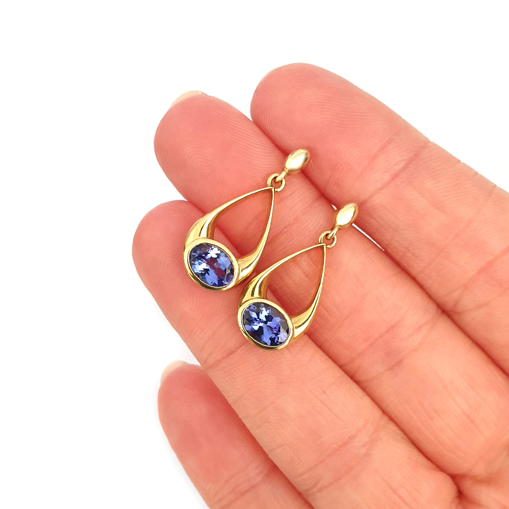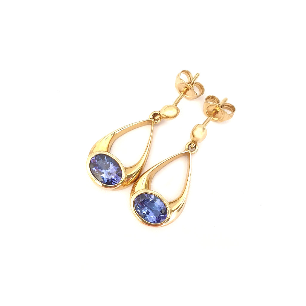 Oval Hooped Droplet Shaped Tanzanite Yellow Gold Earrings