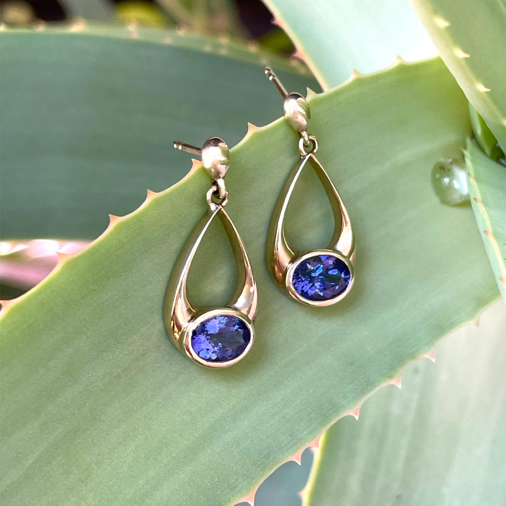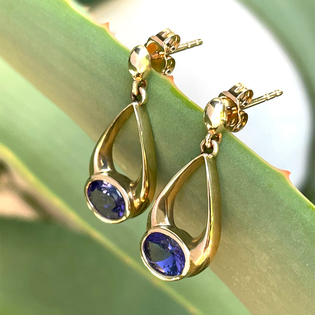 Horizontal oval tanzanites seduce the eye in these alluring earrings. The stones are bezel set to amplify their deep blue violet colour. The design is finely crafted to create a liquid effect in nine-carat yellow gold. These are Hey Girl, Yas Kween, She's the Bomb!
