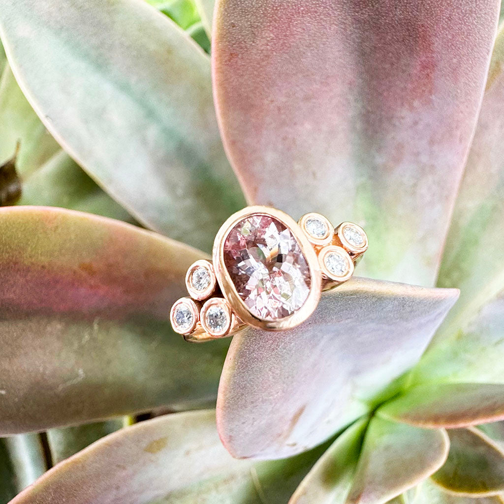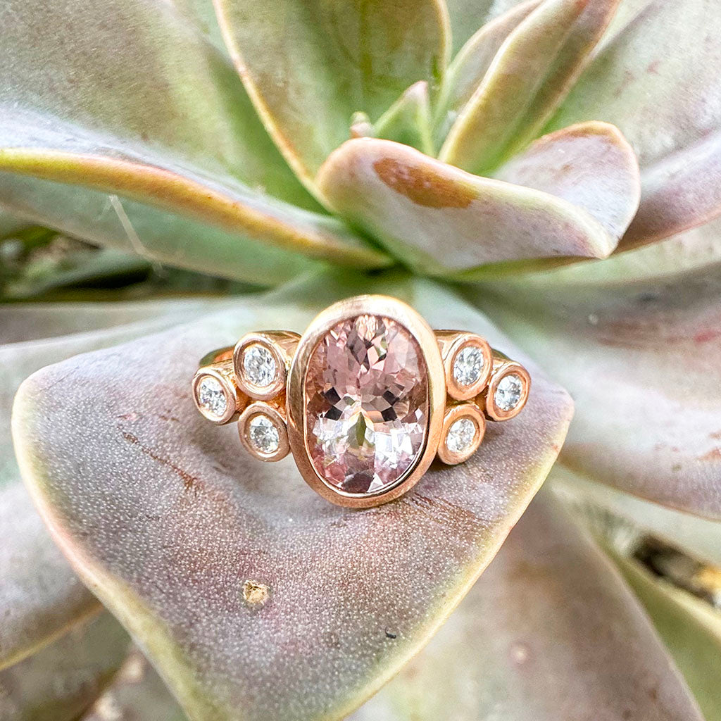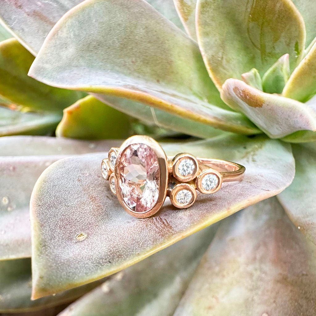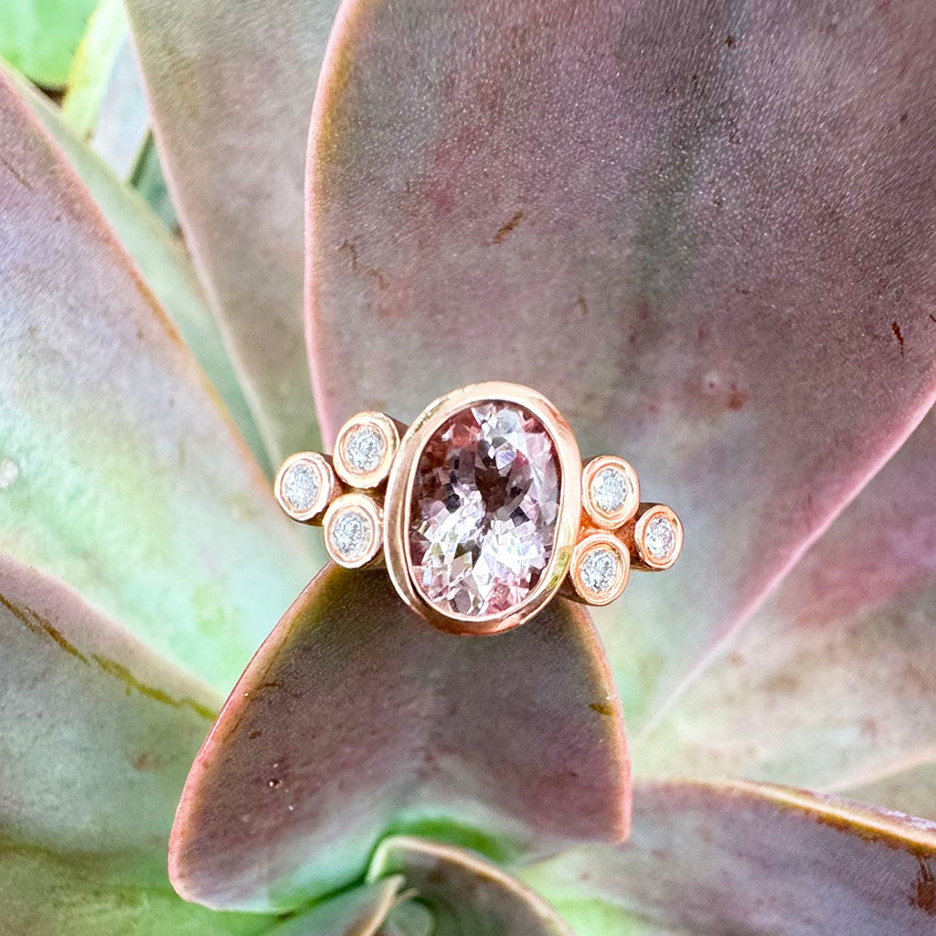 Oval Rose Gold Morganite Ring with Double Diamond Shoulder Trilogy Accents
