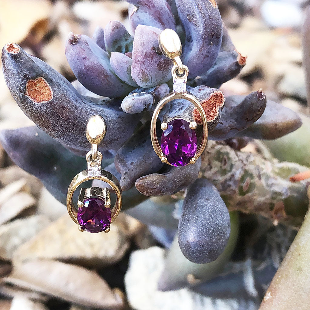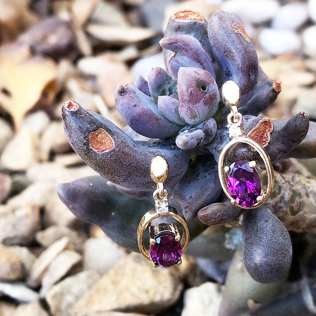 The shape of these lush oval-cut grape garnets is mirrored in the warm gold oval surrounds, creating a luxurious balance. A white diamond accent brings a flash of sparkle to the earrings, while the gemstones and gold bring passion and heat. This pair of sumptuous earrings is the Romeo and Juliet of jewellery.
