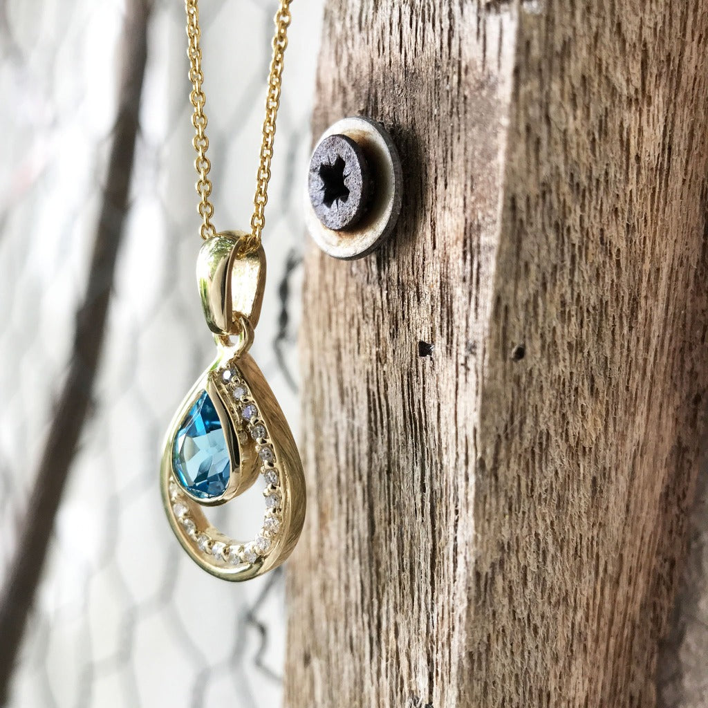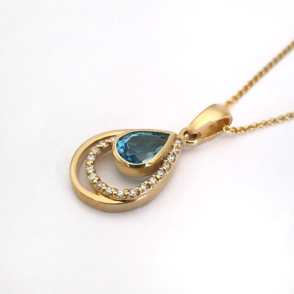 A trio of sparkling water droplets combine in this mesmerising pendant for every women who ever dreamed of mermaids. The central droplet is created from a pear cut blue topaz, and is framed by dazzling diamonds and solid yellow gold. The centre stone is offset slightly to create an unusual optical twist. The pendant comes with a nine-carat gold light anchor chain