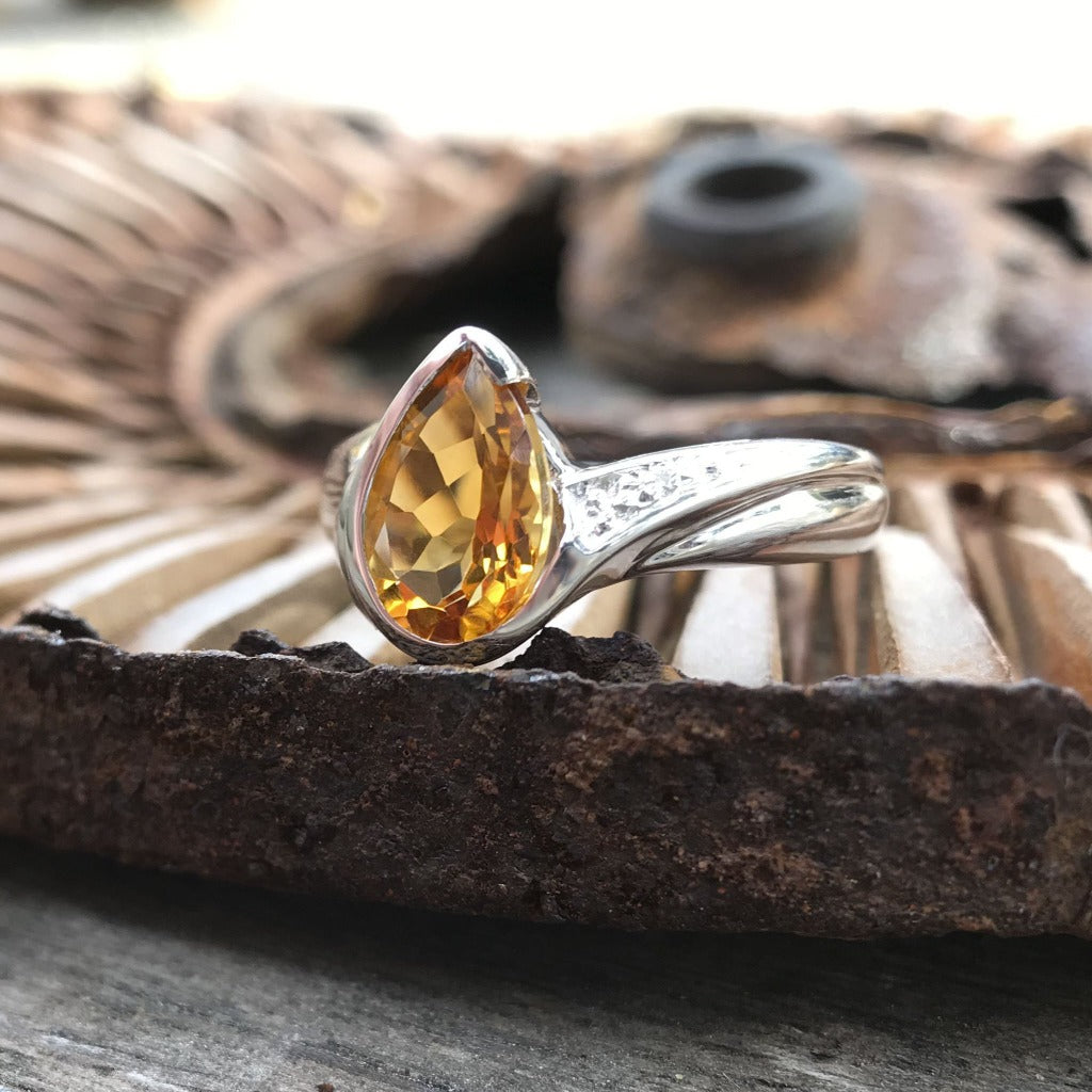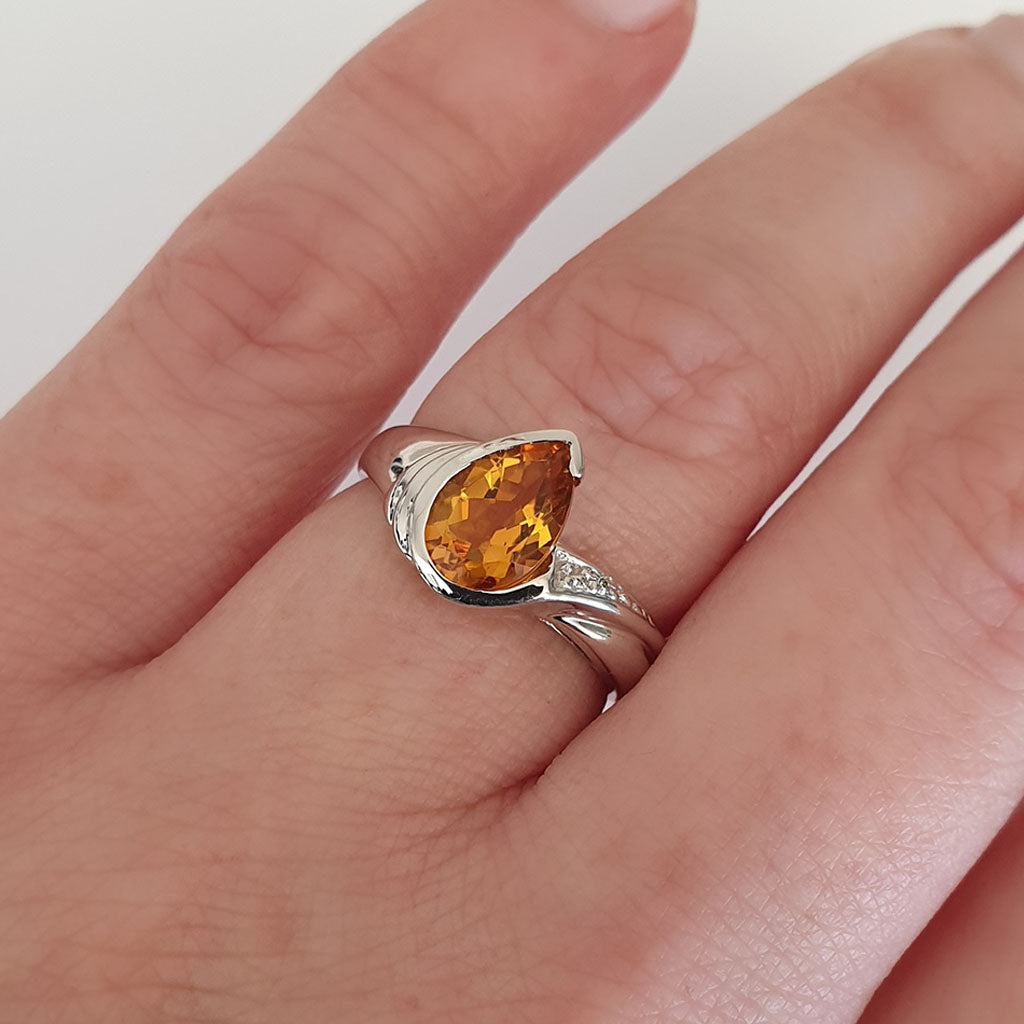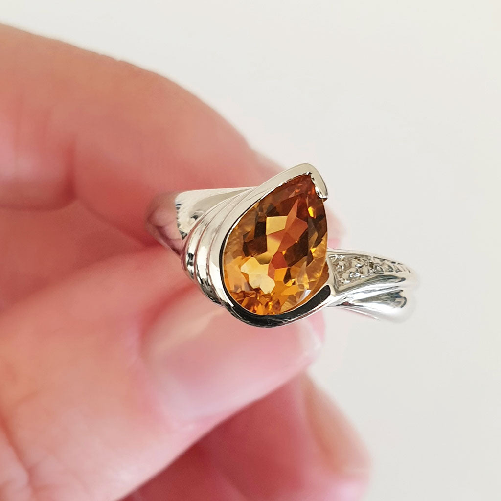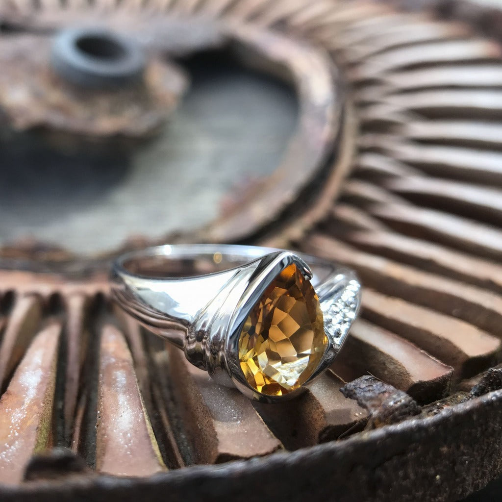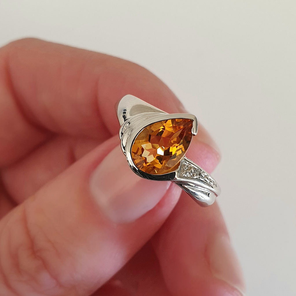 A generous pear cut citrine holds the exquisite asymmetry of this showstopping ring in balance. The stone's half bezel setting is open on one side, allowing light penetration that is further enhanced by the sparkling diamonds set into the adjacent shoulder. The opposite shoulder has a polished white gold step design. This finely crafted ring has all the wow factor.