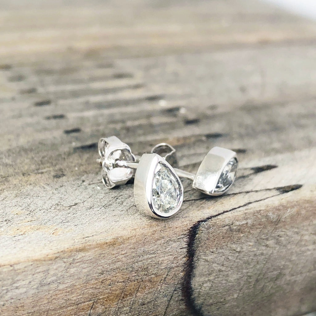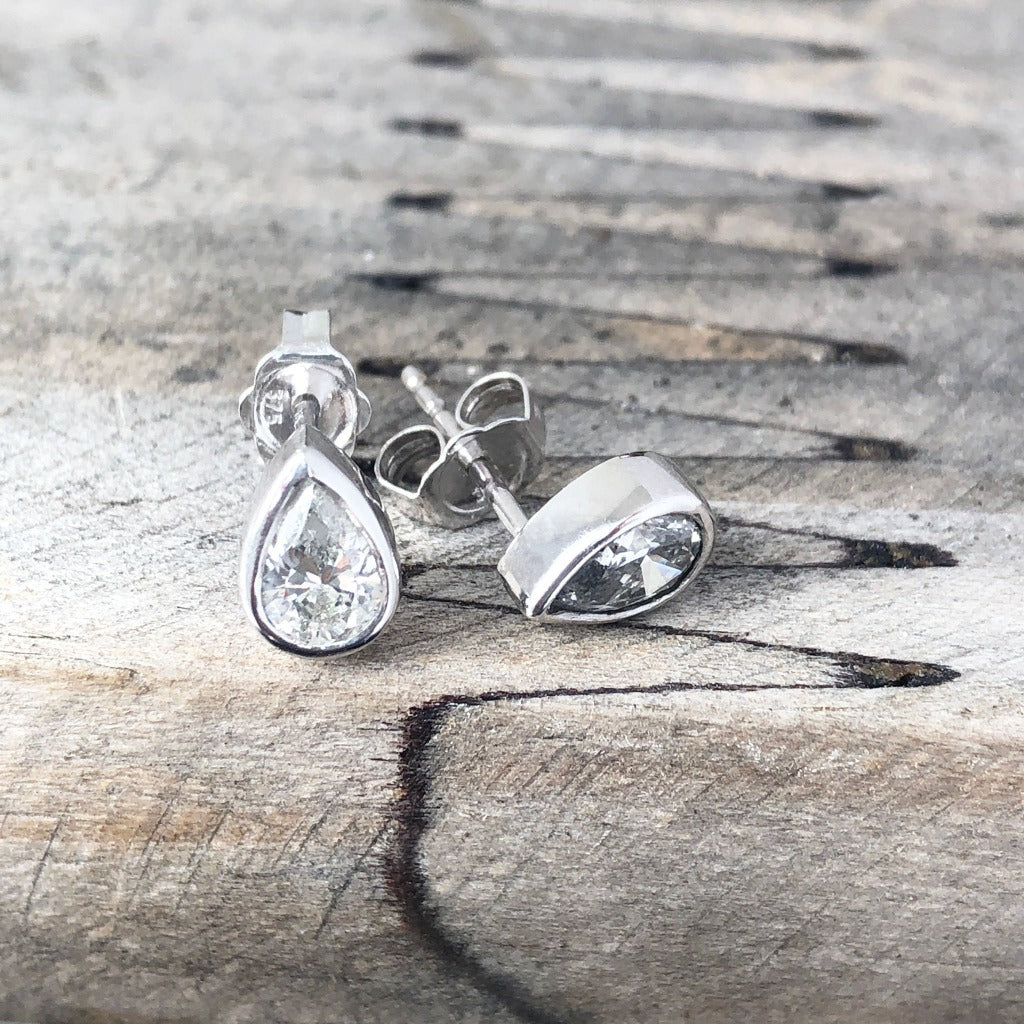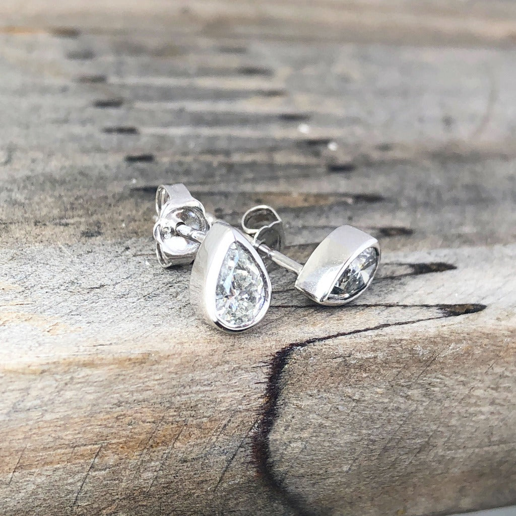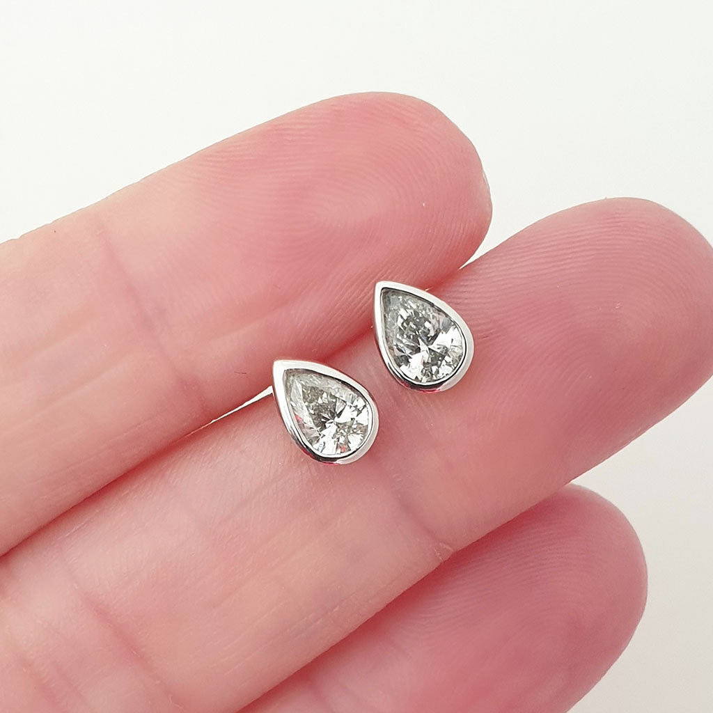 Tube set diamond earrings are a contemporary classic that will never go out of style. The polished gleam of white gold combined with dazzling pear-cut diamonds in these exquisite earrings give you the ultimate streamlined styling while protecting the precious stones. These are the height of understated glamour.