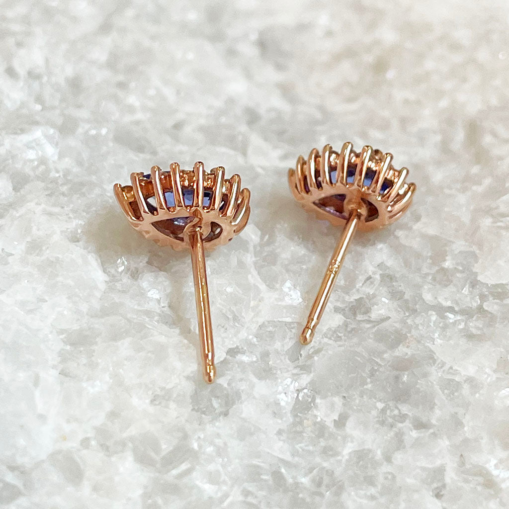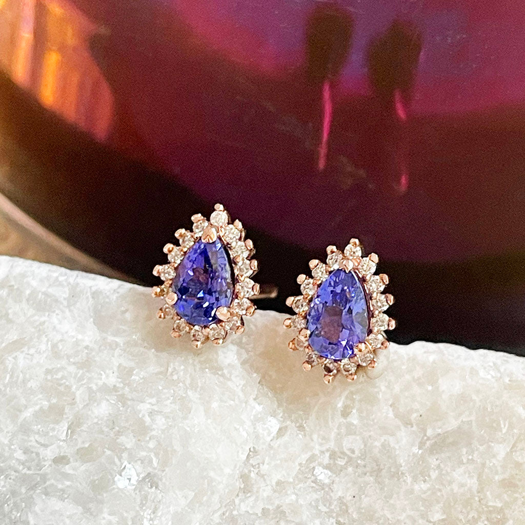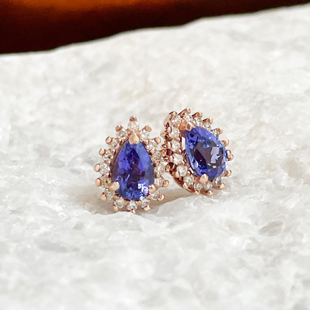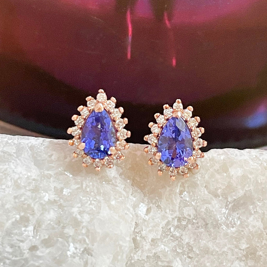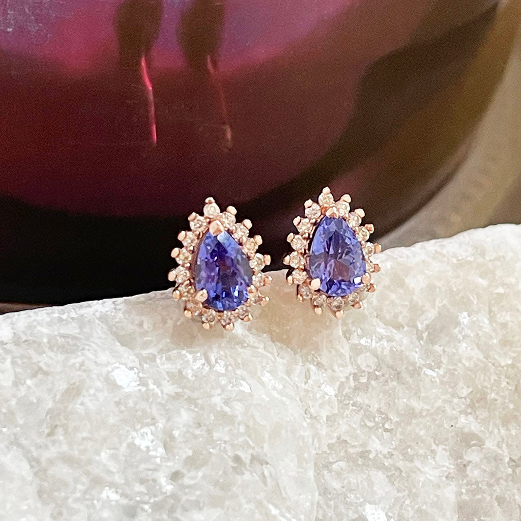 Perfectly Paired Pear Cut Diamond Halo Tanzanite Rose Gold Studs