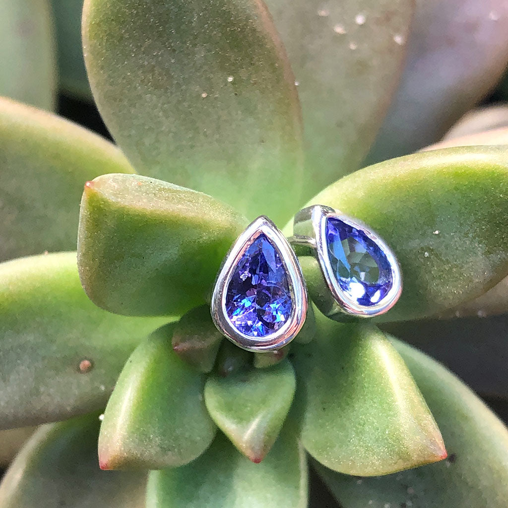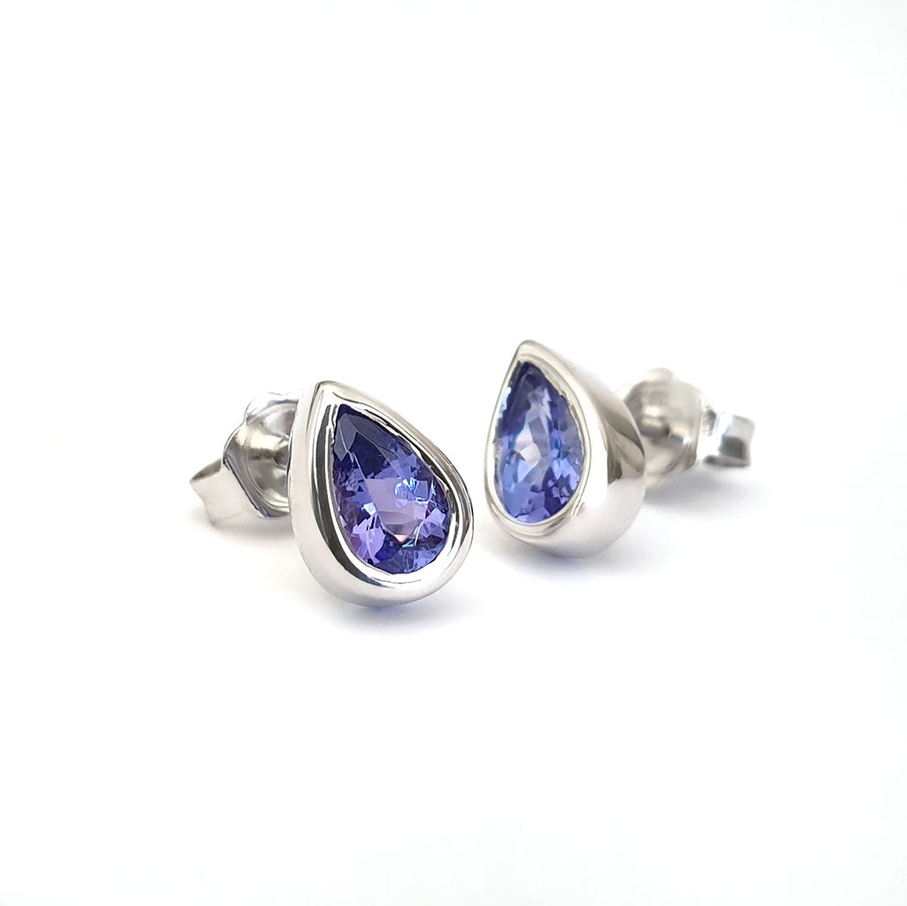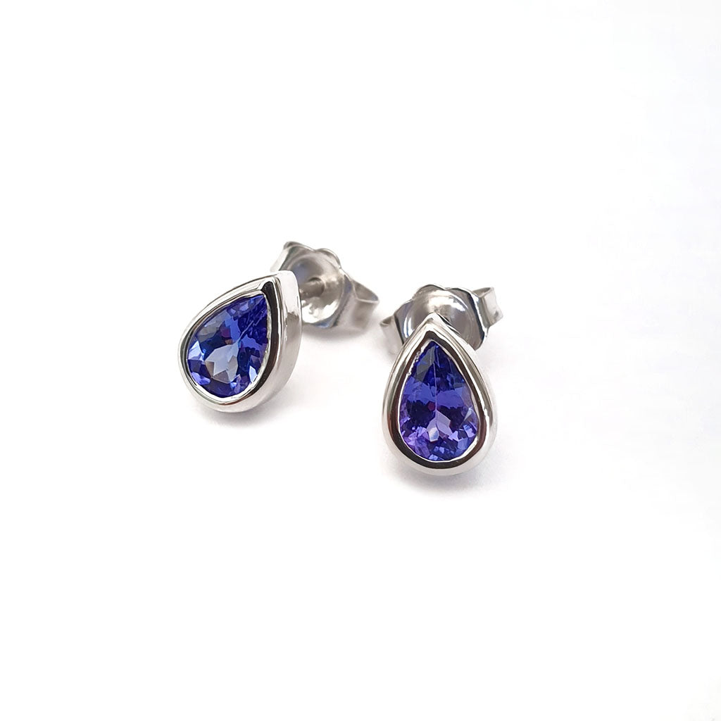 Petite Pear Cut Bezel Set White Gold Tanzanite Studs