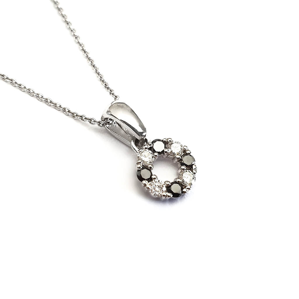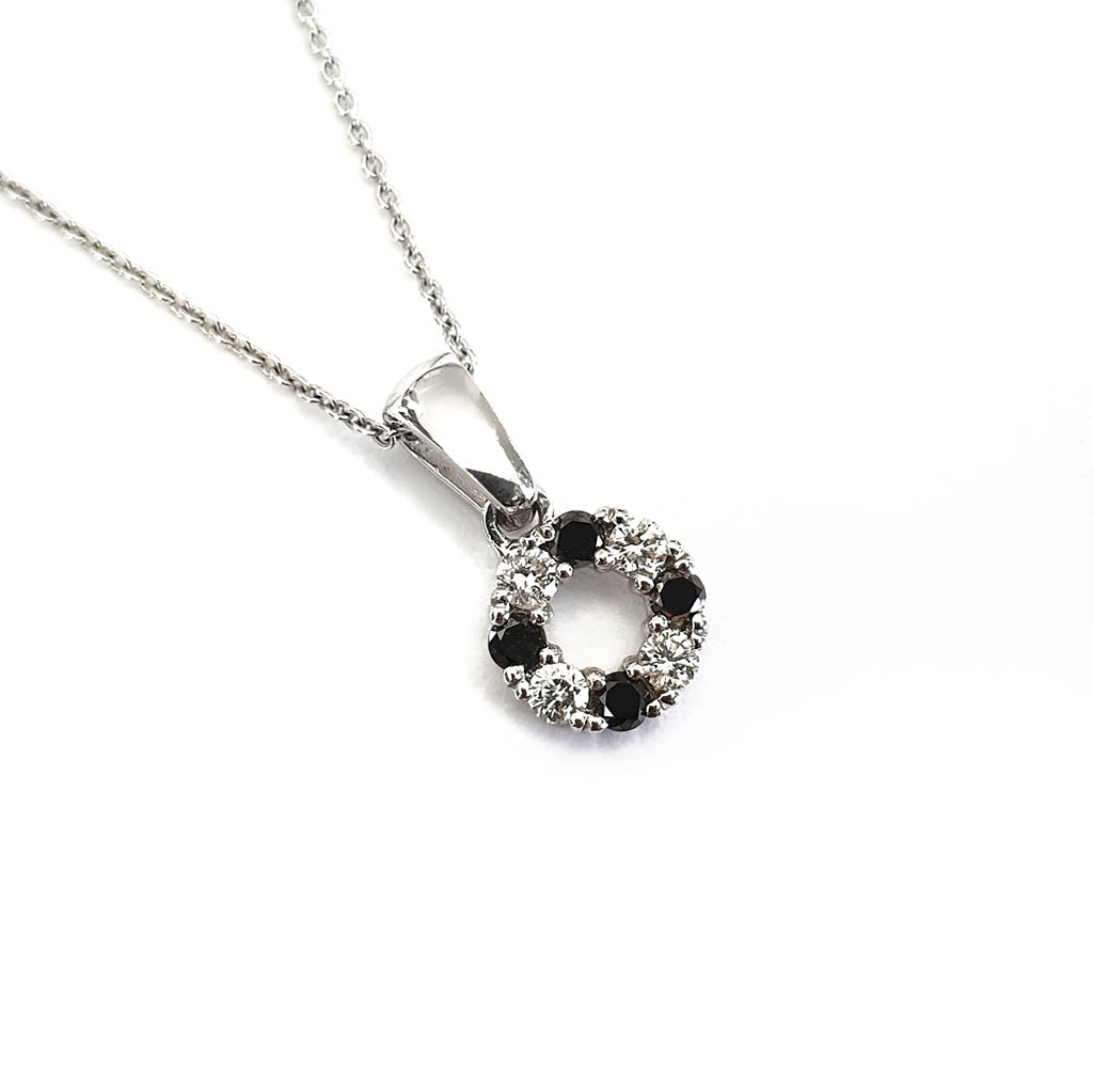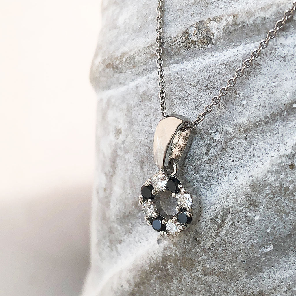 This beautiful petite wreath pendant alternates lustrous black diamonds and sparkling white diamonds in a nine-carat white gold setting.  No one should have to choose one exquisite diamond colour over another, especially when you can have both in such an alluring pendant. A bit like having your cake...