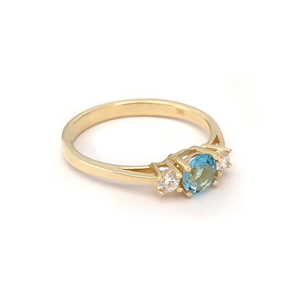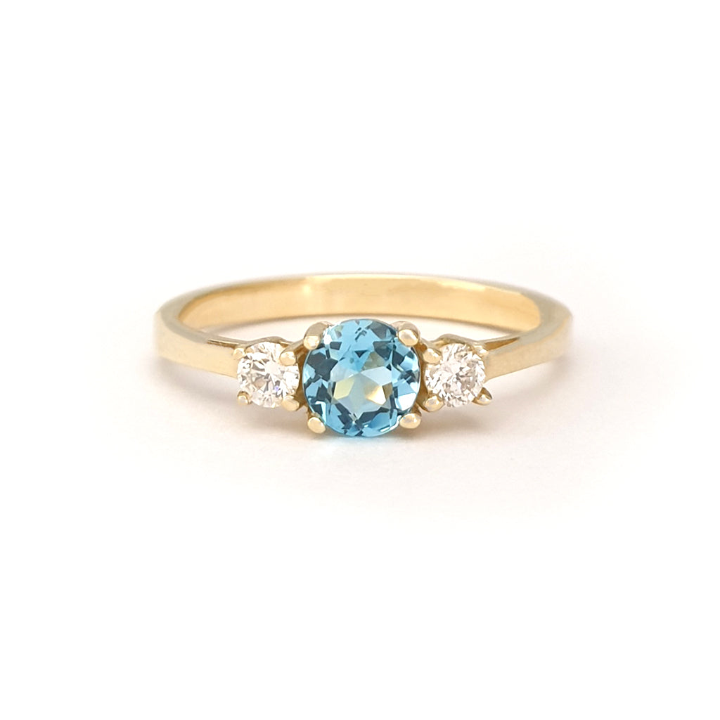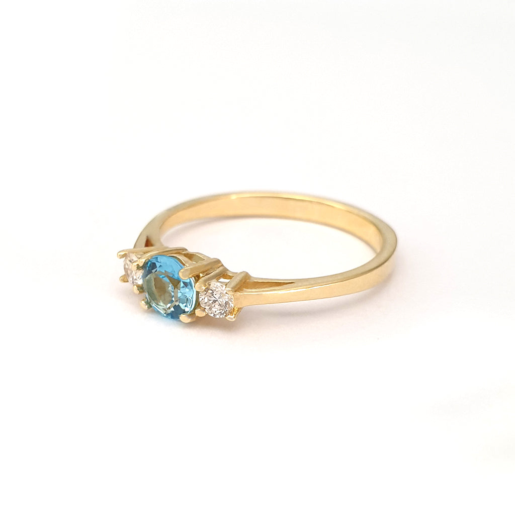 Petite Blue Topaz and Diamond Trilogy Yellow Gold Ring