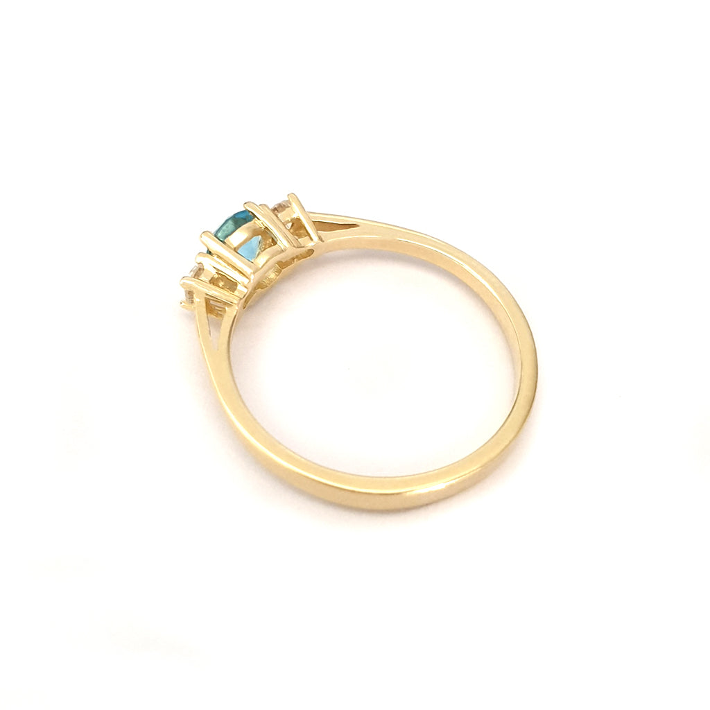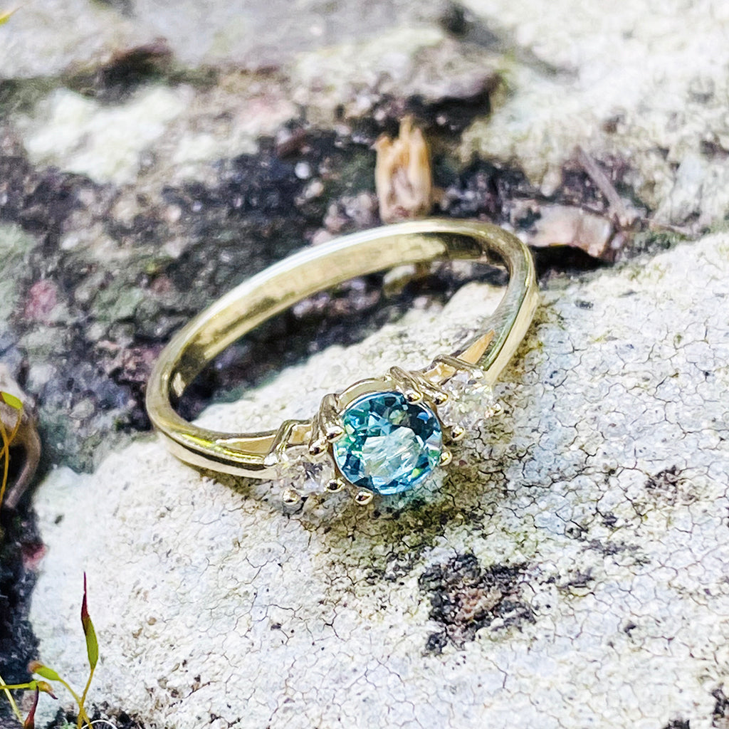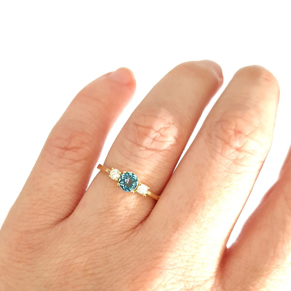 Petite Blue Topaz and Diamond Trilogy Yellow Gold Ring