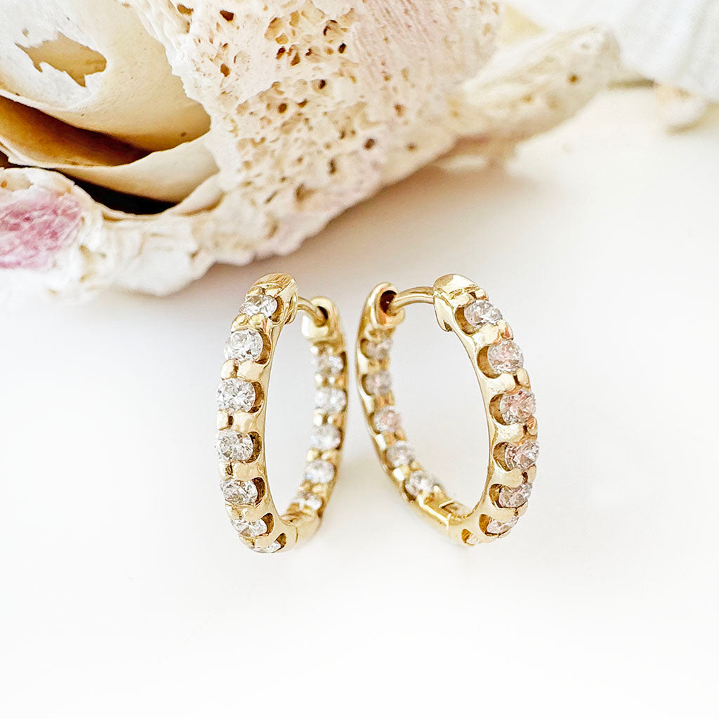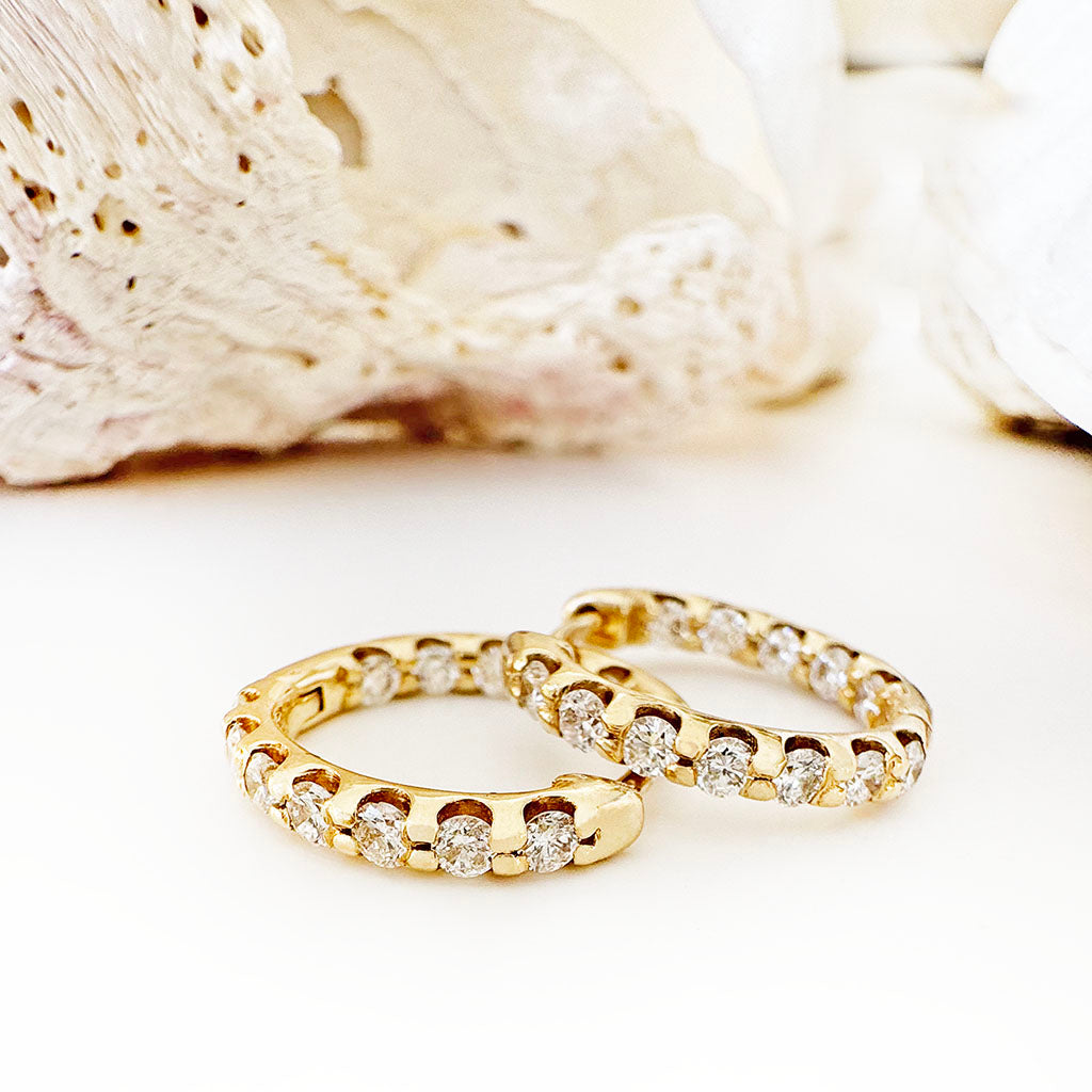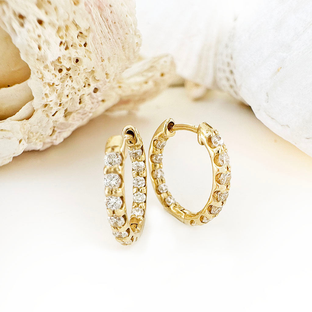 There are times when you want to be bold, and times when the art of subtlety is far more effective. This petite pair of diamond and yellow gold hoop earrings, masterfully crafted to exhibit the beauty of each individual diamond, are an artful way to display your luxurious sense of style with elegance and grace.