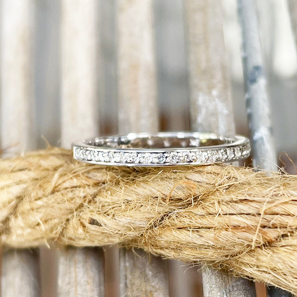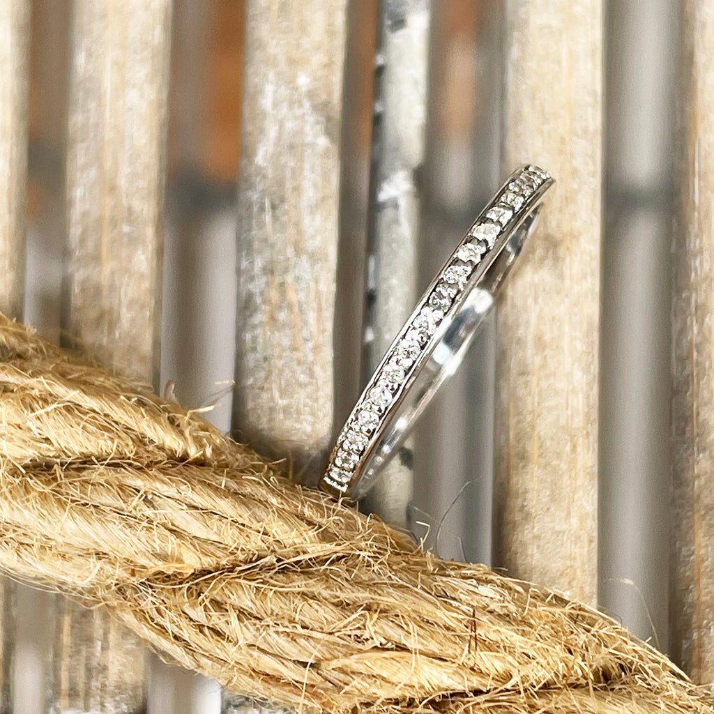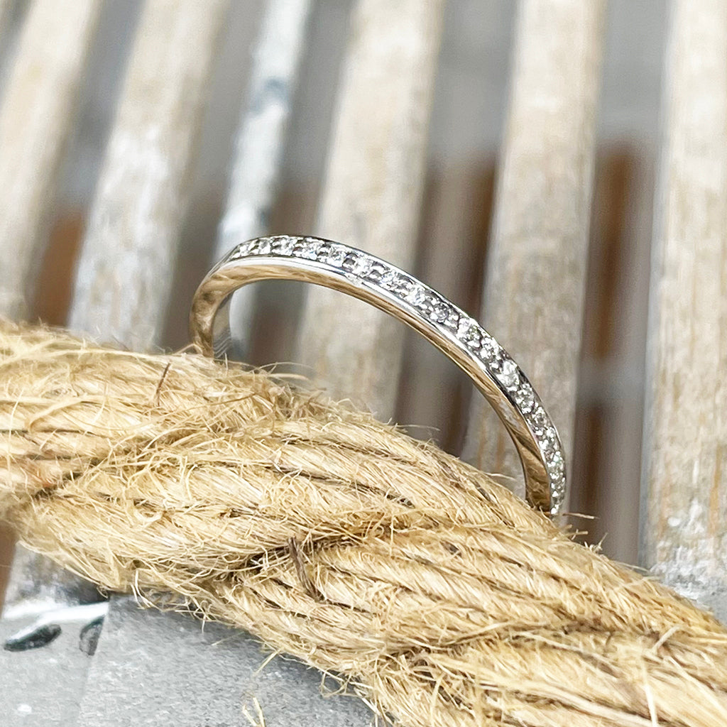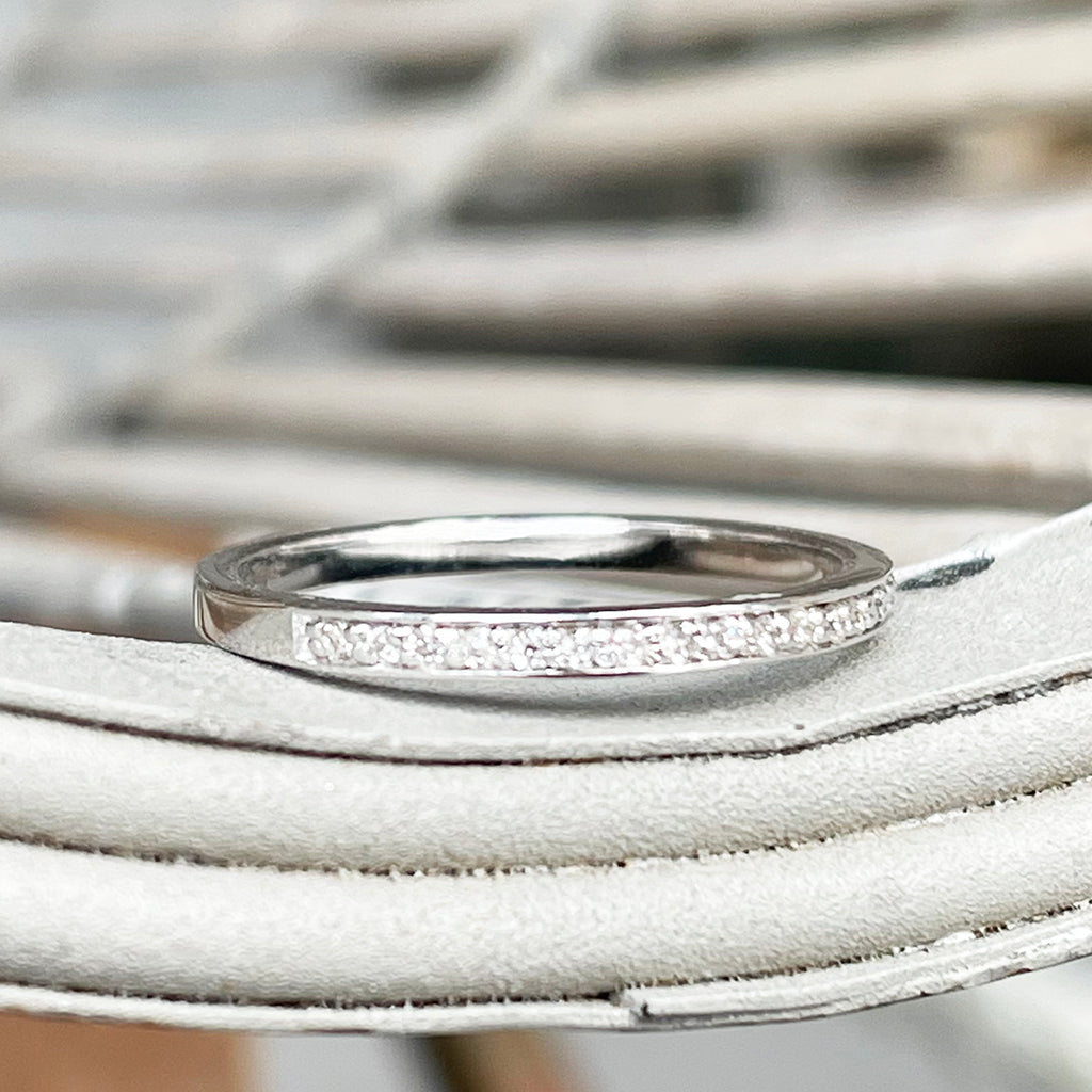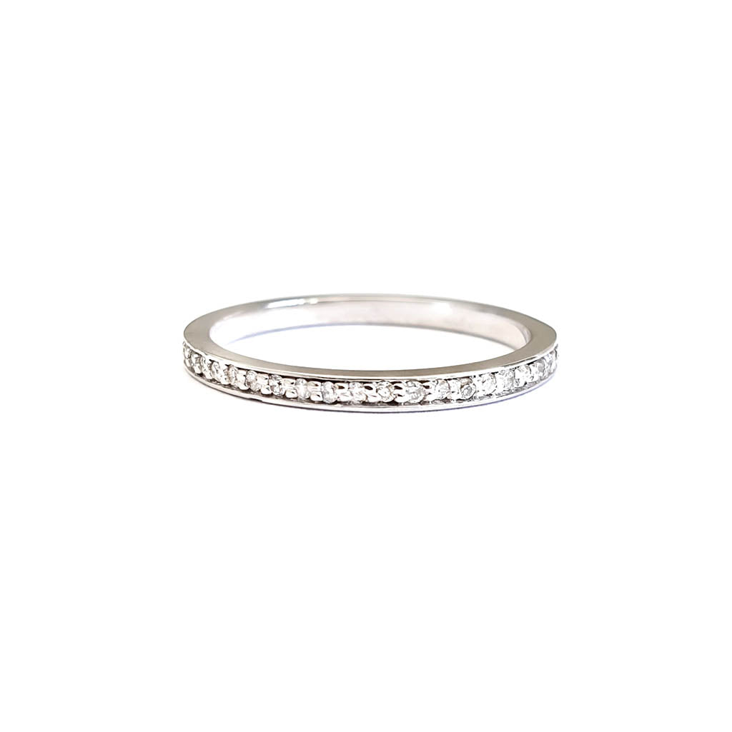 Elegance and fashion intersect in a sparkling half eternity diamond and white gold ring. The stones are prong set with skillful precision, giving the ring the illusion of infinite light play.