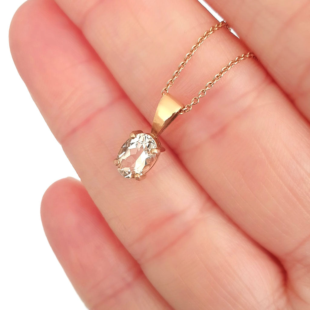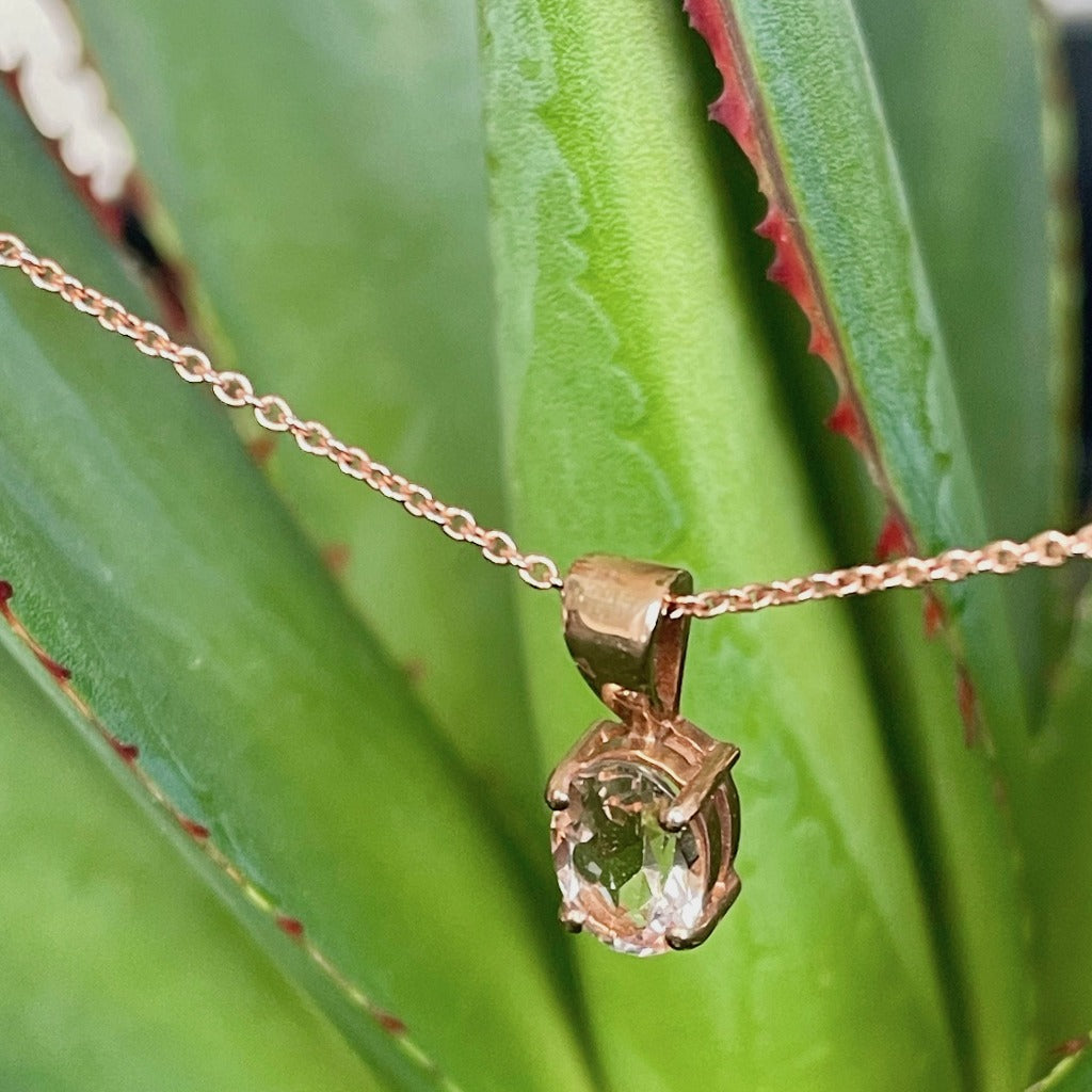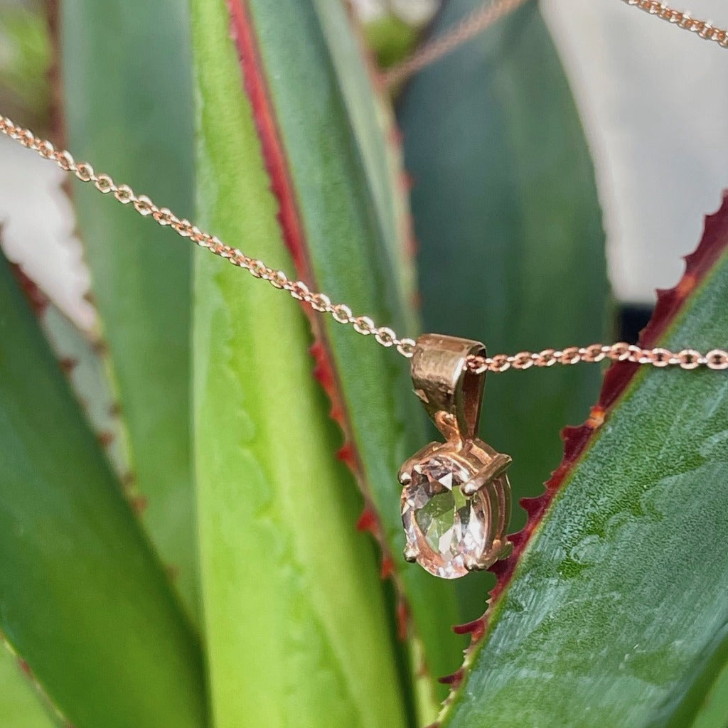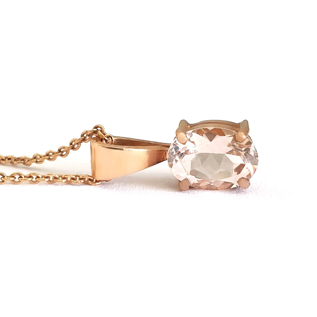 The romantic aura and vintage appeal of this morganite pendant lies in the classic oval cut of the stone placed in finely-crafted claw setting. The crystalline blush of the stone is balanced by the warm solidity of the rose gold bale, each complementing the other with tantalising delicacy.