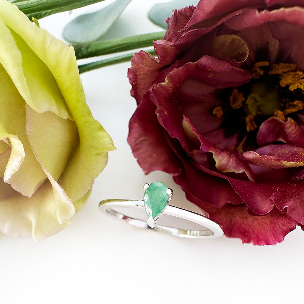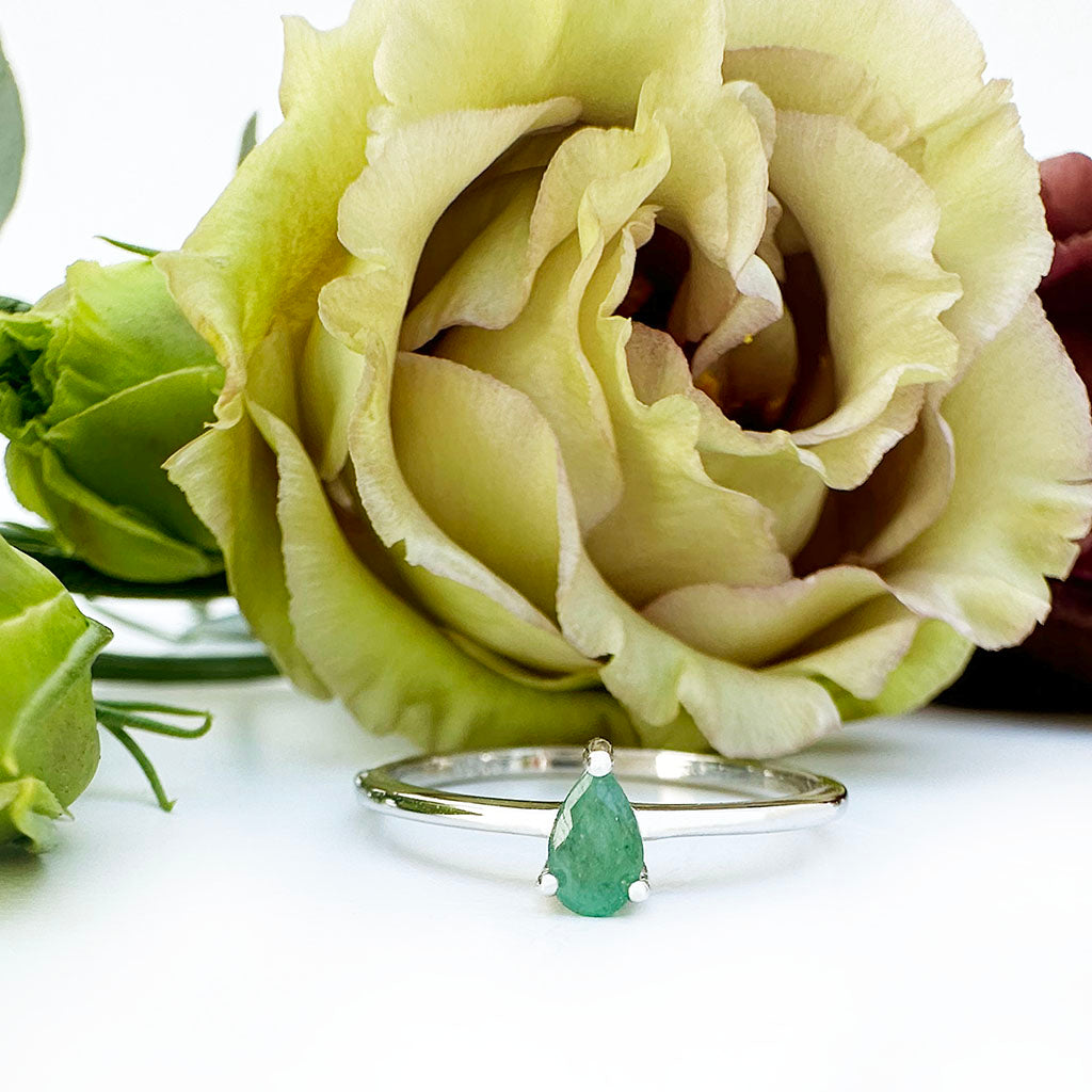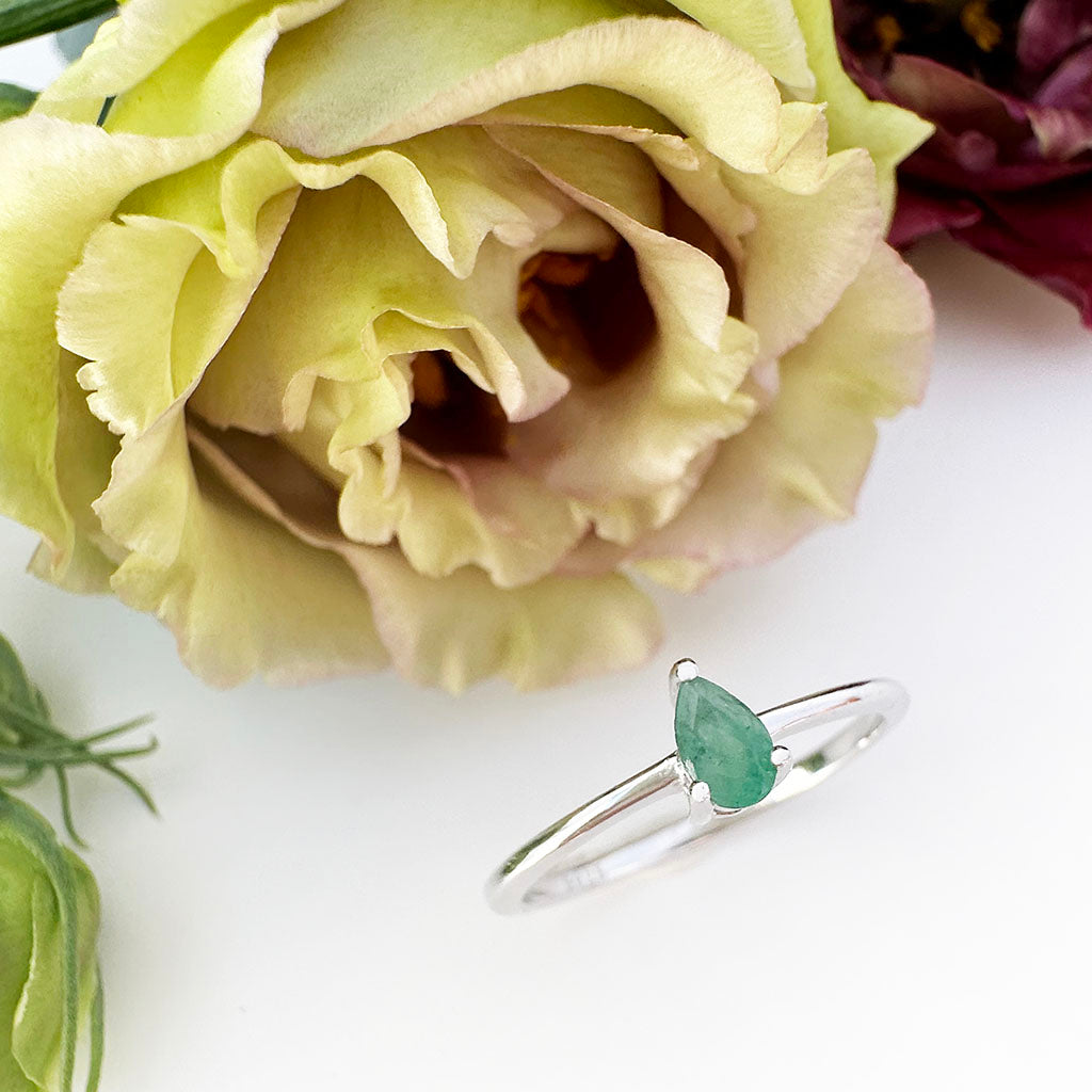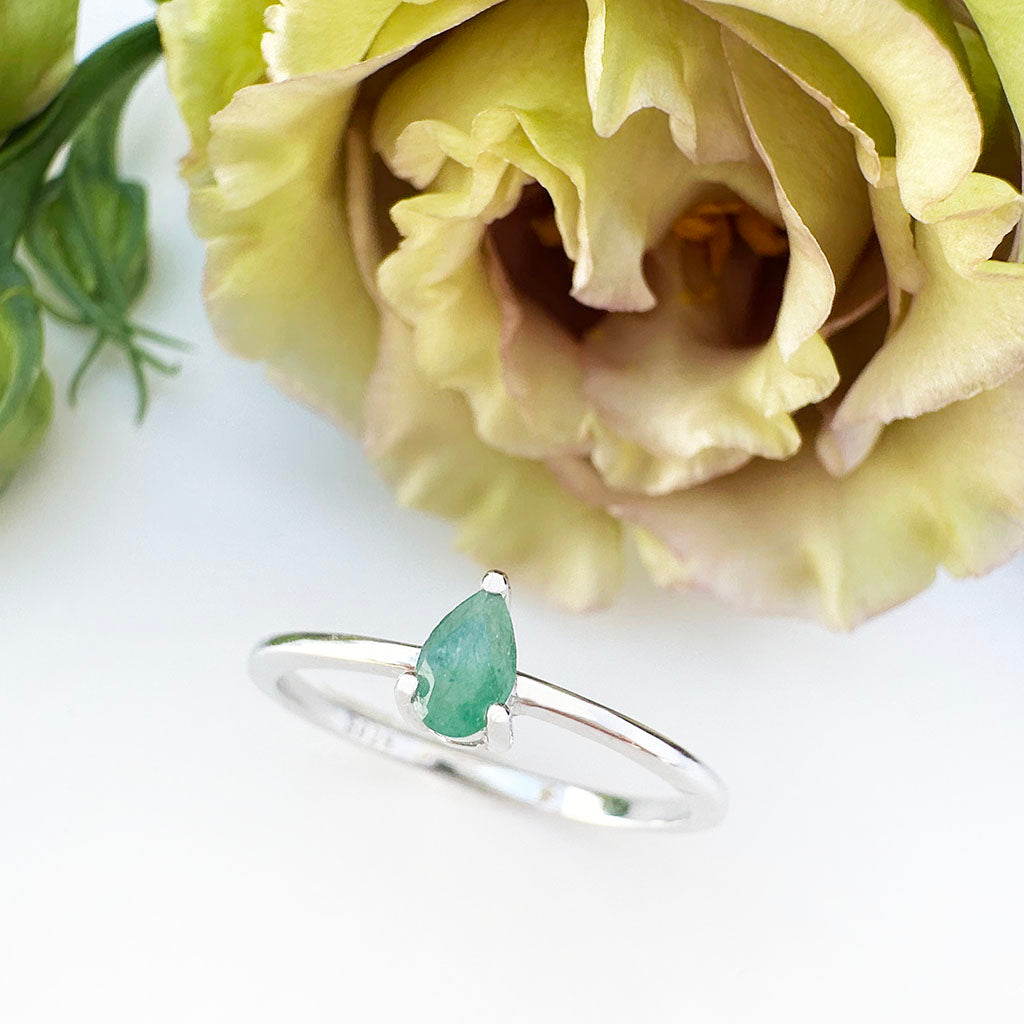 Petite Silver Thin Pear Cut Emerald Ring