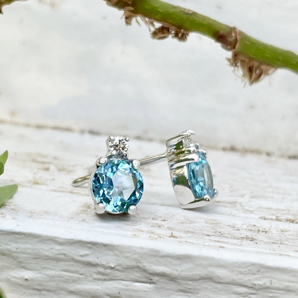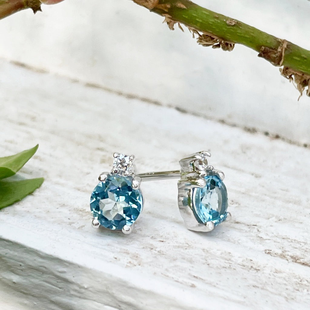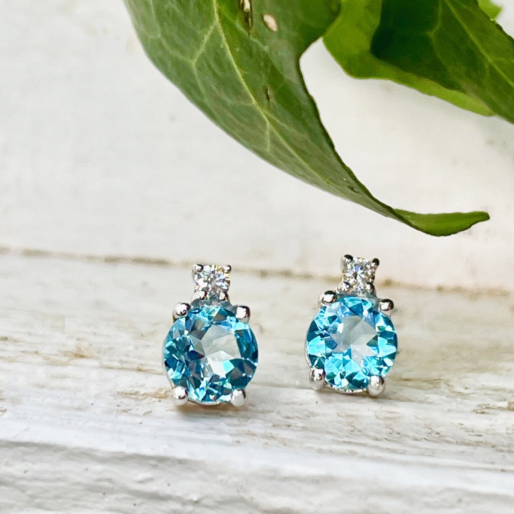 Gemstone studs add a pop of gorgeous glam to your look. These blue beauties are a true expression of fire energy to rock your summer style featuring intense, faceted round topaz accented by petite diamonds in gleaming white gold.