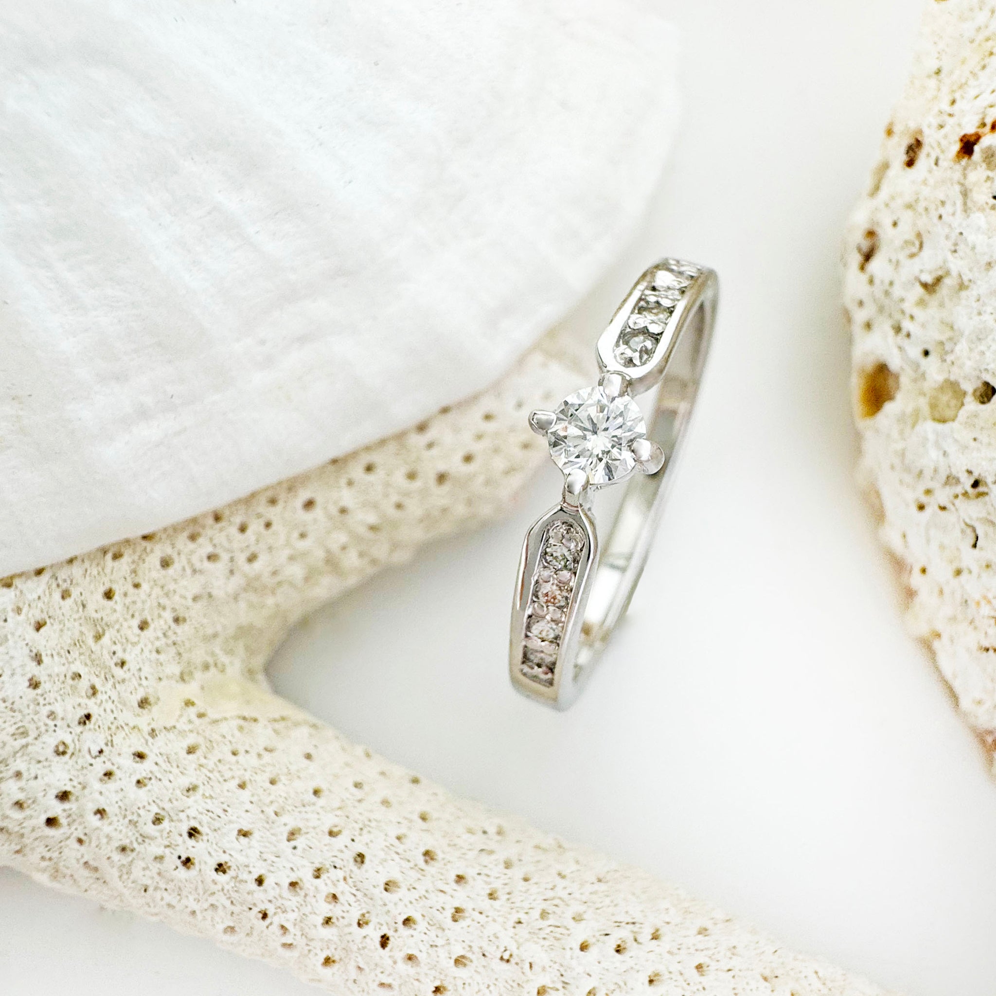 Exquisite elegance for delicate fingers, the central sparkling white diamond creates a star-like beauty in this ephemeral ring. Four gold claws hold the centre diamond slightly apart from the ladder of further sparkling diamonds in the ring's shoulders, an effect  accenting its celestial charm. This divine ring is a masterpiece in miniature.