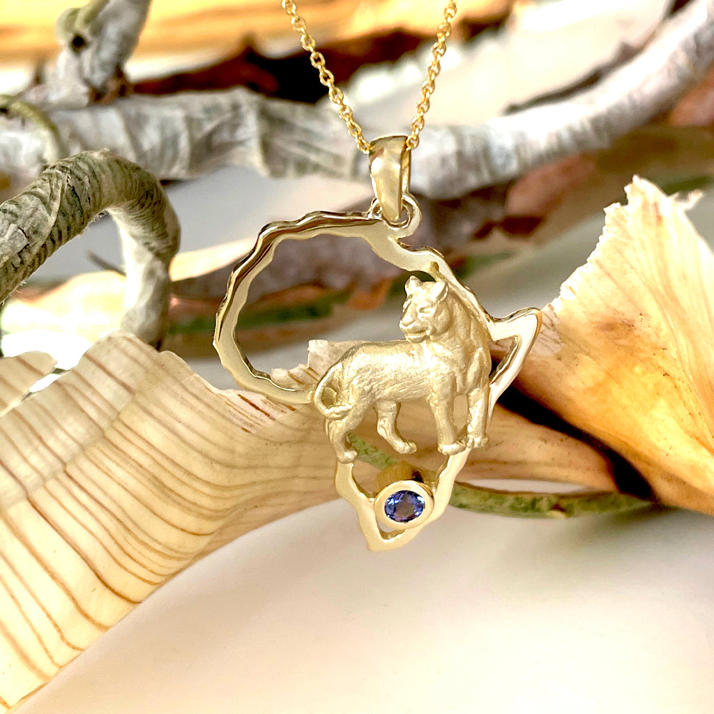 Embrace the captivating spirit of Africa with our stunning pendant featuring a majestic lioness at its centre. Symbolizing the essence of feminine strength and power, she stands proudly within a fluid yellow gold outline of the continent. The pendant is accented with an exquisite bezel-set tanzanite, adding a touch of brilliance and allure.
