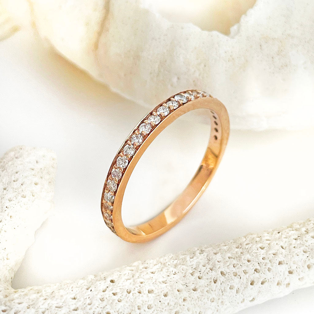 25 dazzling diamonds are bright cut and set into an elegant rose gold mount in this beautiful half eternity ring. As a wedding band, this stunning ring would be a luxurious complement a solitaire diamond engagement ring. But there's no need to wait on Mr or Mrs Right ... it's also the ideal treat yourself ring.