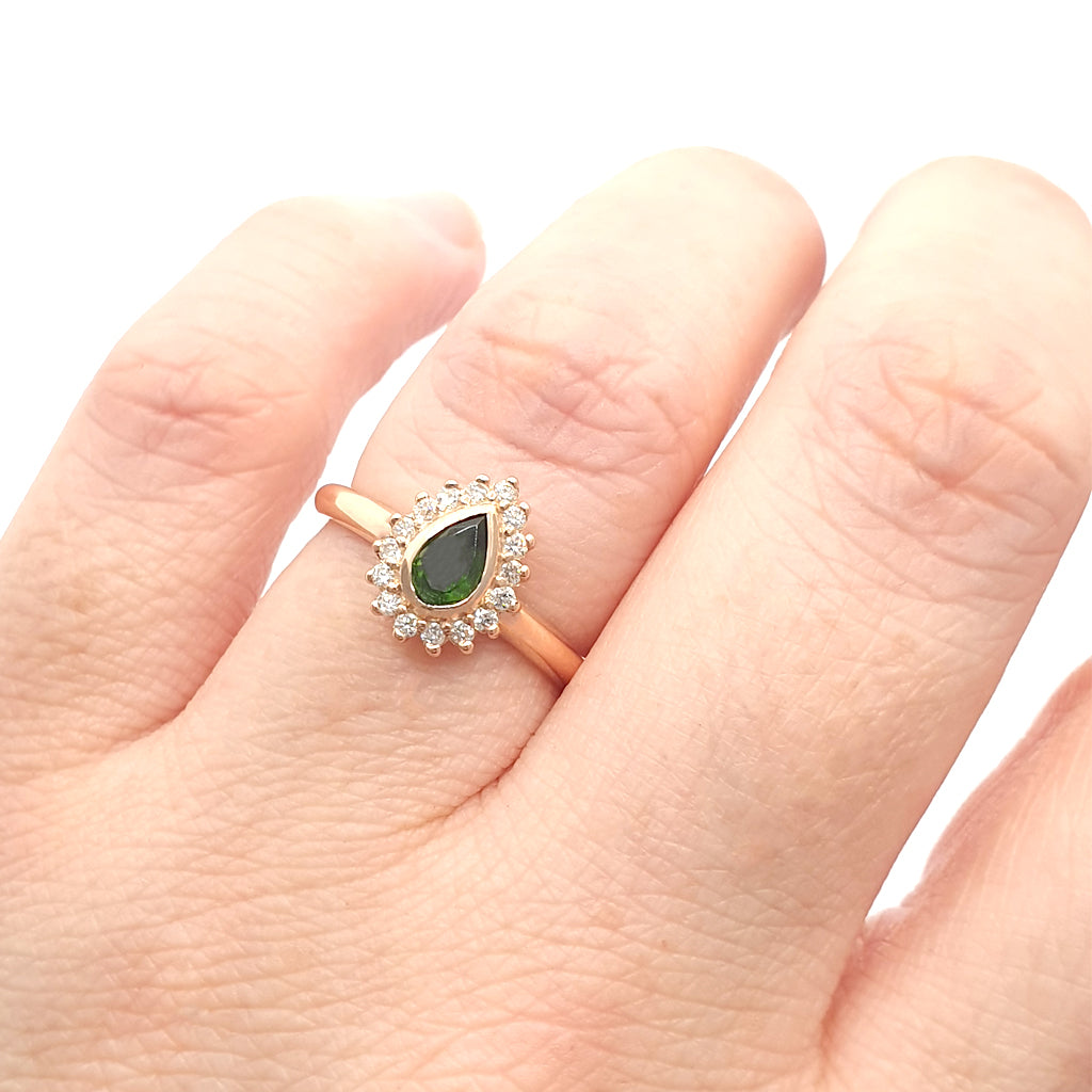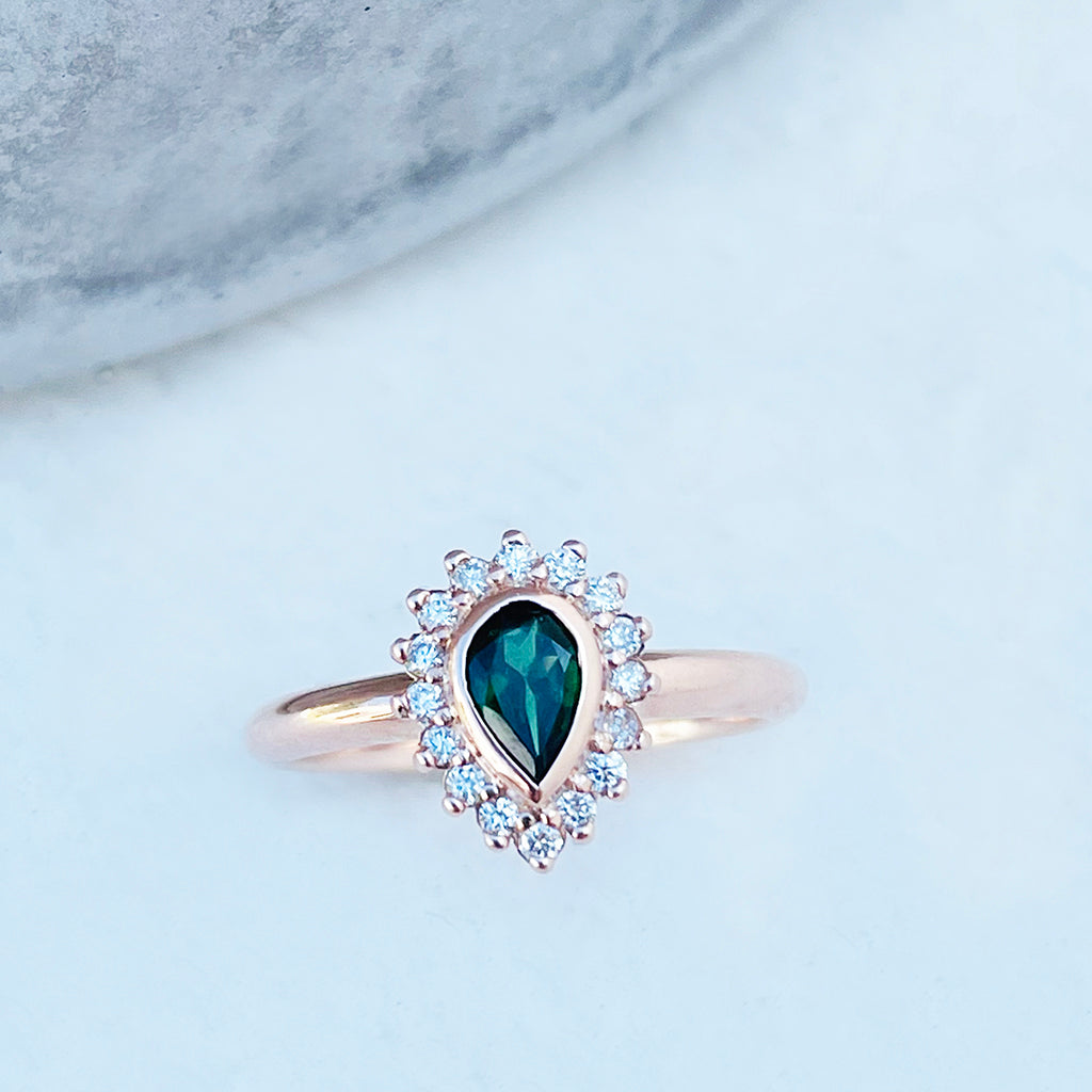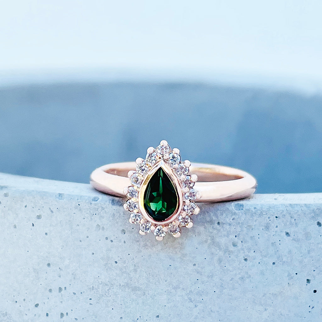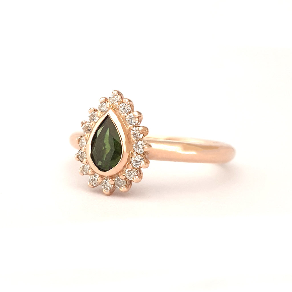 Radiant Pear Cut Green Tourmaline with Diamond Halo Ring