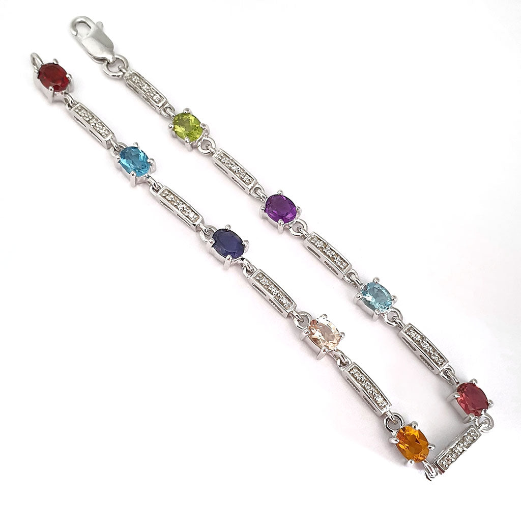 Rainbow sophistication meets diamond sparkle in a bracelet that plays with colour and light. The oval  faceted gemstones are separated by white gold bars set with pavé diamonds for a delicate colourful riff on the traditional tennis bracelet. The overall effect is one of intoxicating colour and exquisite style.