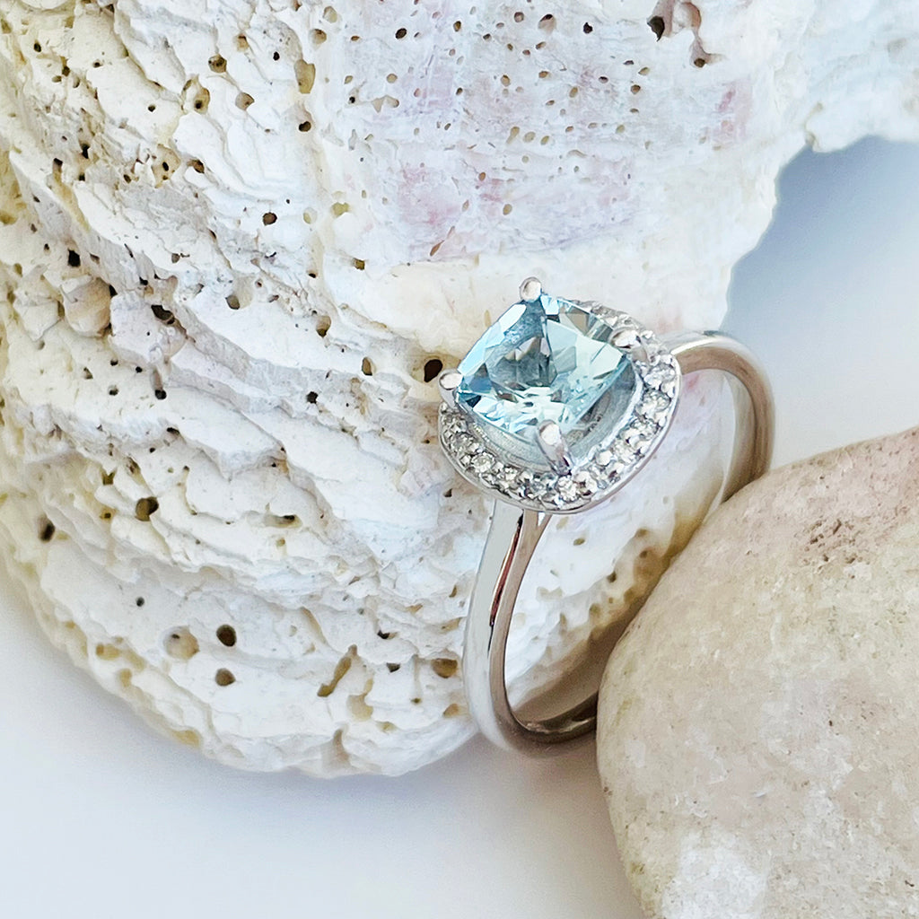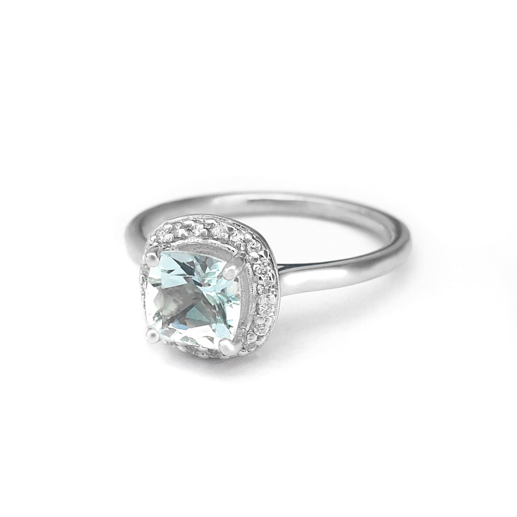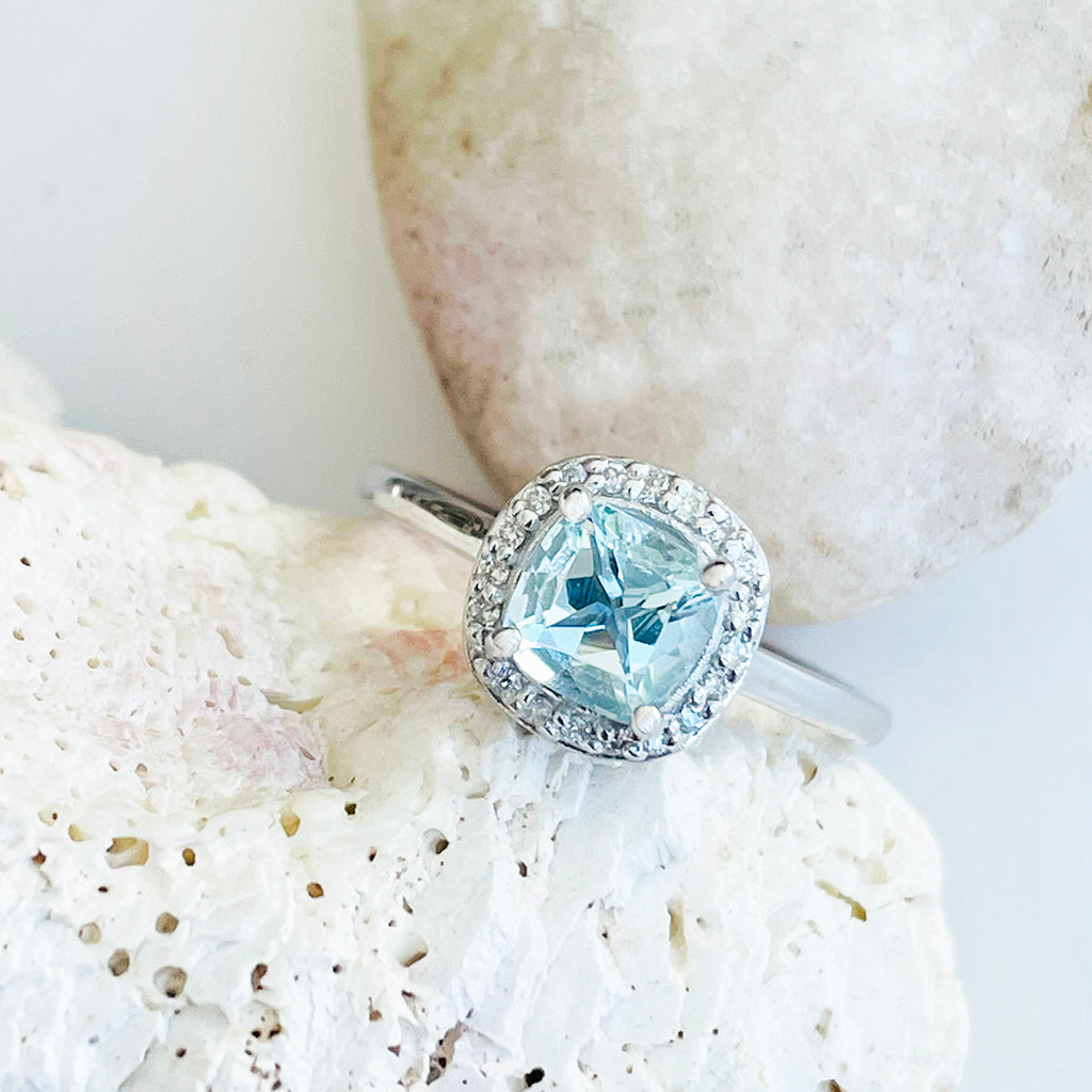 Raised Cushion Cut Aquamarine and Diamond Halo Ring