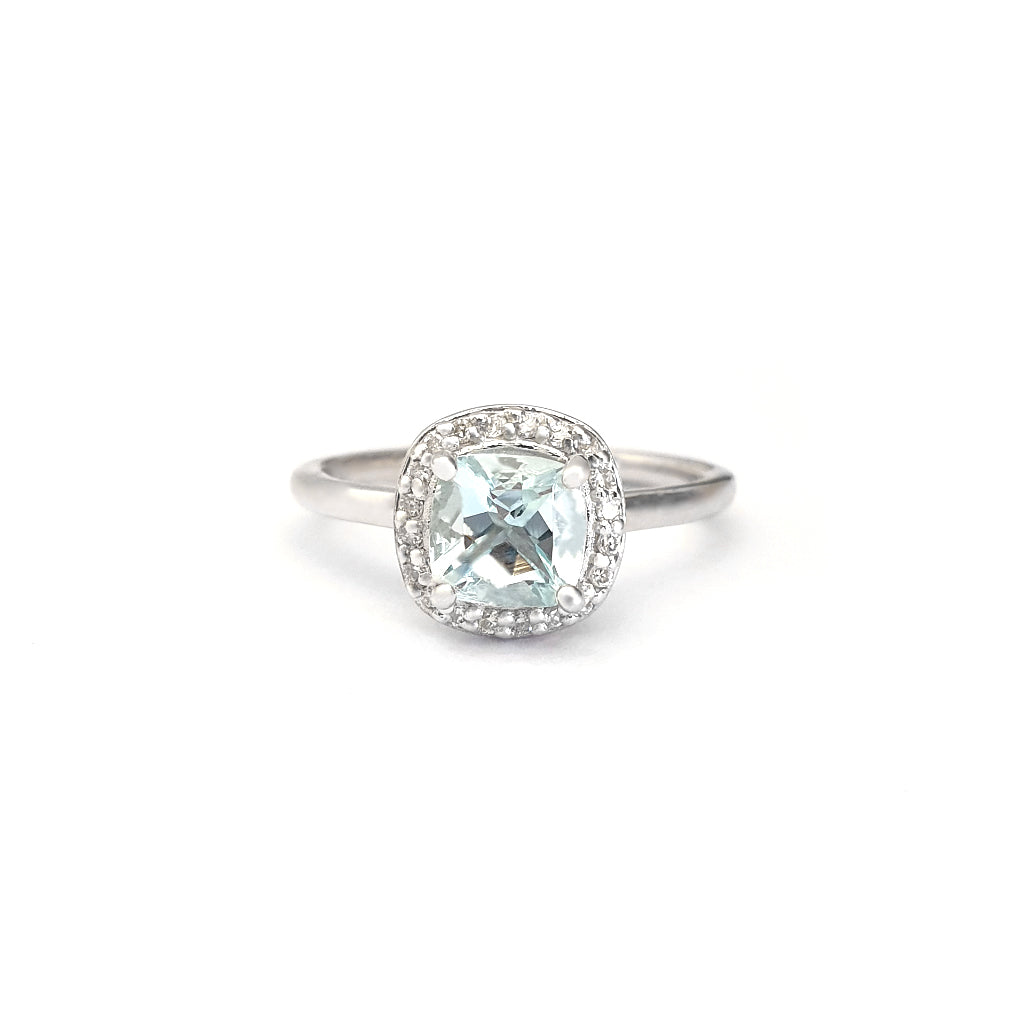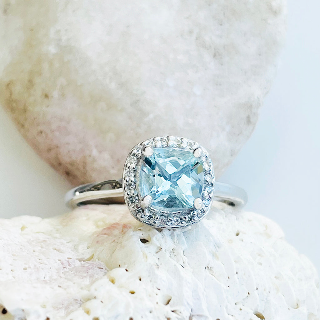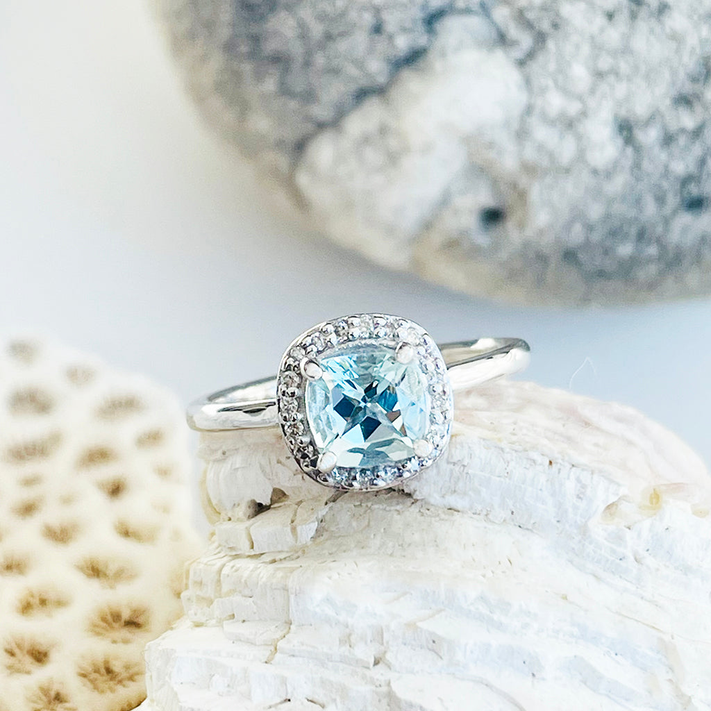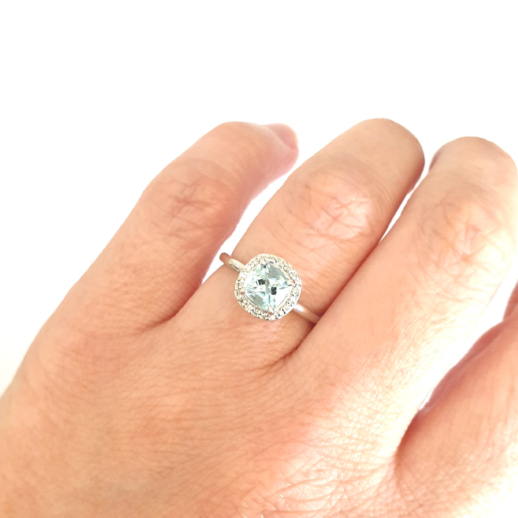 Raised Cushion Cut Aquamarine and Diamond Halo Ring
