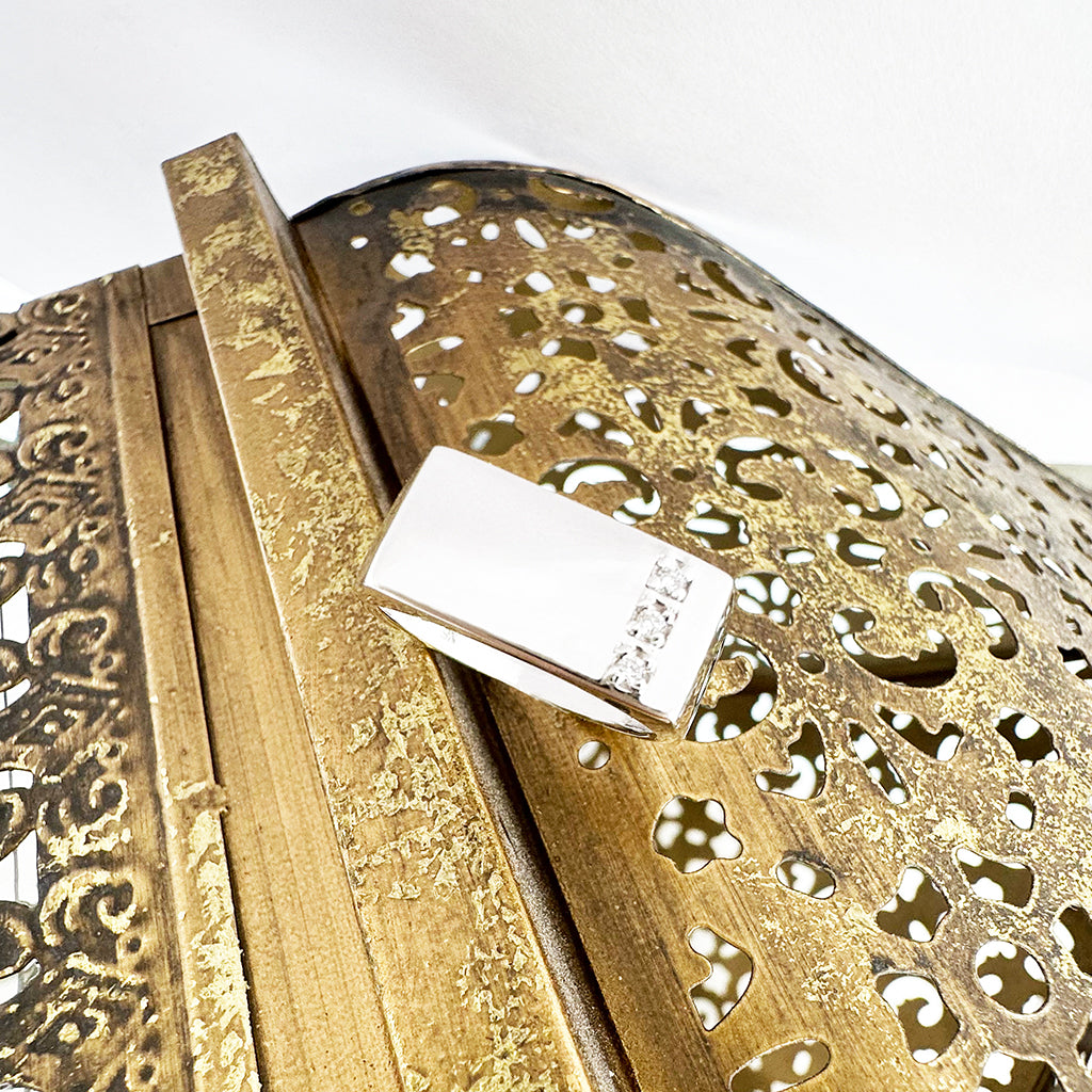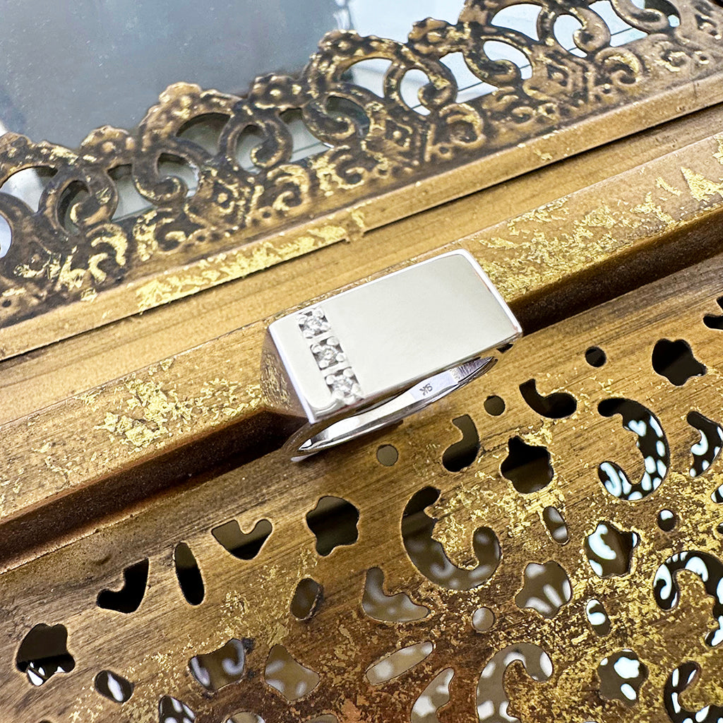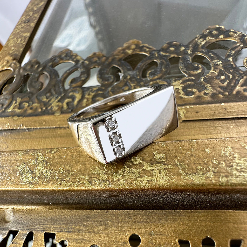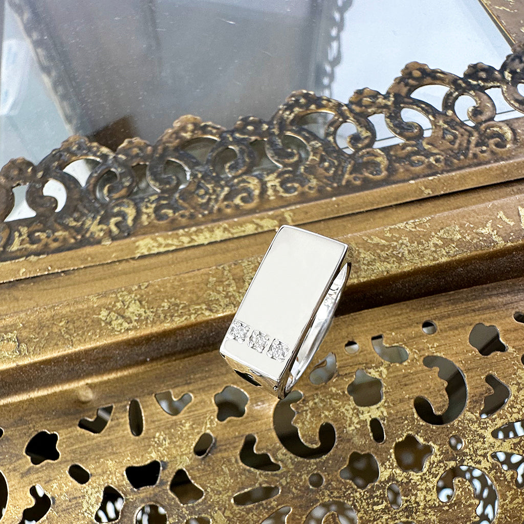 Rectangular White Gold Signet Ring with Three Diamond Stripe Detail