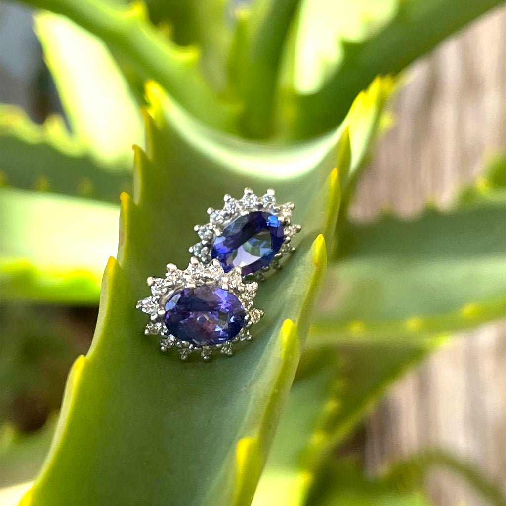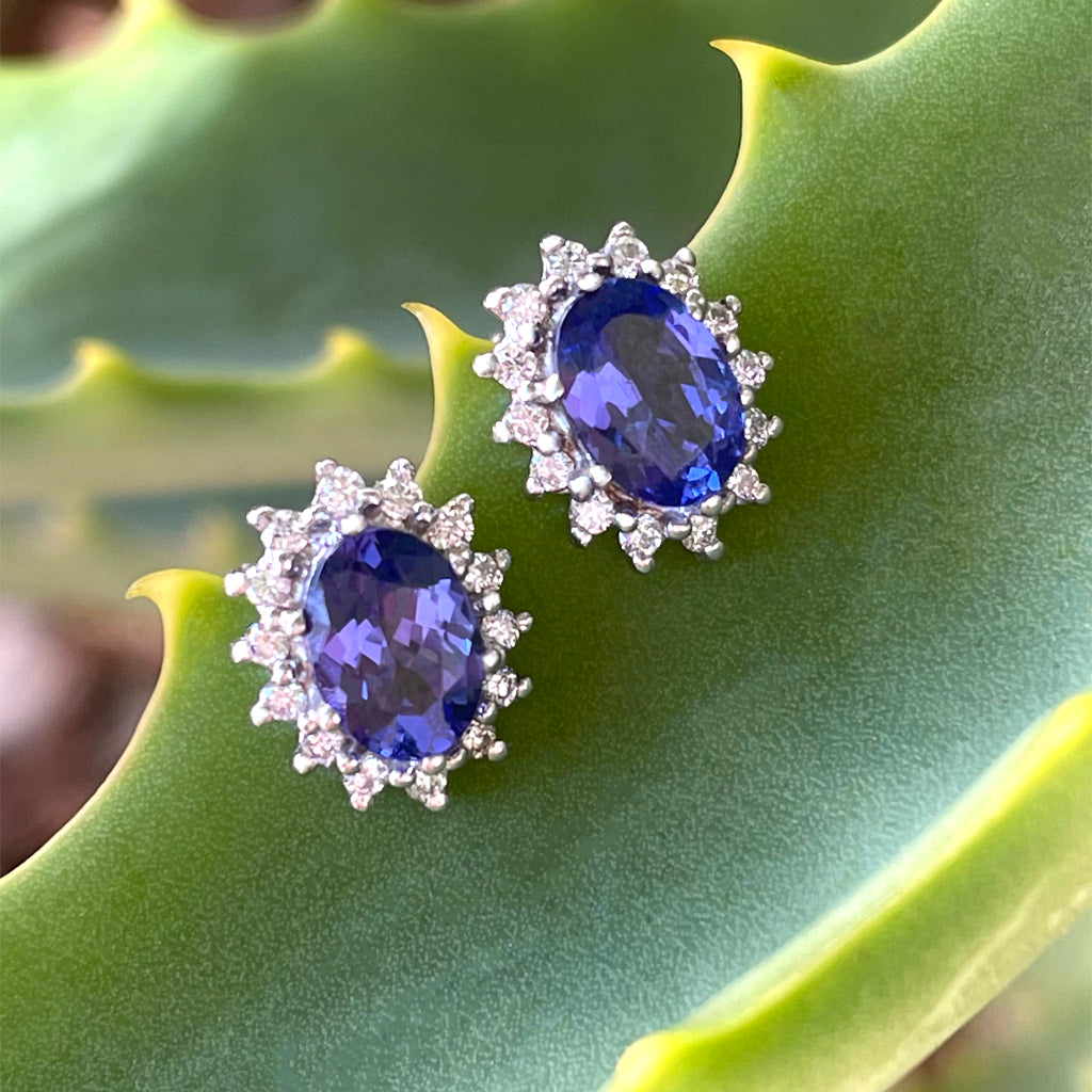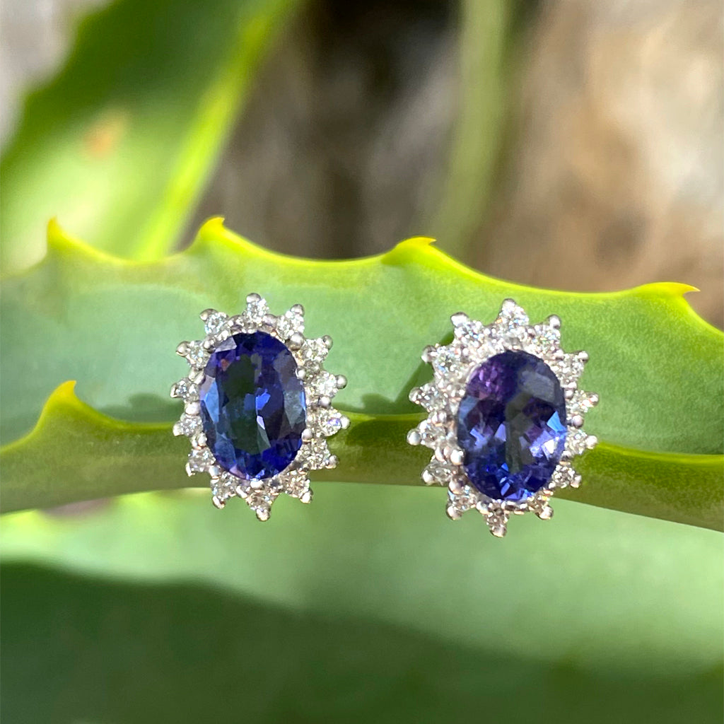 The passionate blue-violet hue of tanzanite draws the eye in these lavish studs crafted in luxurious white gold. A regal halo of sparking white diamonds surround the exquisite gemstones in a nod to the opulence of royal adornments through the ages.