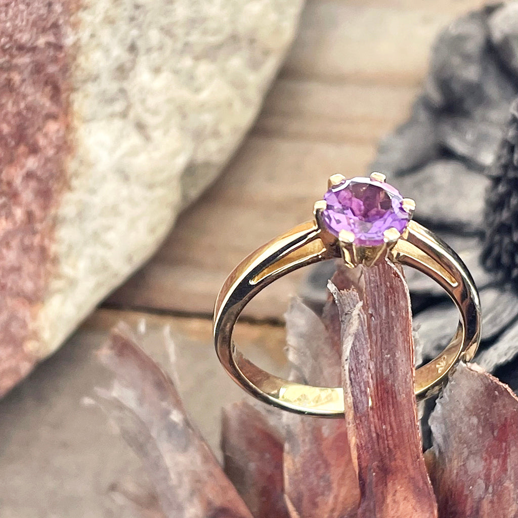Amethyst, the most regal of the quartz gemstones displays an exquisite tonal range in this incredible solitaire ring. The faceted round amethyst is held securely by six claws, which give the design a symmetry and sense of circular infinity.