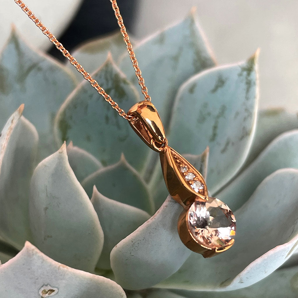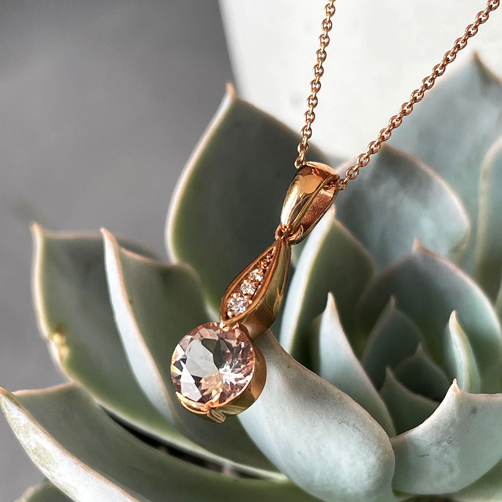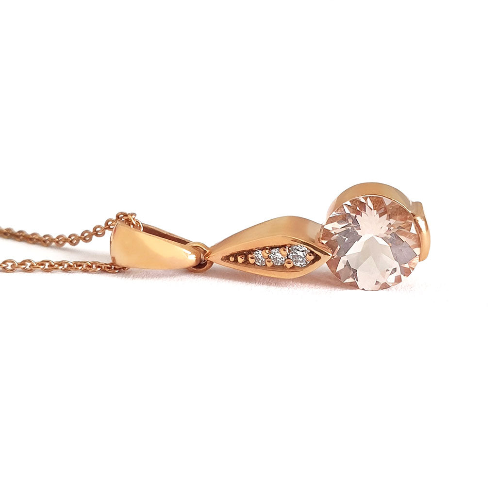 Rose Gold Bezel Set Morganite Pendant with Droplet Diamond Bale Highlight