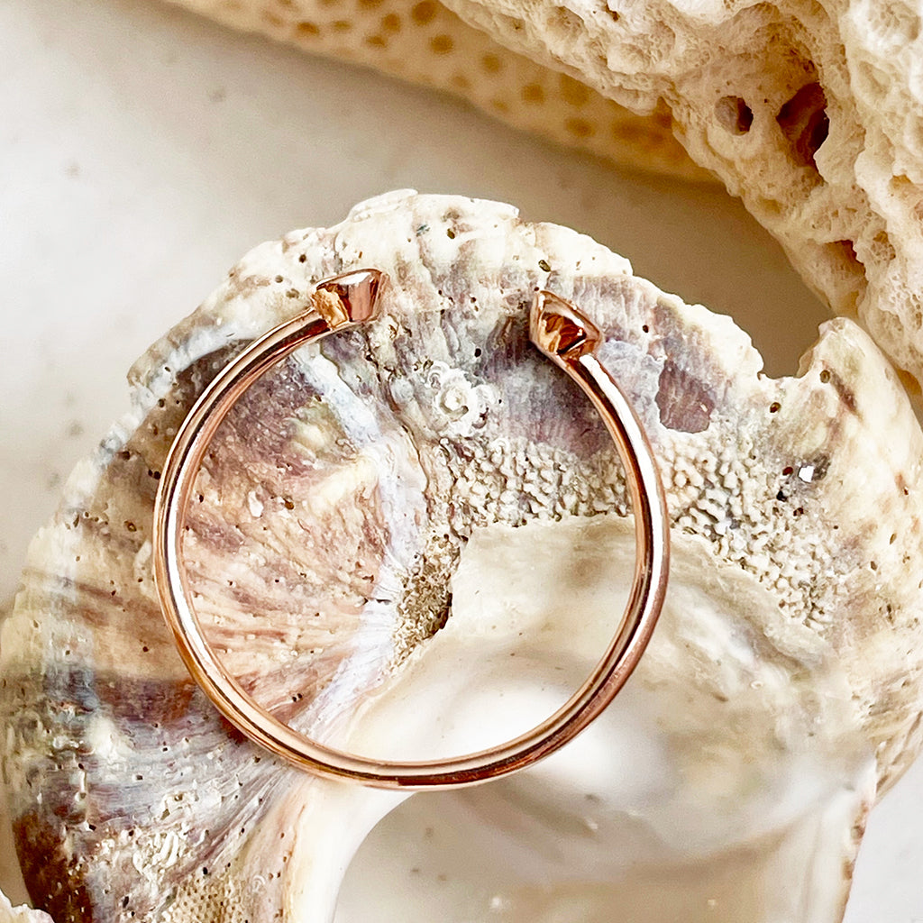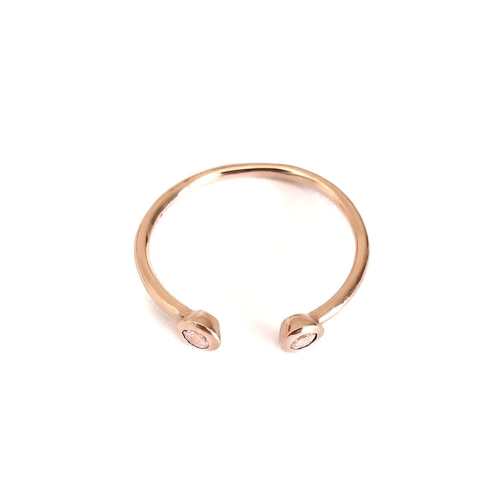 Two delicate bezel set morganites in an open ring design make this incredible stacking ring a unique addition to your collection. The blush tones of rose gold and morganite combine to create a warm, feminine mood that is deeply romantic.